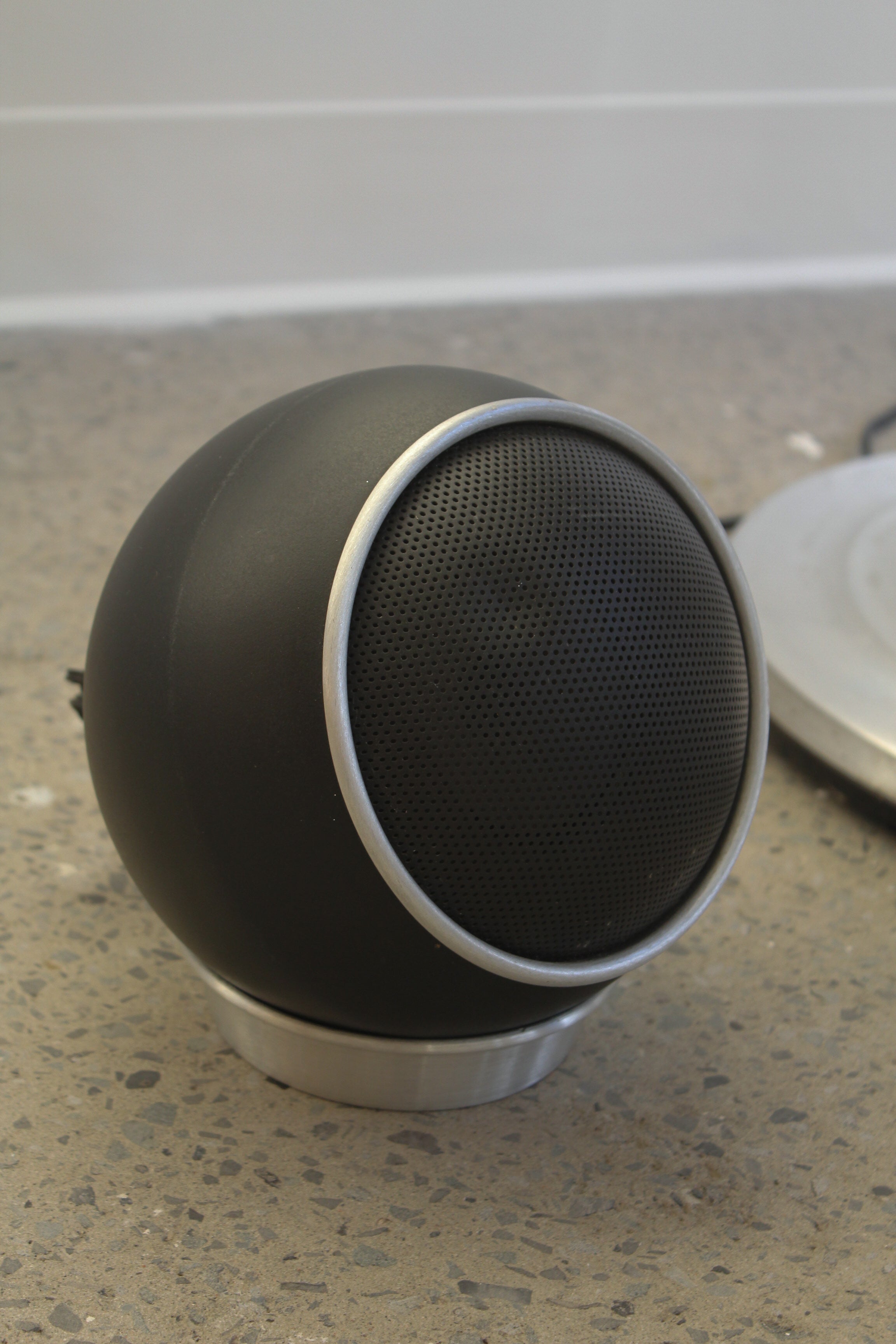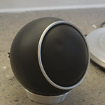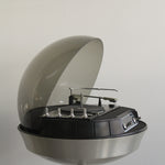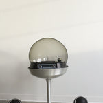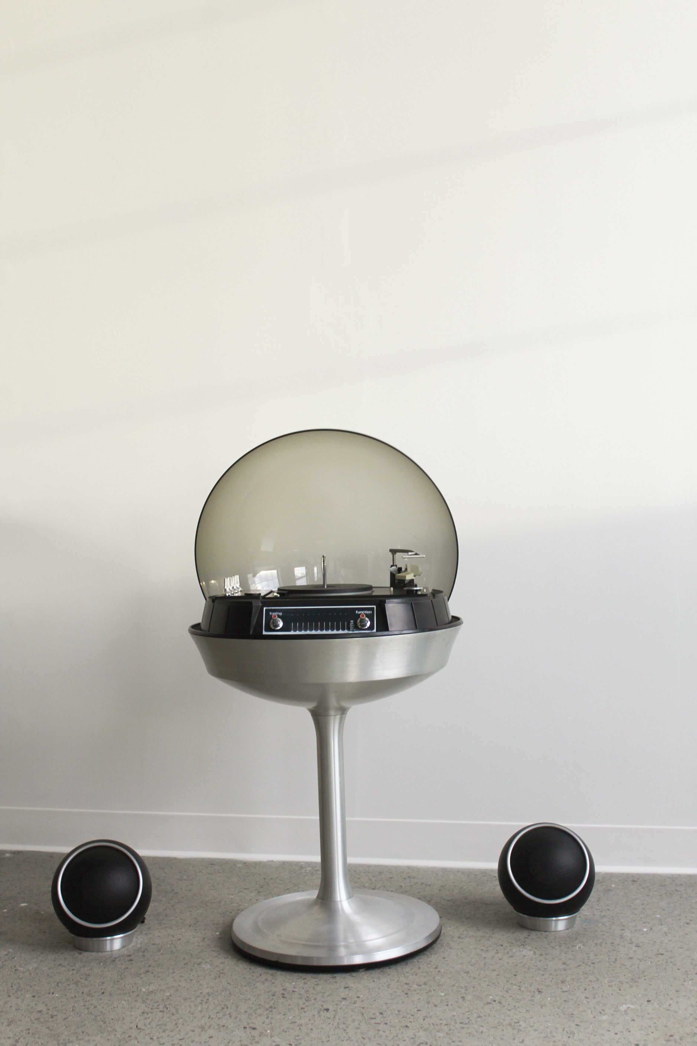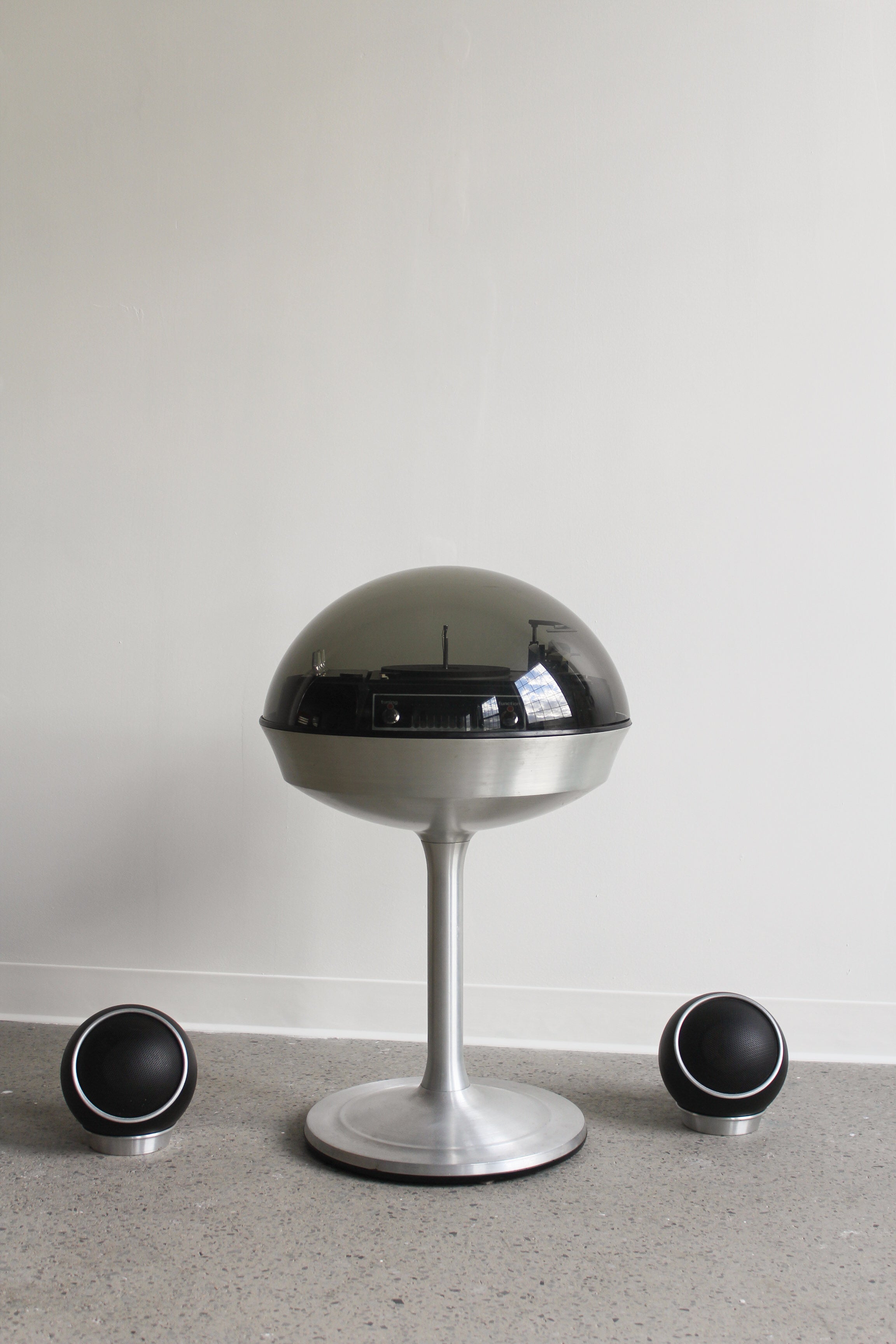 Table tournante Apollo 711 par Electrohome, années 1970. Pièce de collection rare avec dôme supérieur amovible en plexiglas fumé, base tulipe en aluminium et deux haut-parleurs sphériques. Lecteur vinyle automatique et radio AM/FM.