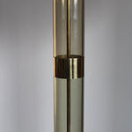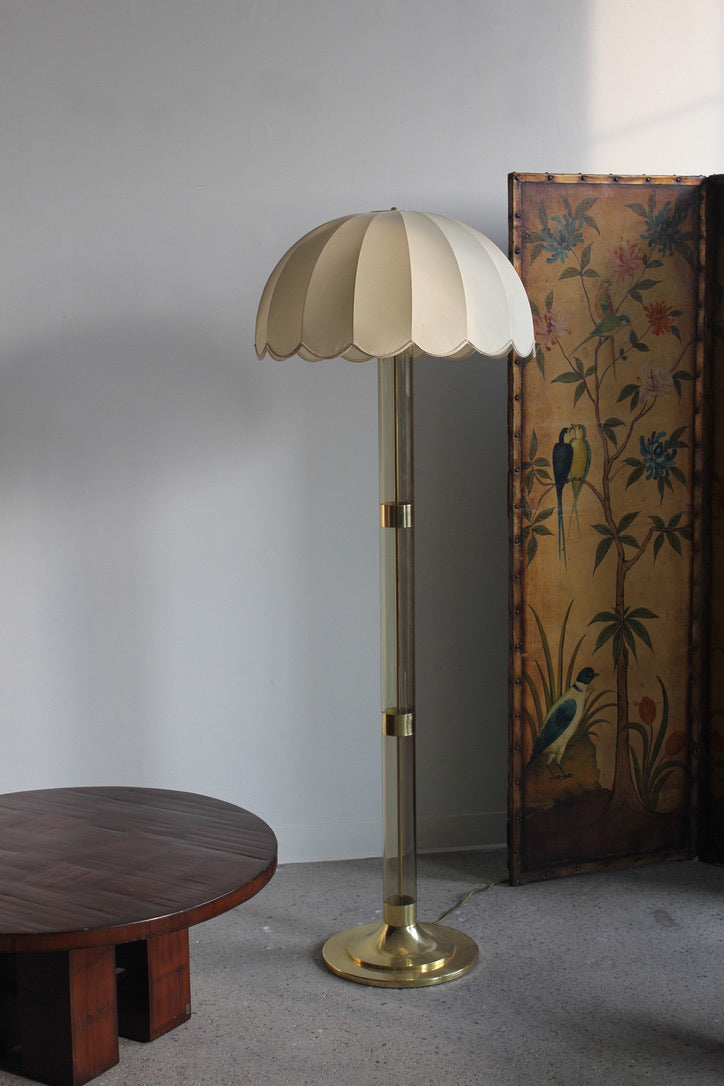 Lampe de sol Umbrella, fabriquée en Italie, années 1970. Tige et base en acrylique et laiton avec abat-jour en soie en forme de parapluie.