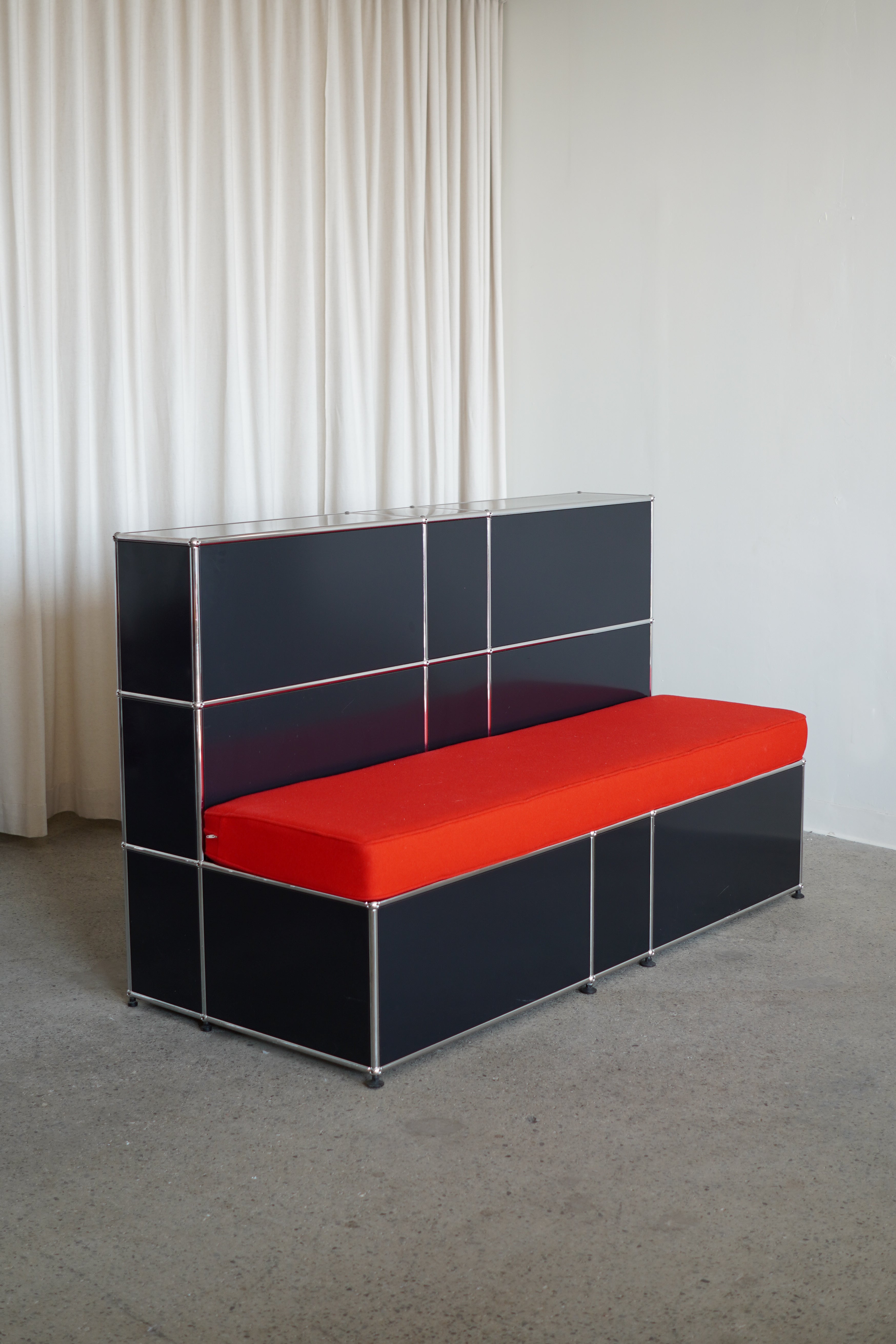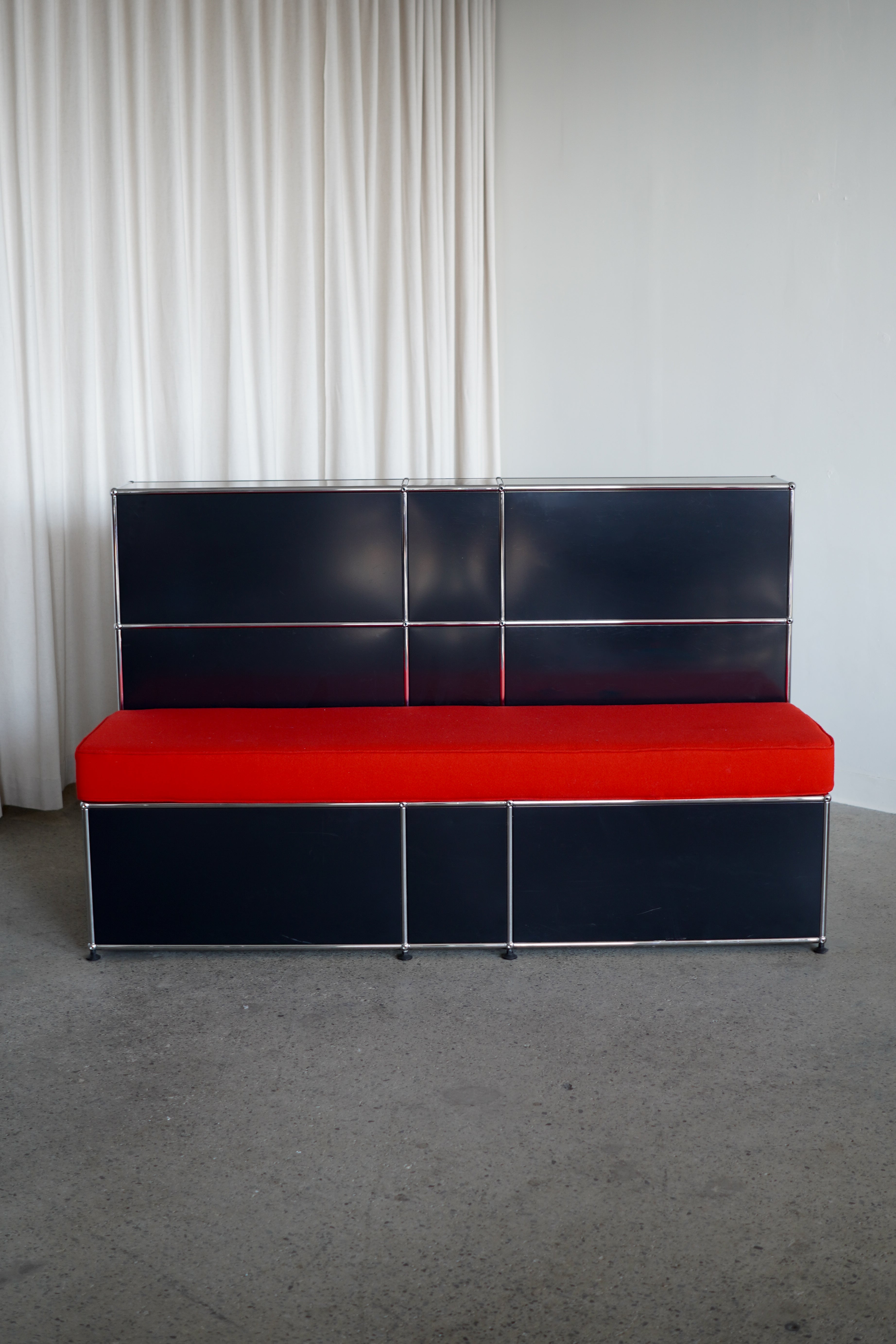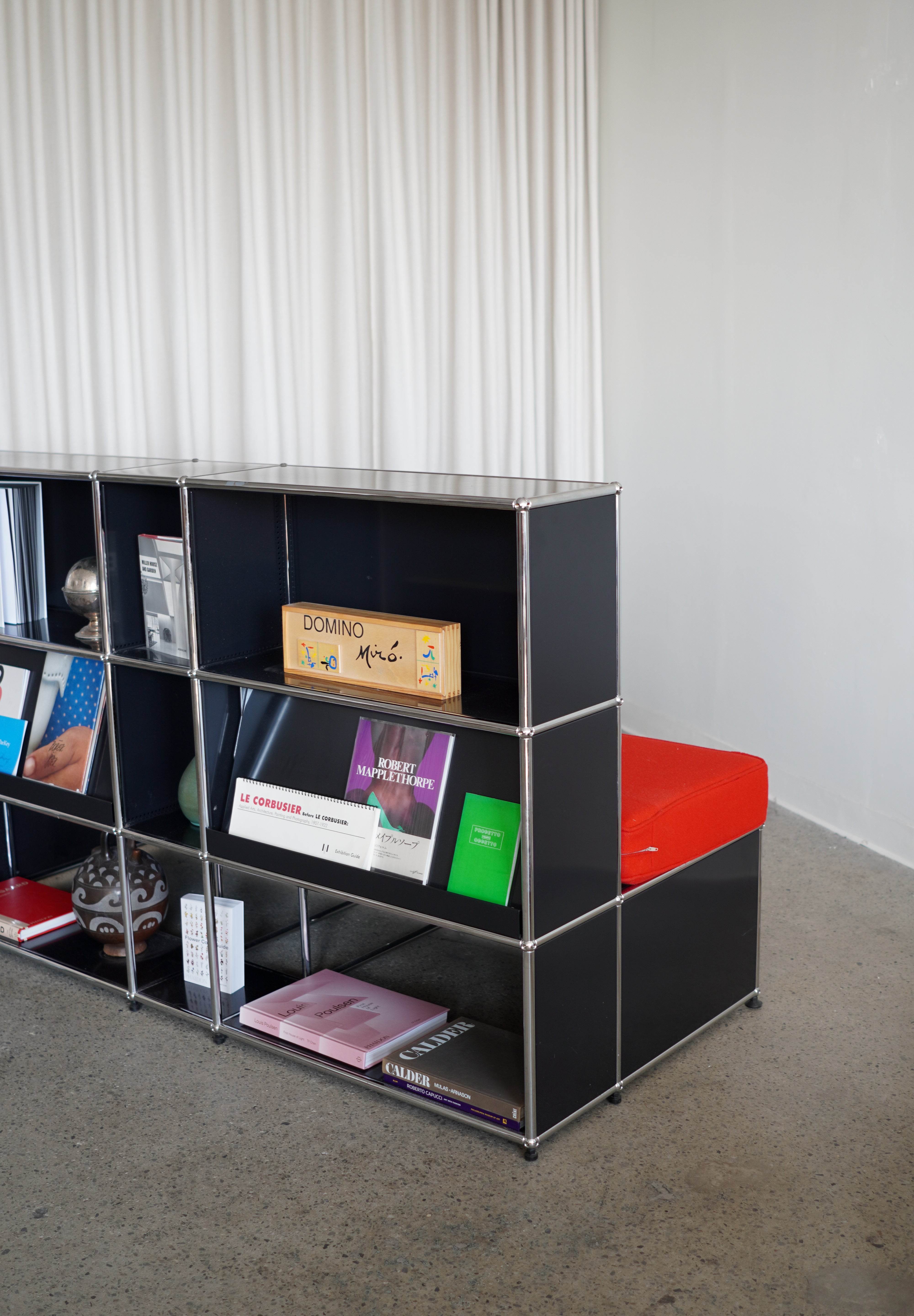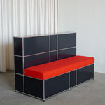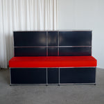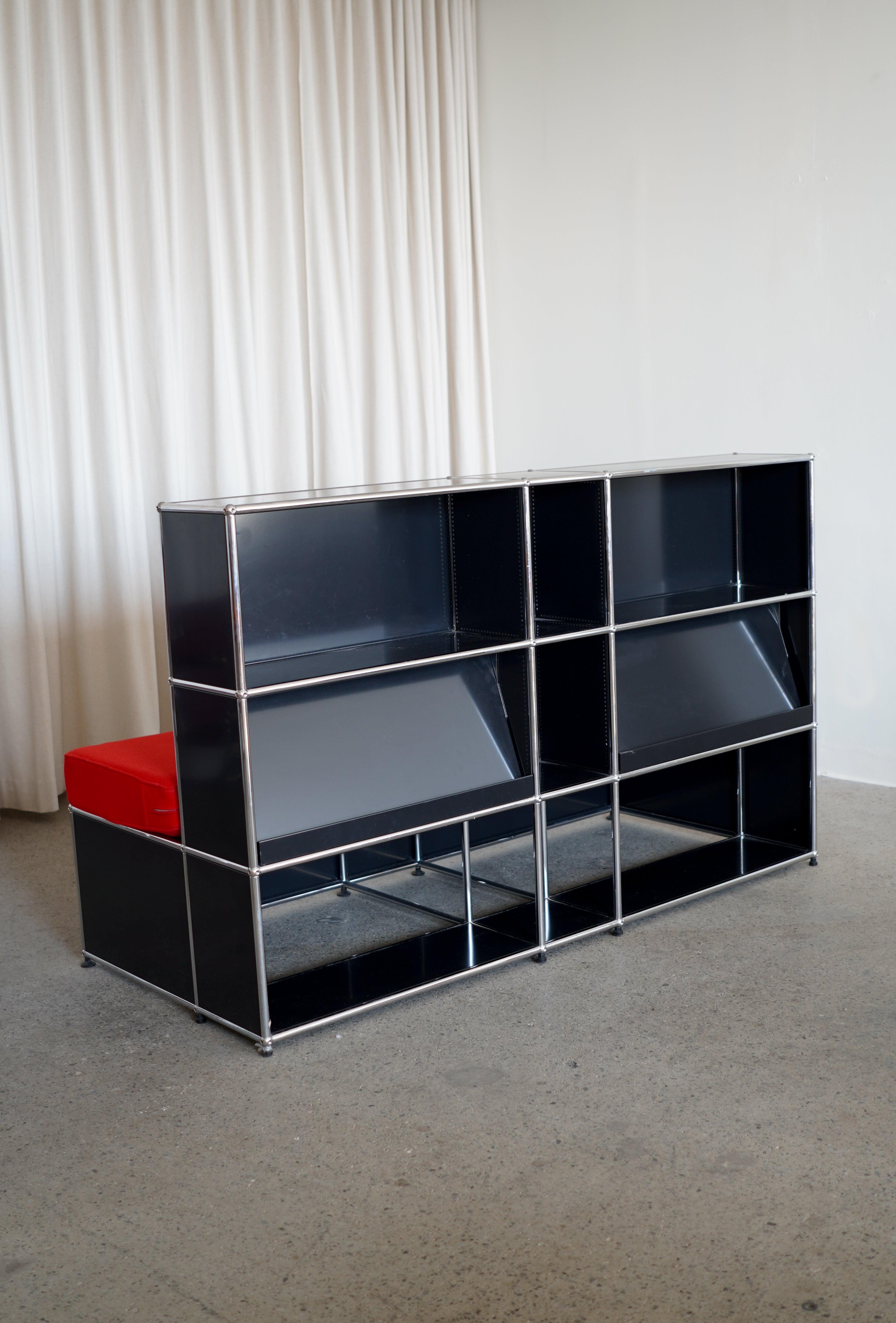 Banc avec rangement par Fritz Haller et Paul Schaerer, fabriqué en Suisse, années 2000. Structure en acier thermolaqué et tubes d’acier chromés. Meuble sur mesure composé d’un banc avec coussin rouge amovible d’un côté et d’une bibliothèque / rangement de l’autre. La partie rangement comprend 9 compartiments, dont 2 avec étagères pivotantes de présentation, parfaites pour exposer livres ou vinyles.