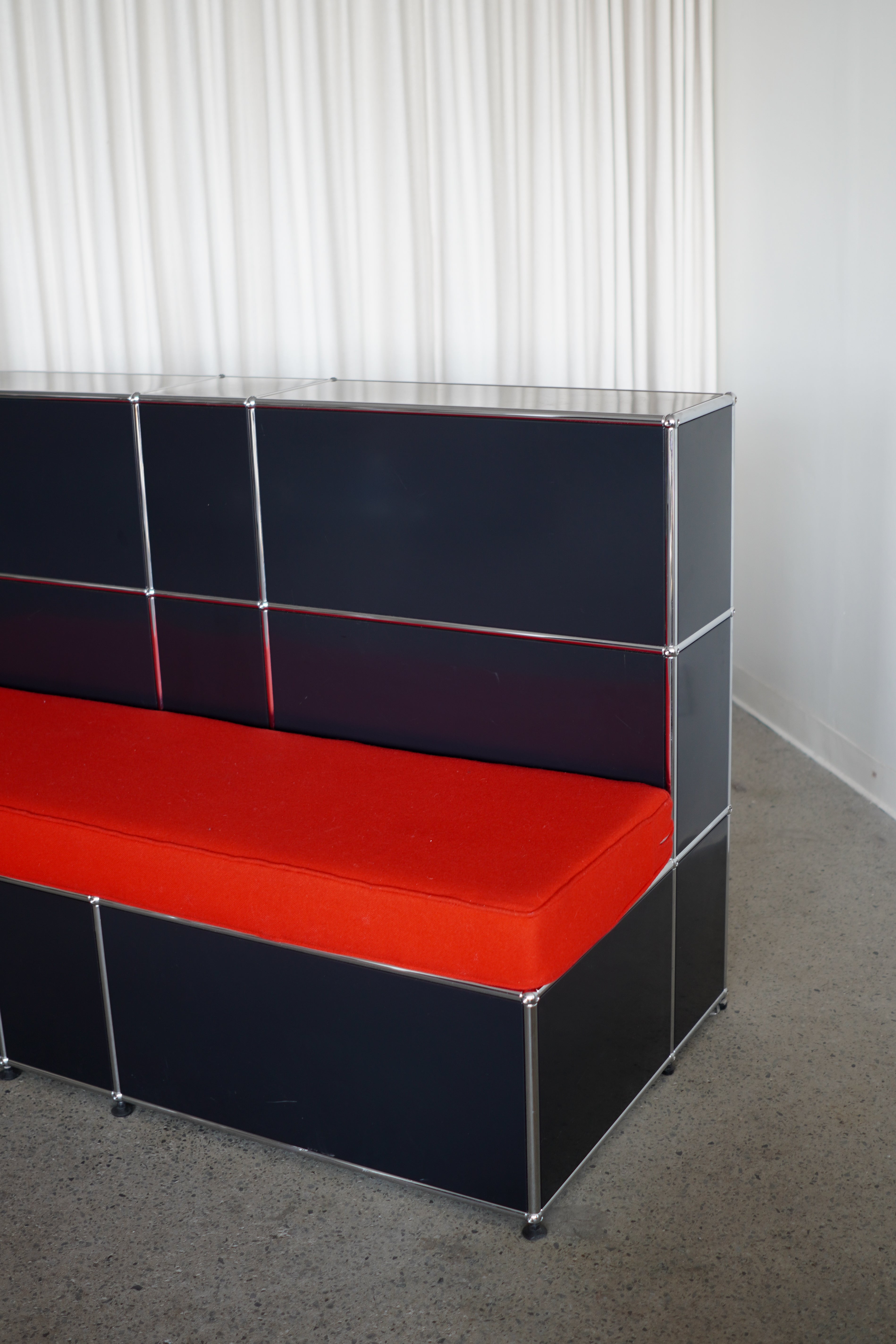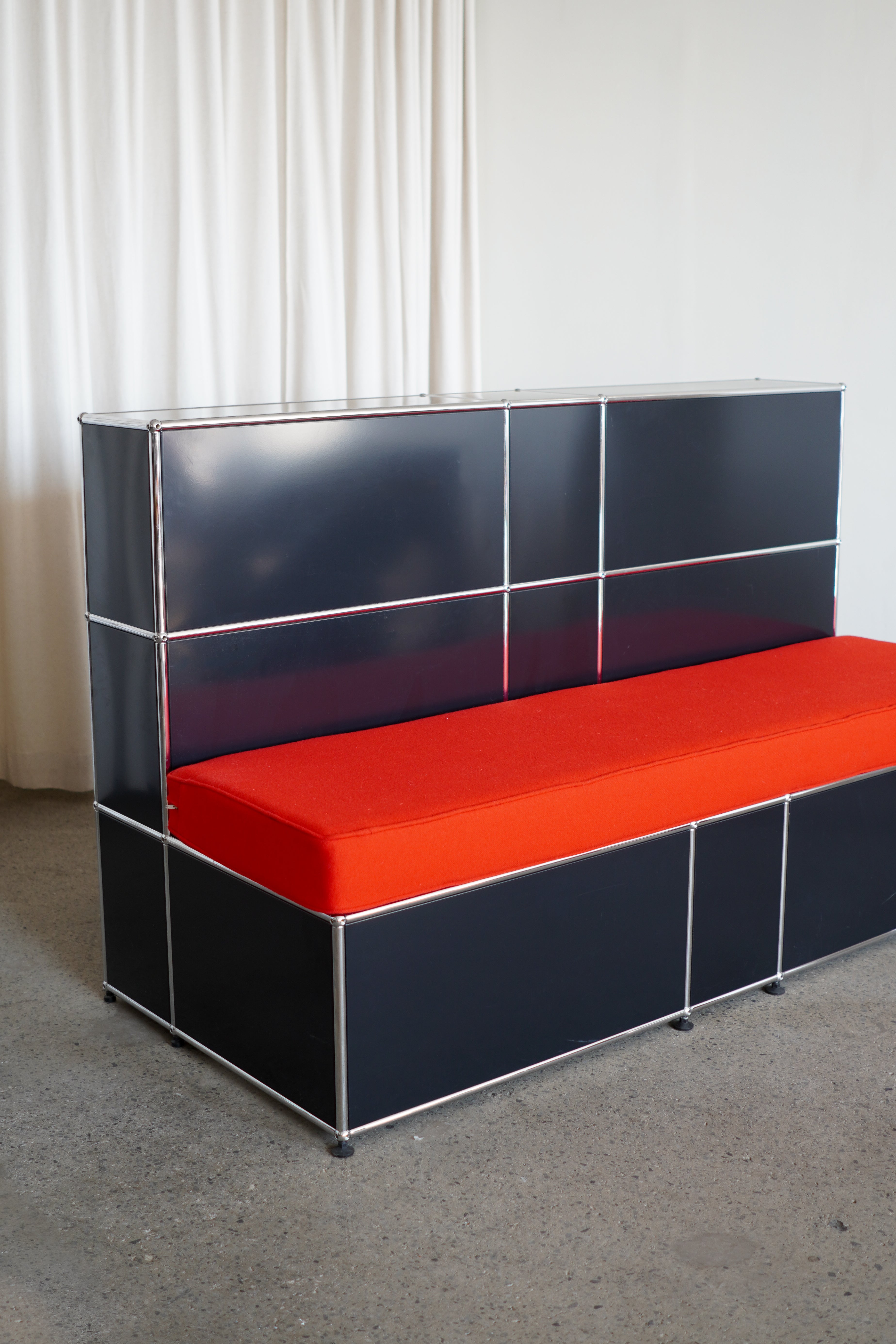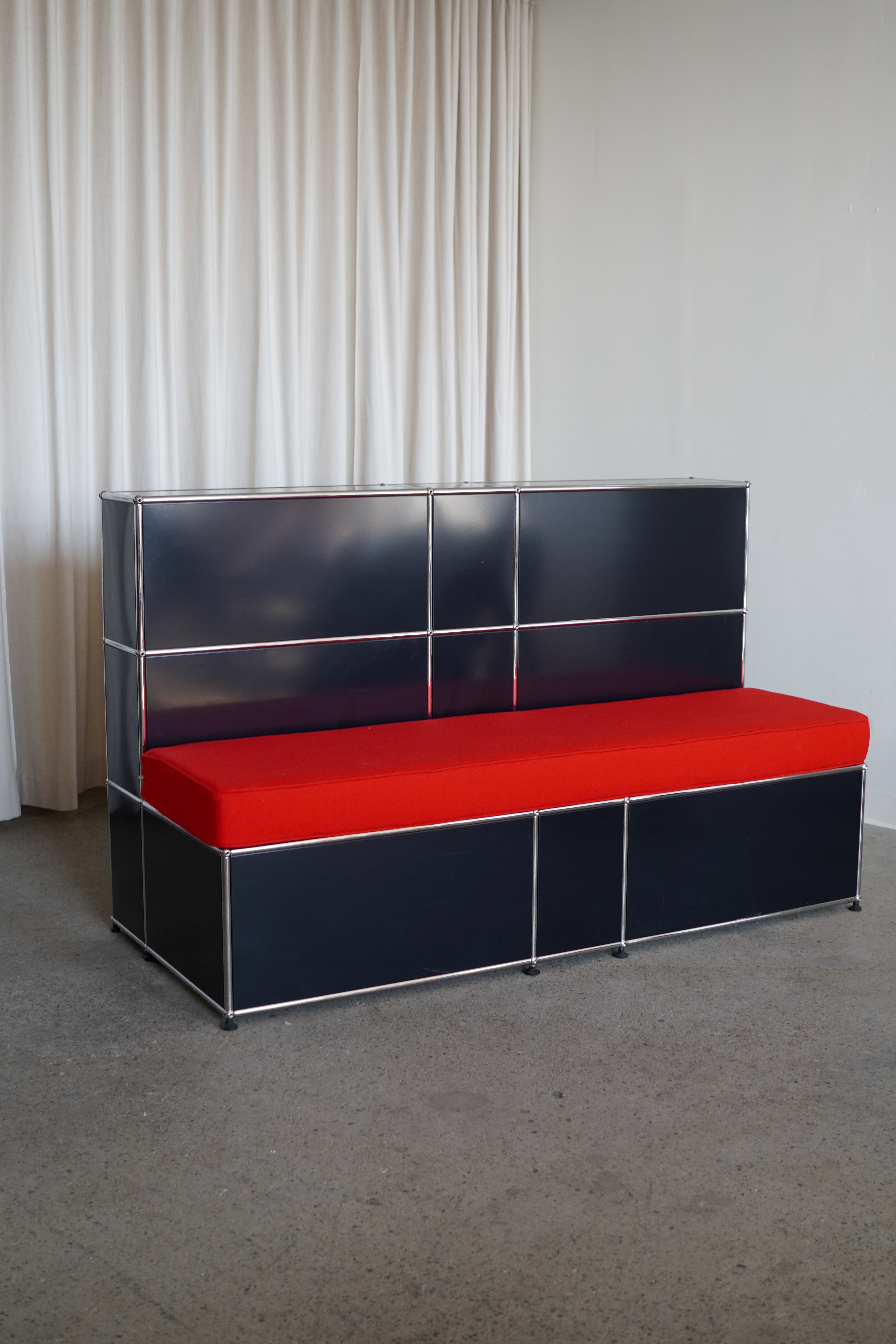Banc avec rangement par Fritz Haller et Paul Schaerer, fabriqué en Suisse, années 2000. Structure en acier thermolaqué et tubes d’acier chromés. Meuble sur mesure composé d’un banc avec coussin rouge amovible d’un côté et d’une bibliothèque / rangement de l’autre. La partie rangement comprend 9 compartiments, dont 2 avec étagères pivotantes de présentation, parfaites pour exposer livres ou vinyles.