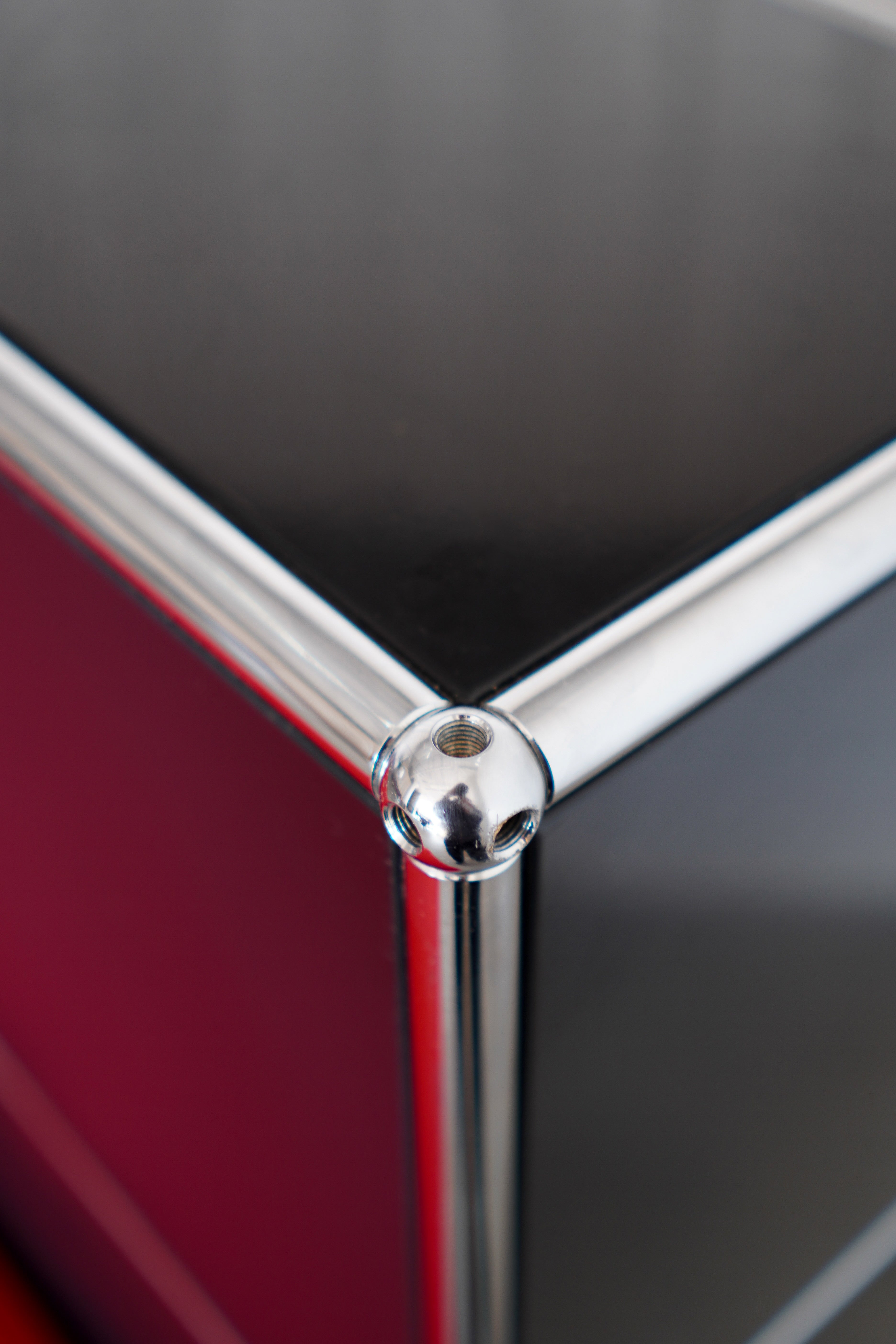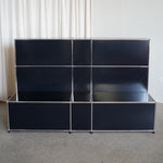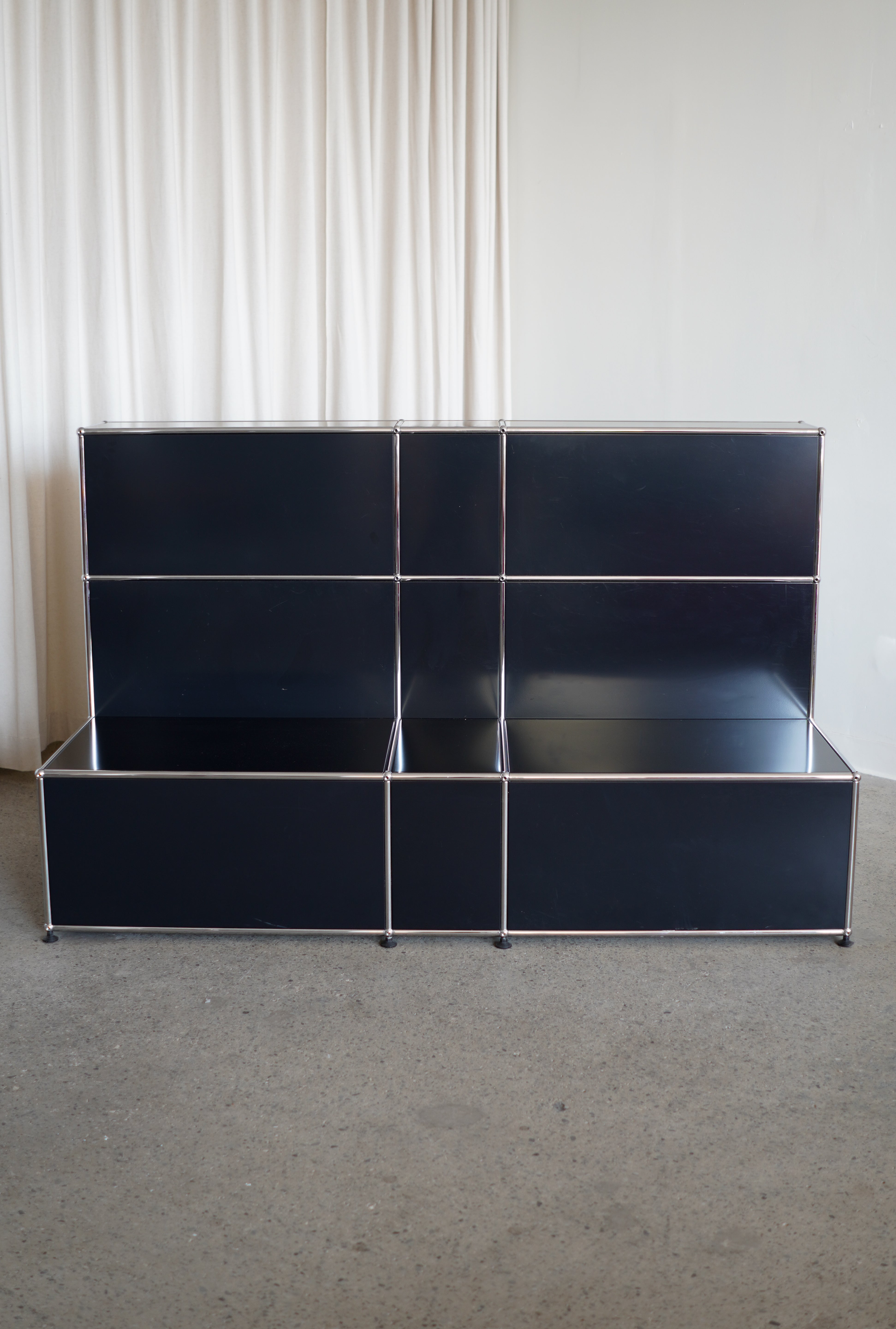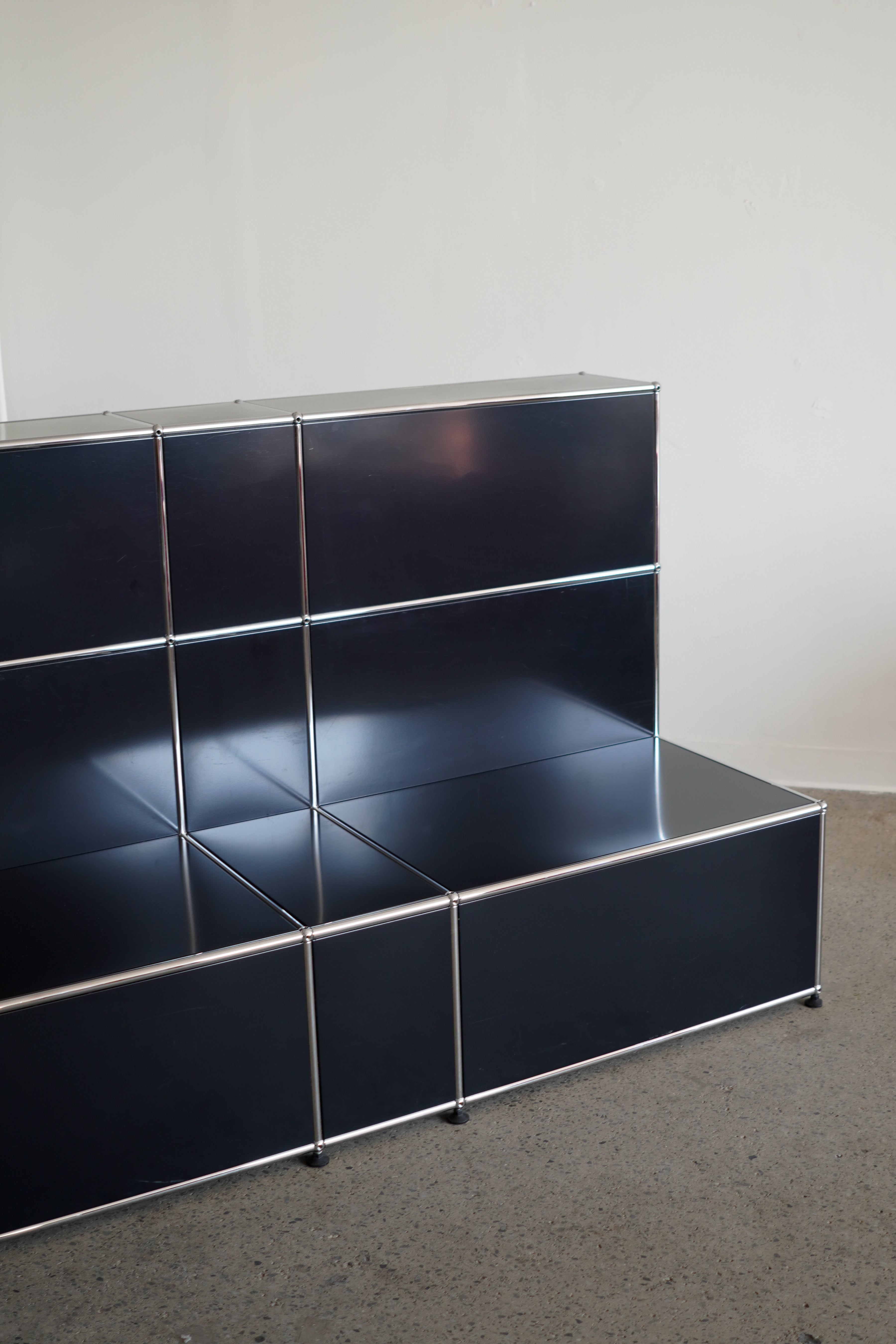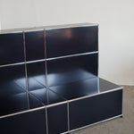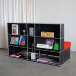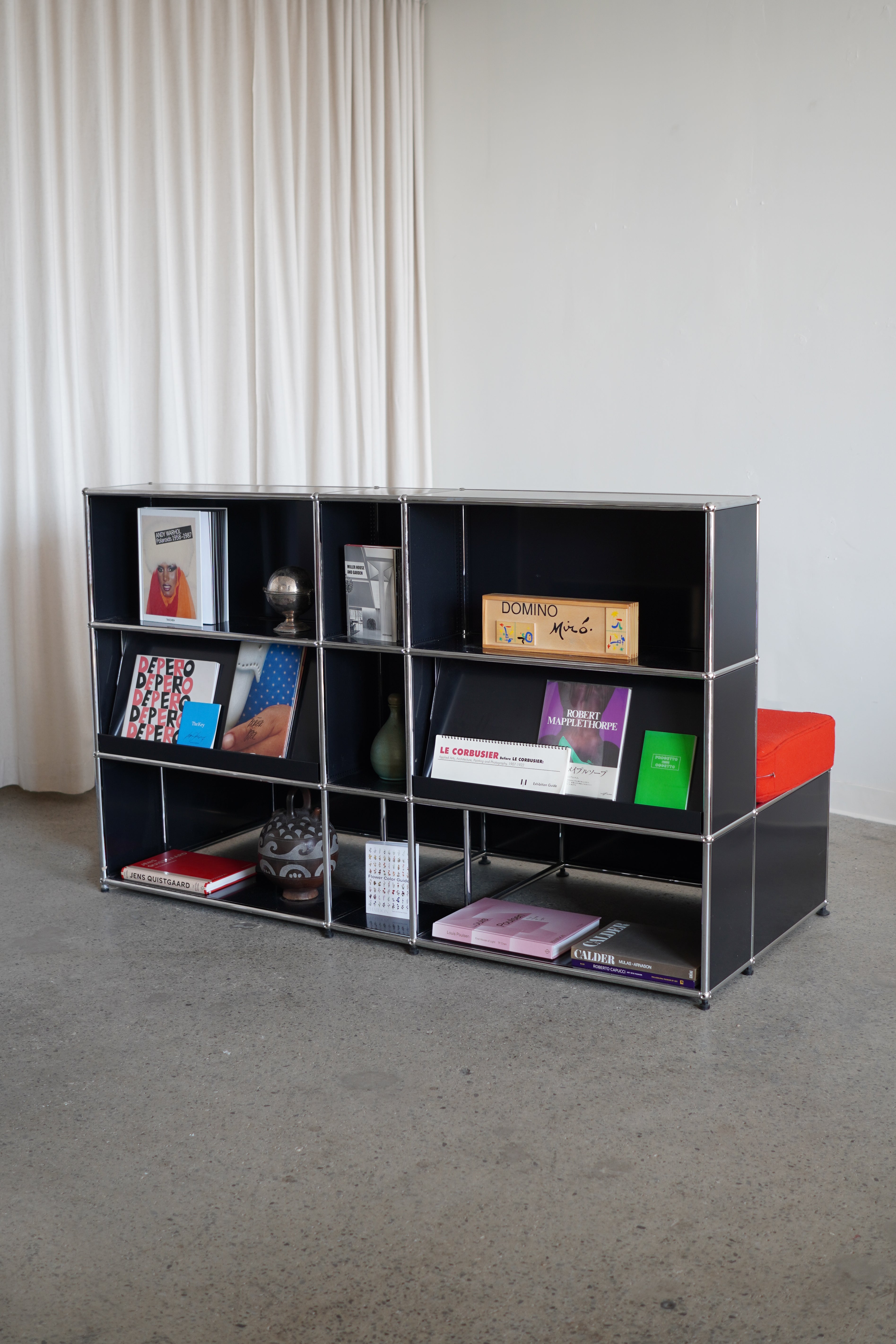Banc avec rangement par Fritz Haller et Paul Schaerer, fabriqué en Suisse, années 2000. Structure en acier thermolaqué et tubes d’acier chromés. Meuble sur mesure composé d’un banc avec coussin rouge amovible d’un côté et d’une bibliothèque / rangement de l’autre. La partie rangement comprend 9 compartiments, dont 2 avec étagères pivotantes de présentation, parfaites pour exposer livres ou vinyles.