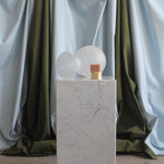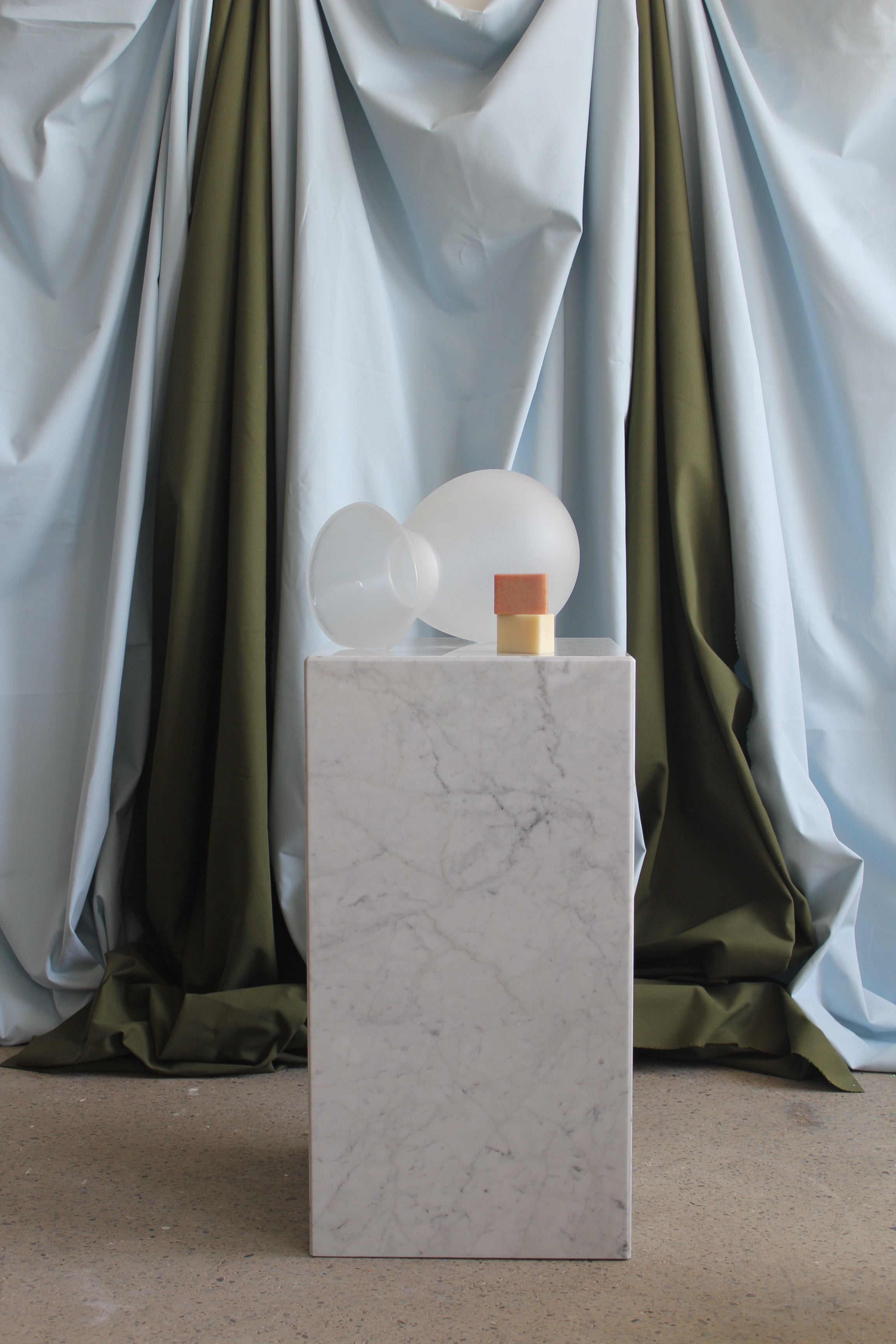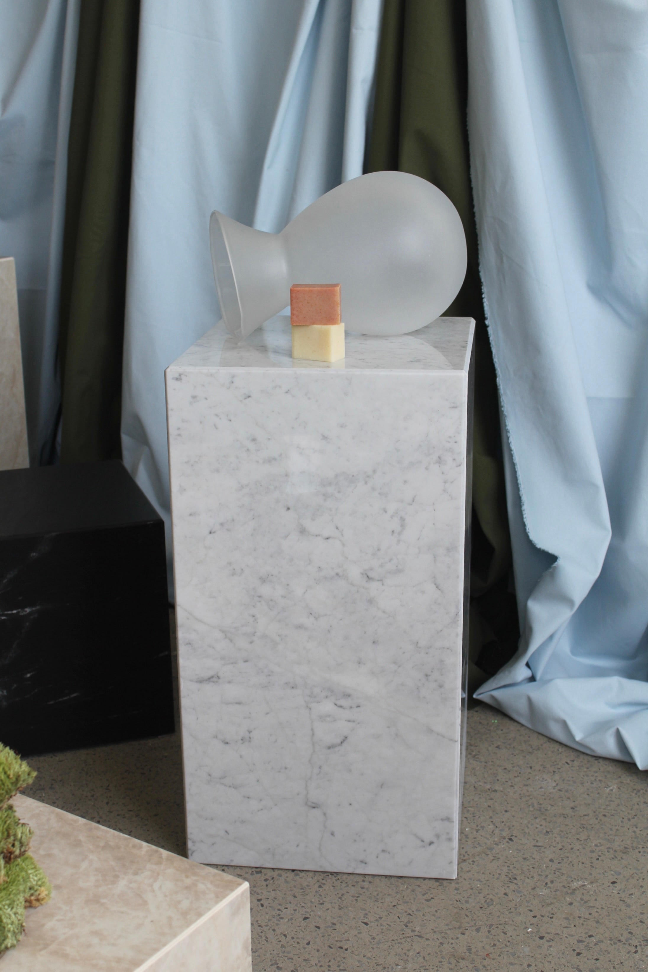 Socle ou bout de canapé en marbre Bianco Carrara, fabriqué à Montréal en 2024. Pièce unique composée de différentes dalles de marbre, rendant chaque face singulière et mettant en valeur le veinage et la texture naturels de la pierre.