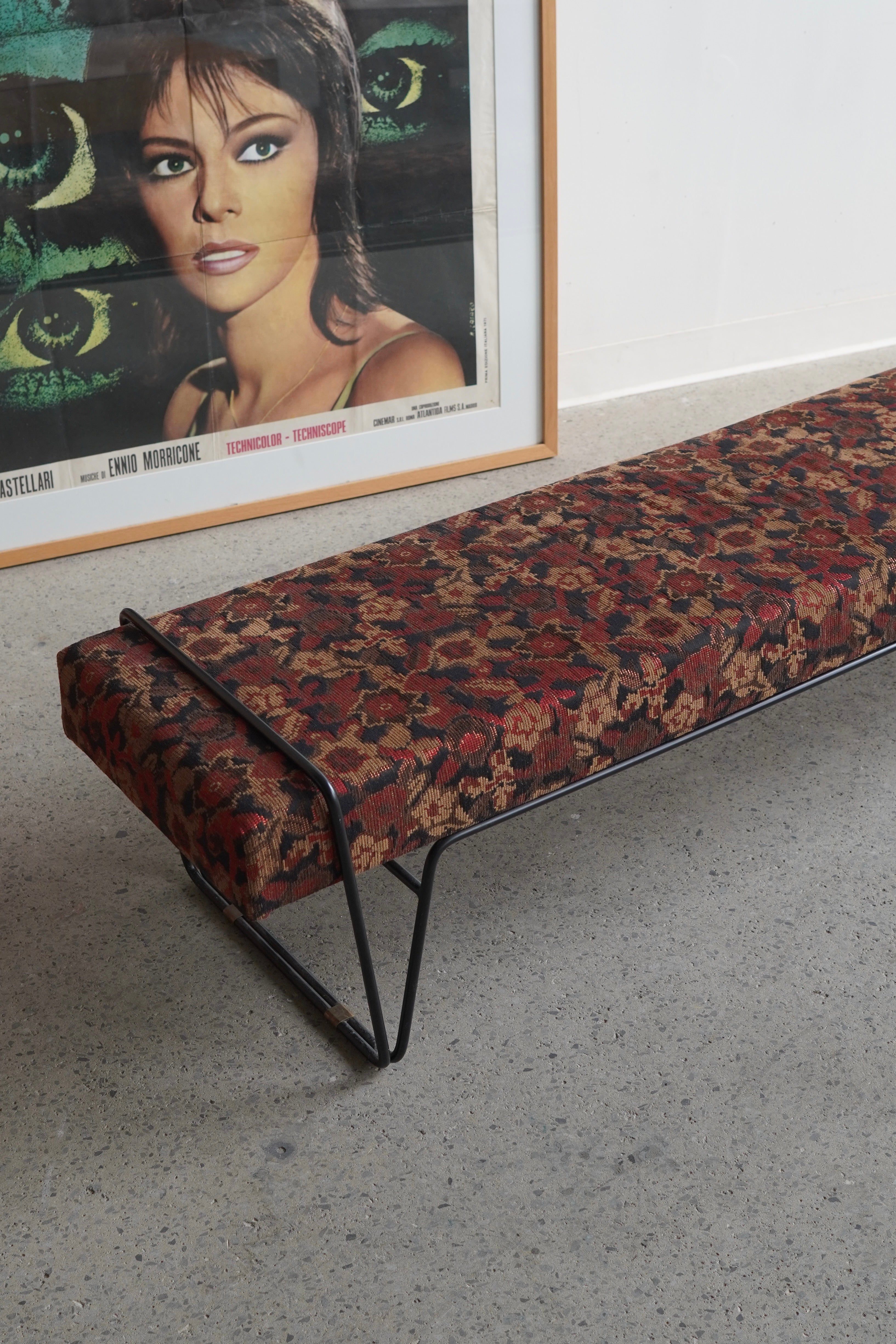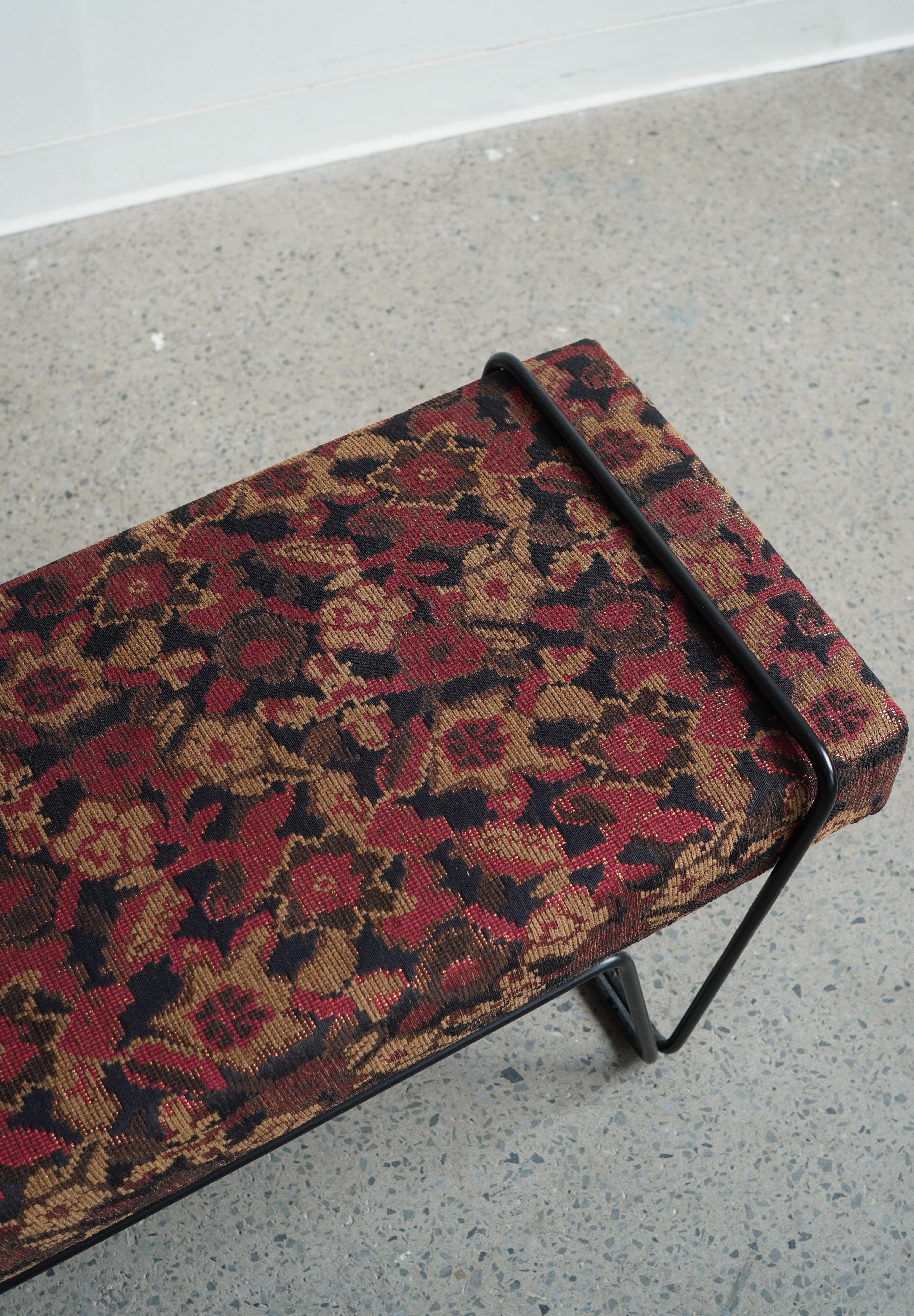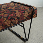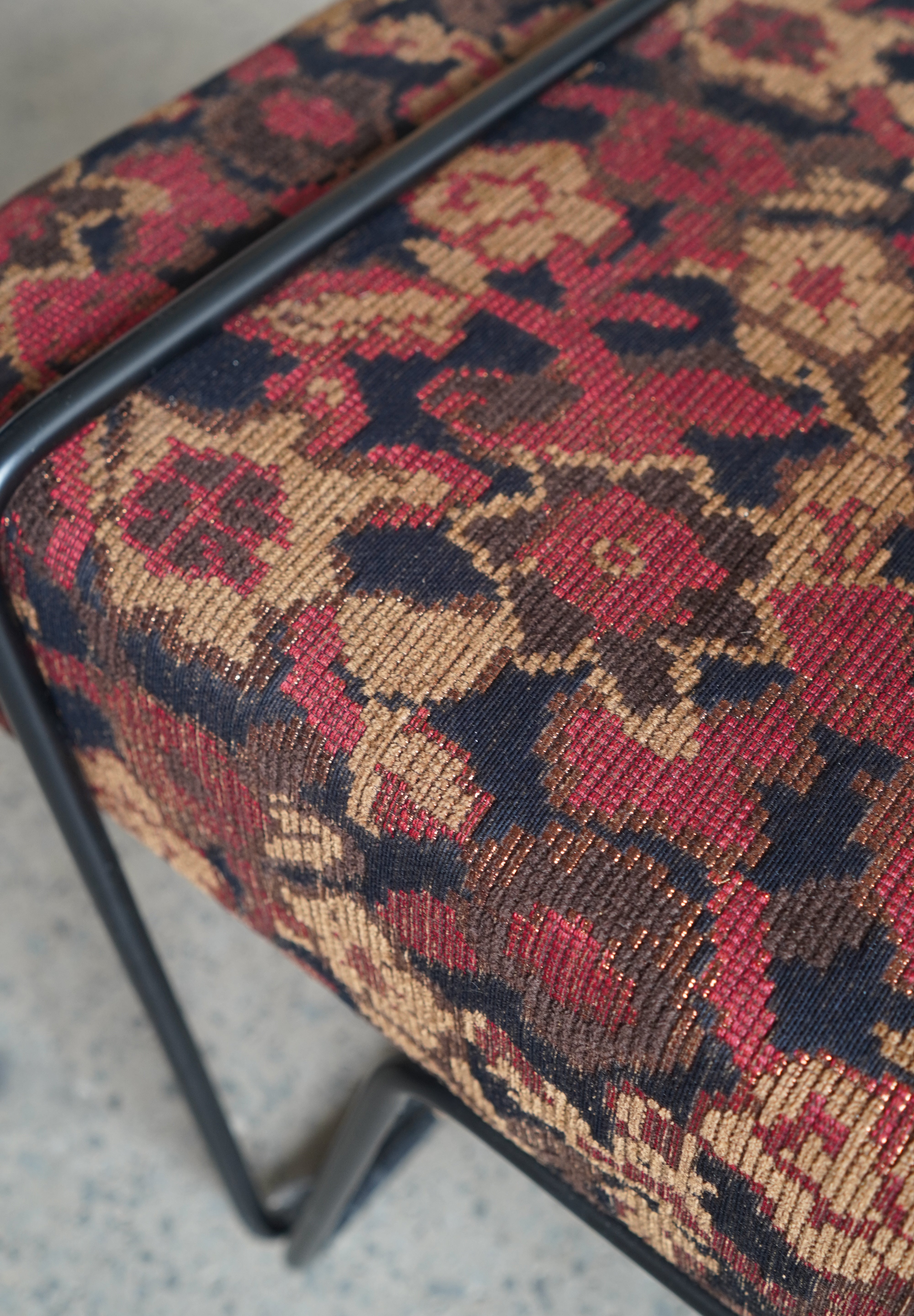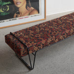 Banc Panchina par Dimore Milano, 2010. Tissu fleuri, rembourrage en mousse de polyuréthane avec structure en métal noir mat et détails en laiton oxydé.
