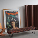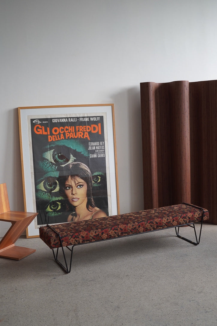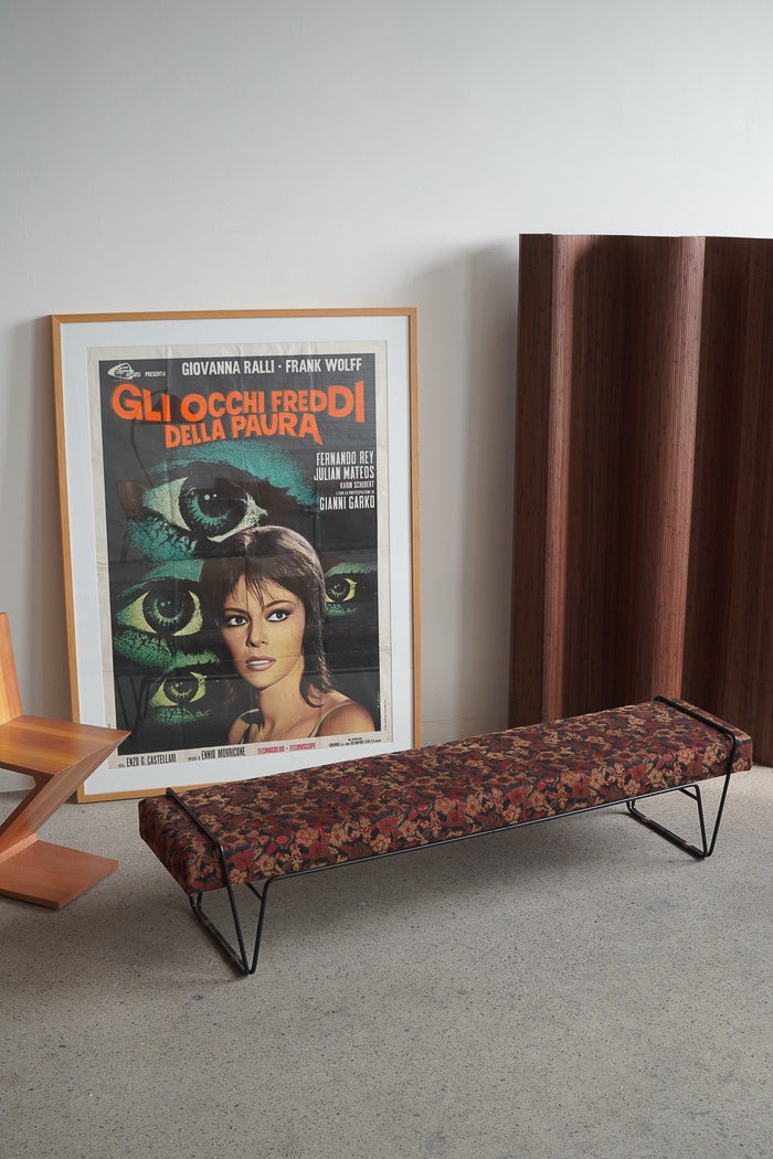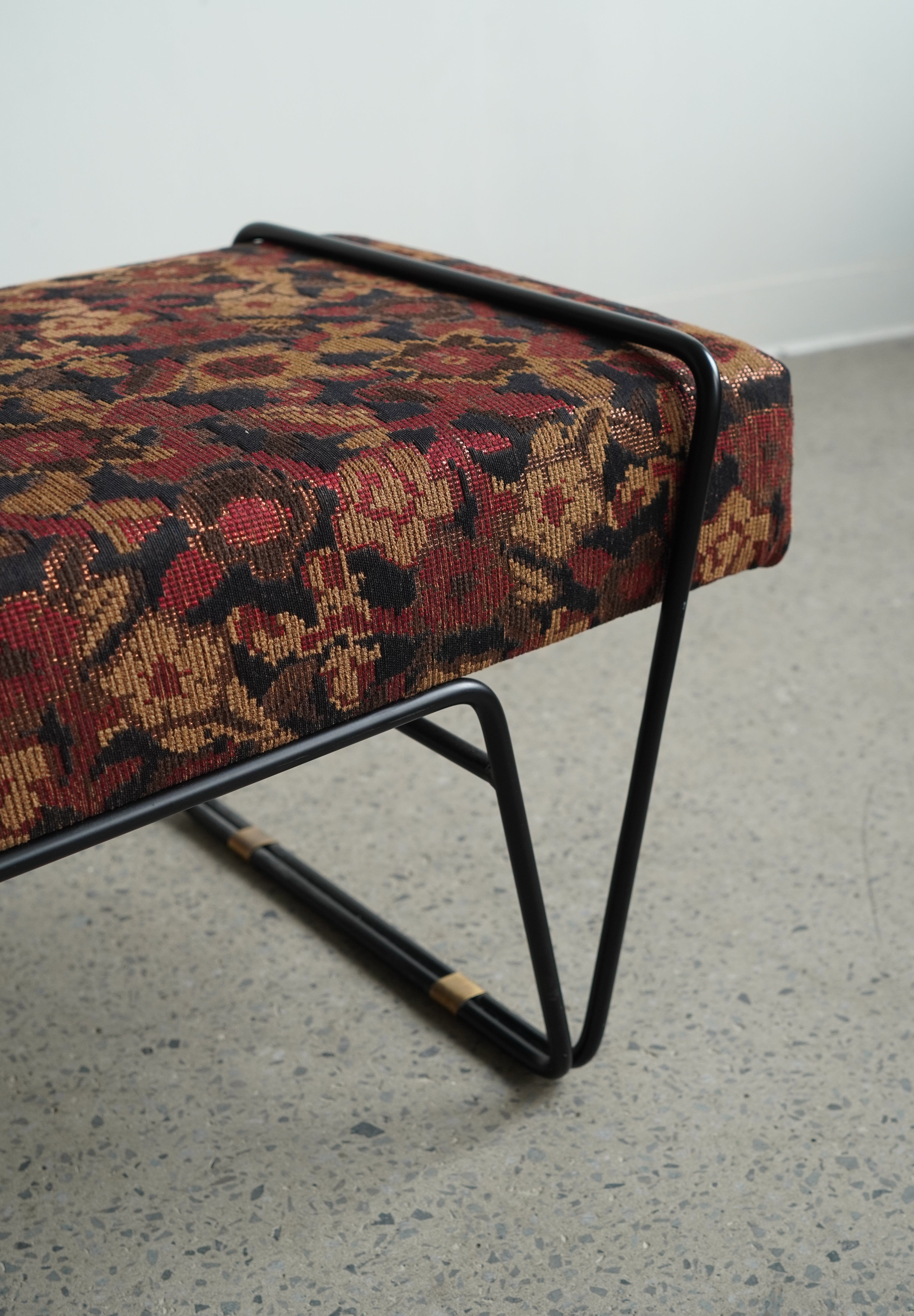 Banc Panchina par Dimore Milano, 2010. Tissu fleuri, rembourrage en mousse de polyuréthane avec structure en métal noir mat et détails en laiton oxydé.
