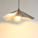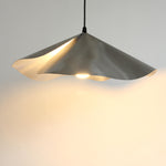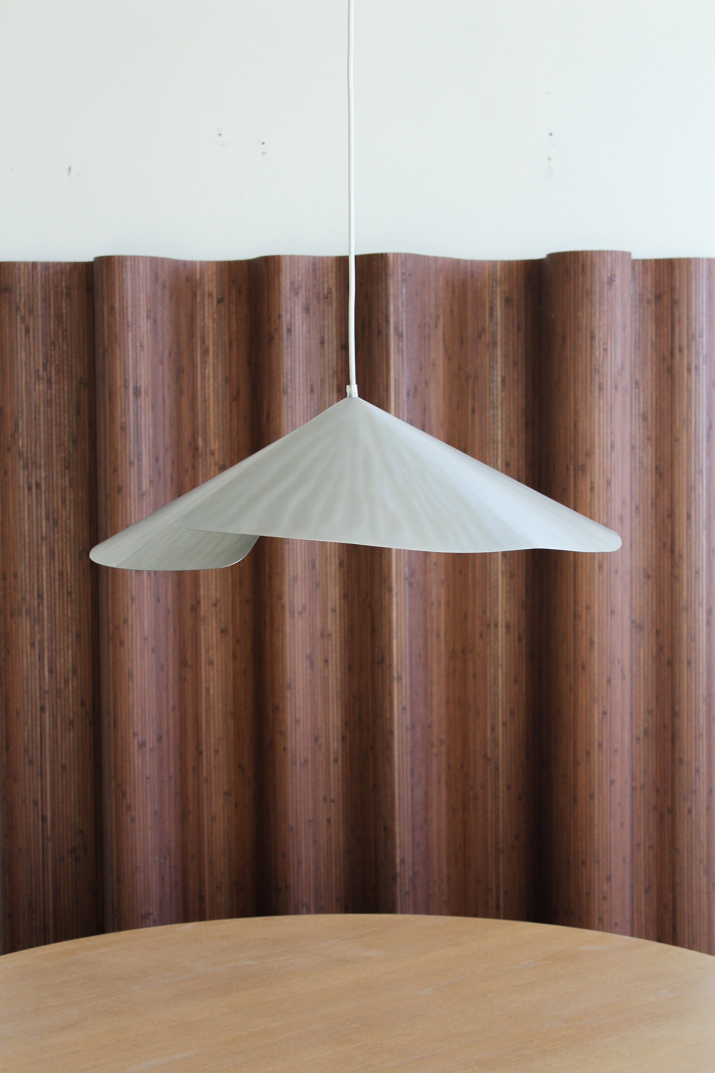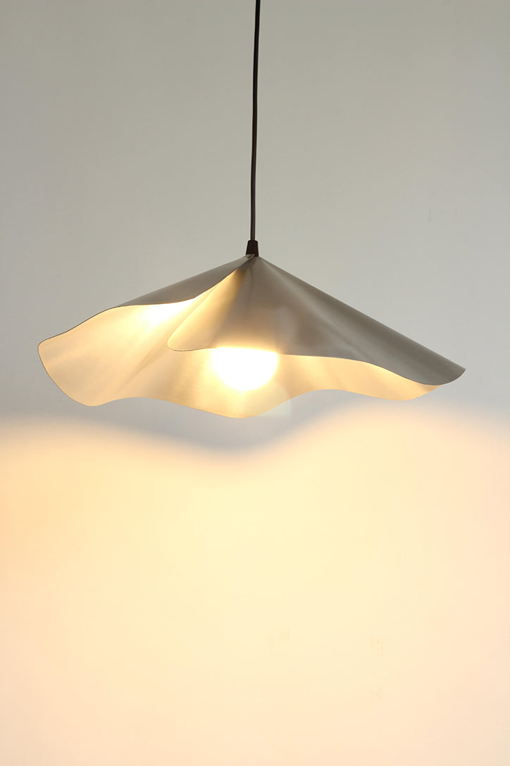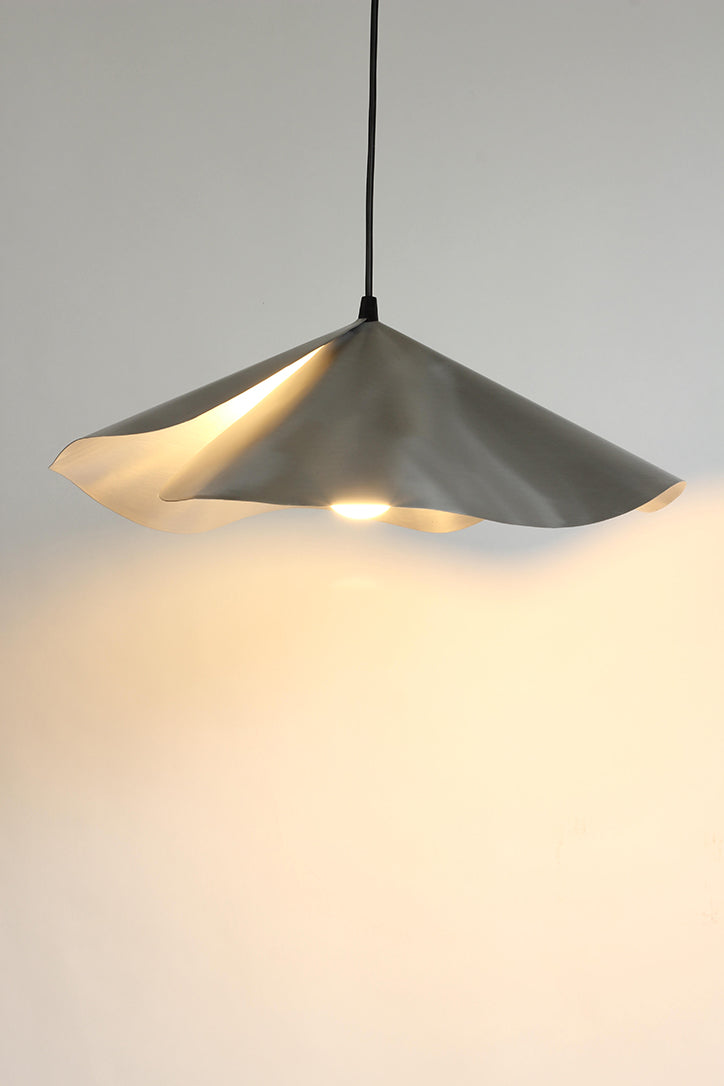 Suspension Flower par Colin Chetwood, 2023. Abat-jour en aluminium satiné poli en forme de fleur ouverte. Chaque pièce est façonnée à la main et unique. L’ampoule est dissimulée à l’intérieur de l’abat-jour et se fixe simplement sur la douille. Max 100 Watt. Douille E27 chromée avec cordon en tissu blanc.