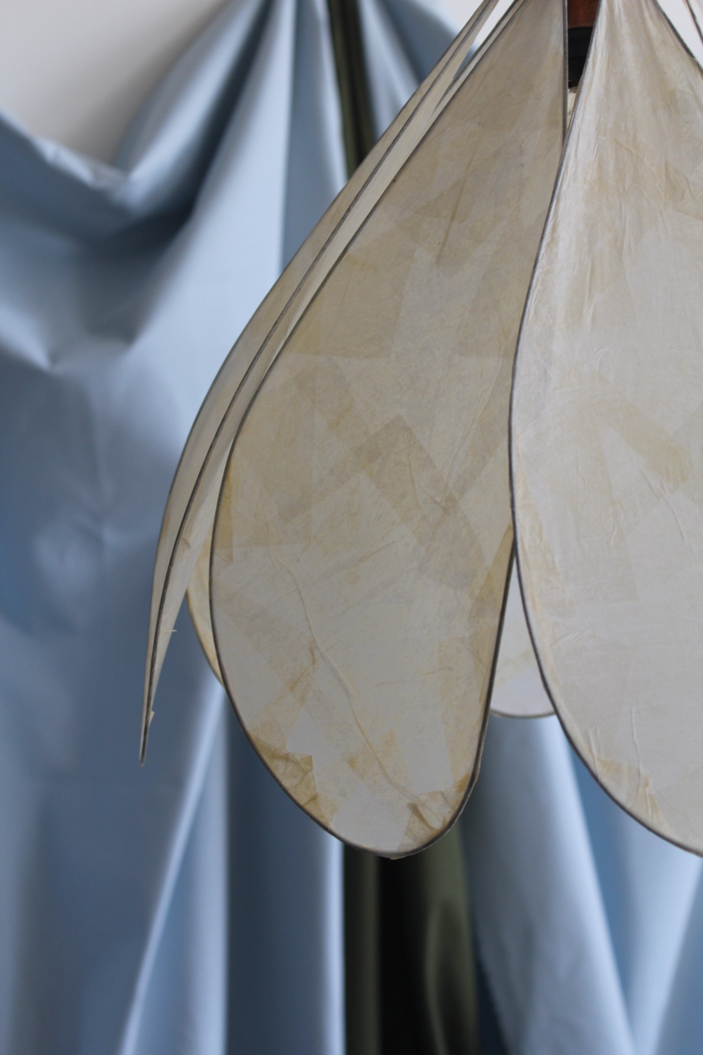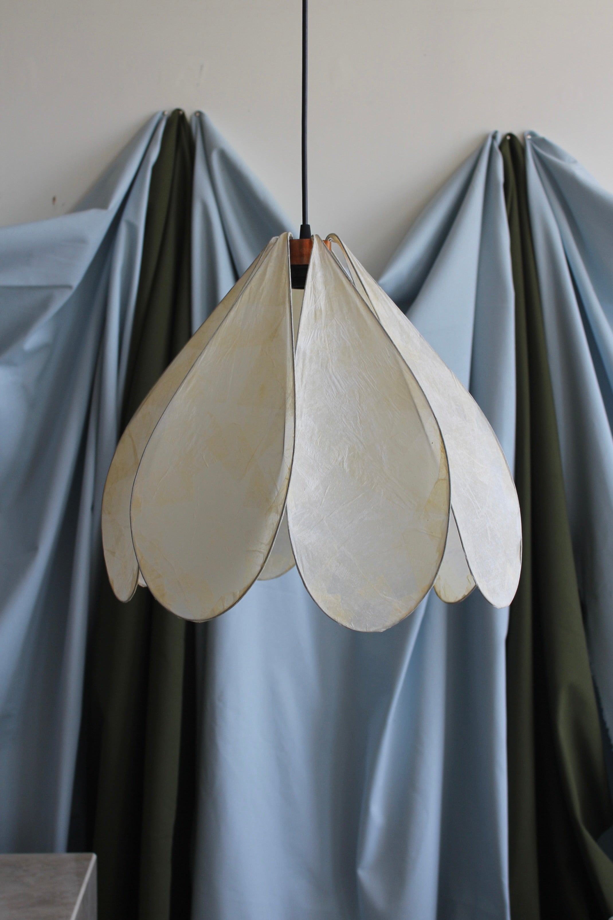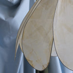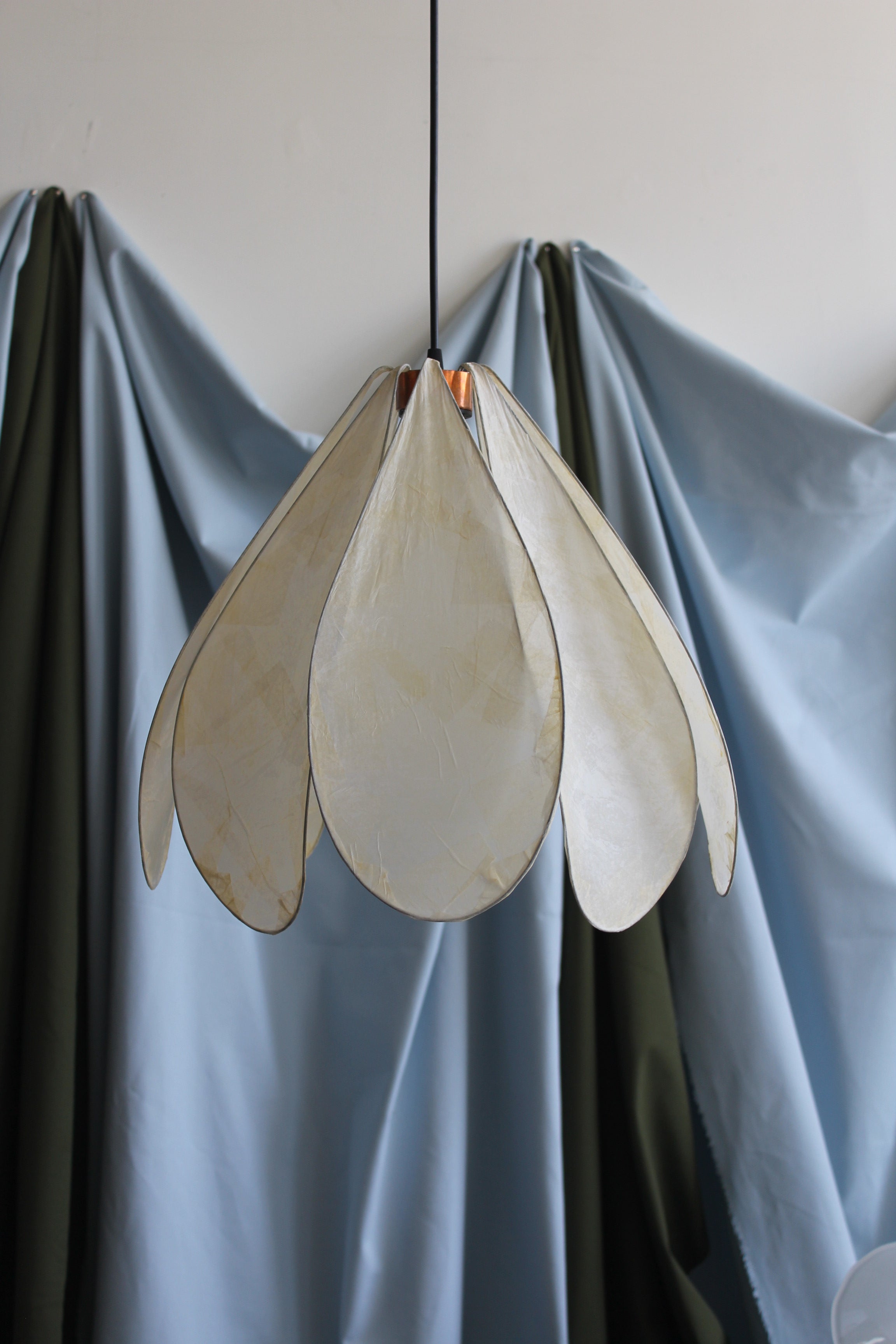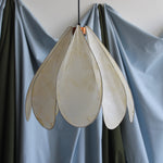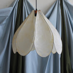 Petite suspension Daisy par Colin Chetwood, 2024. Les pétales en papier de soie laqué créent un abat-jour sculptural en forme de fleur. 8 pétales sur structure métallique avec détails en cuivre.