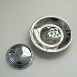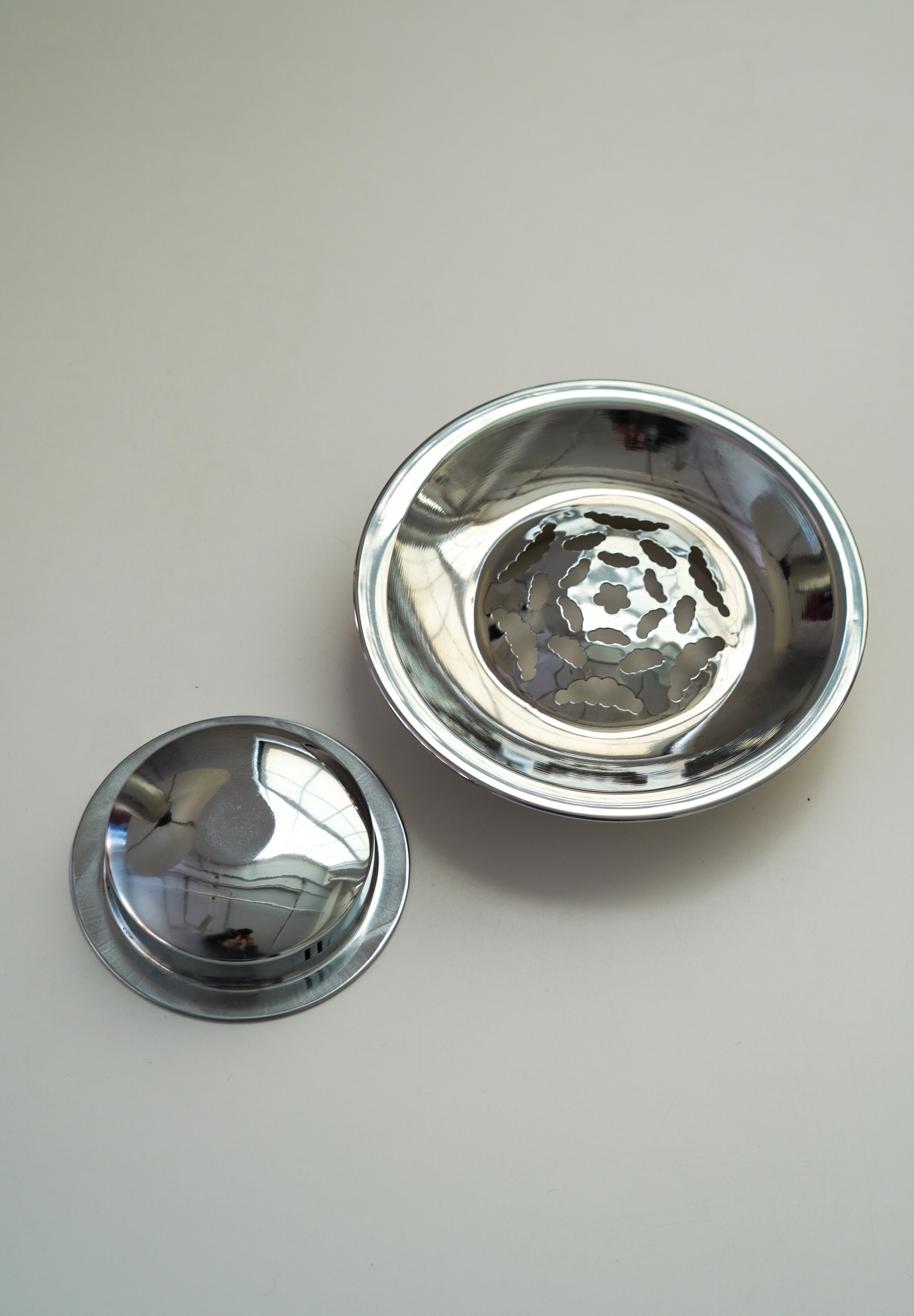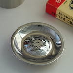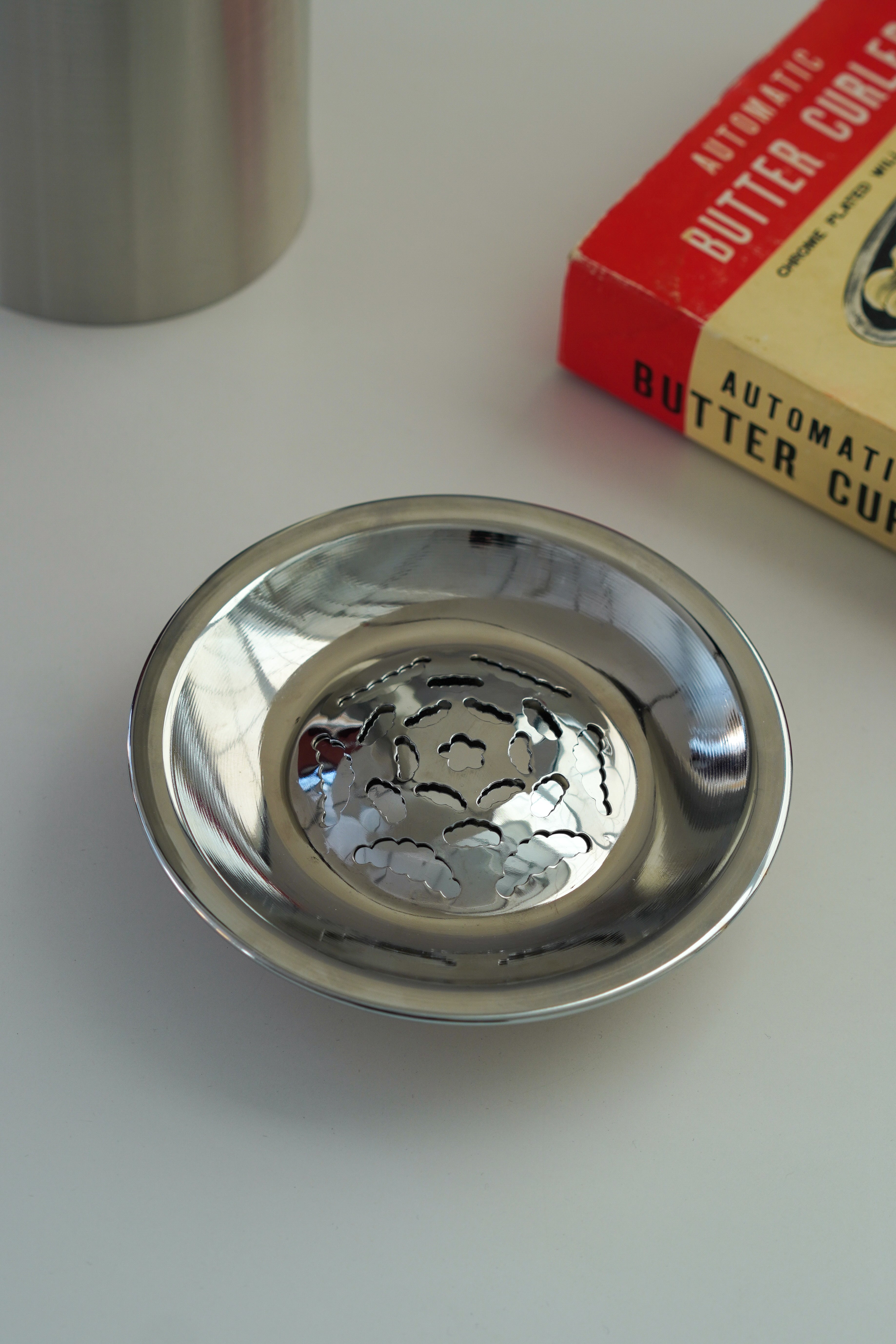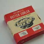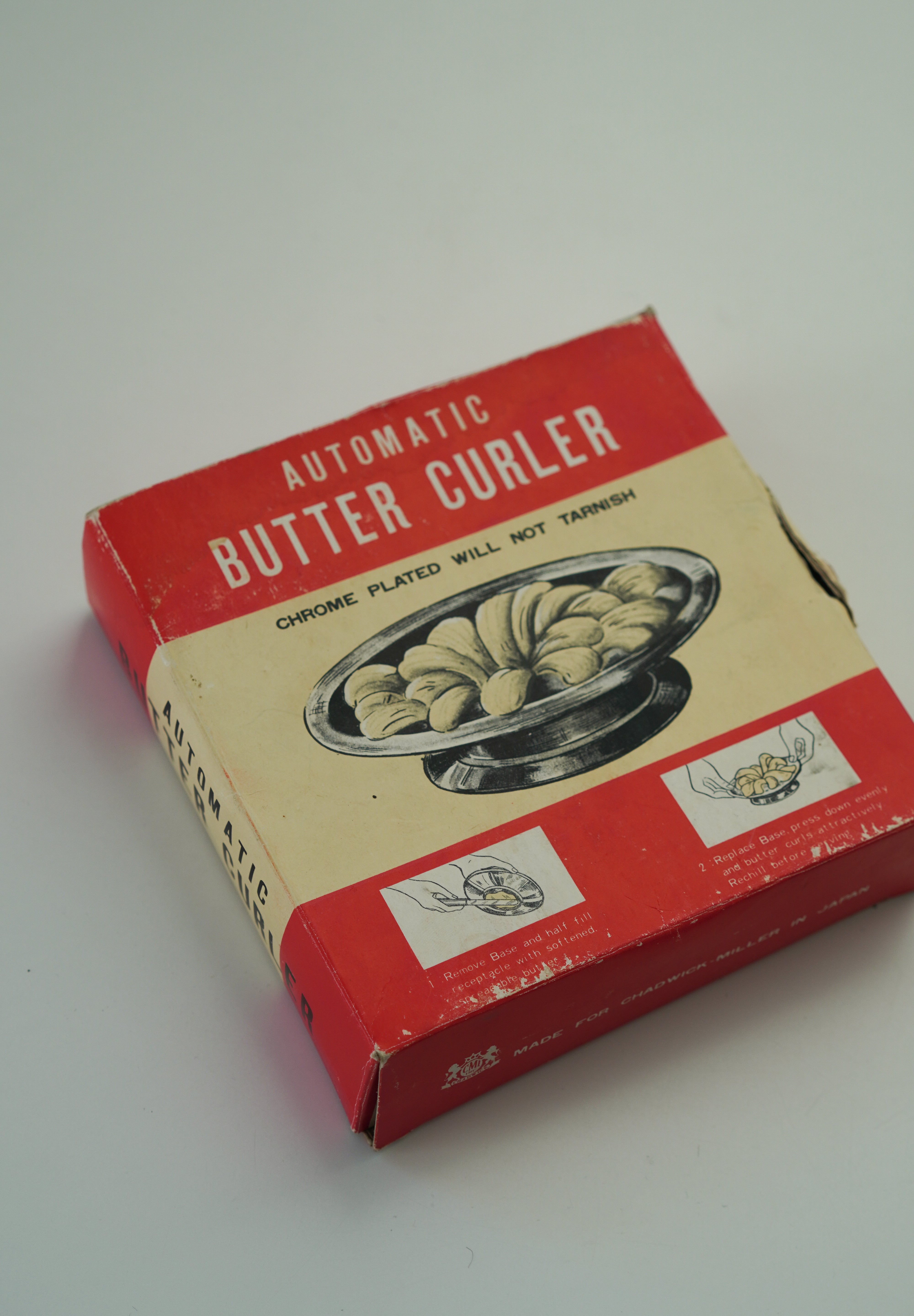 Presse à beurre « Coquillor », fabriquée au Japon, années 1950. Presse à beurre chromée composée de 2 parties; un plateau et une presse qui moule et roule le beurre en copeaux.