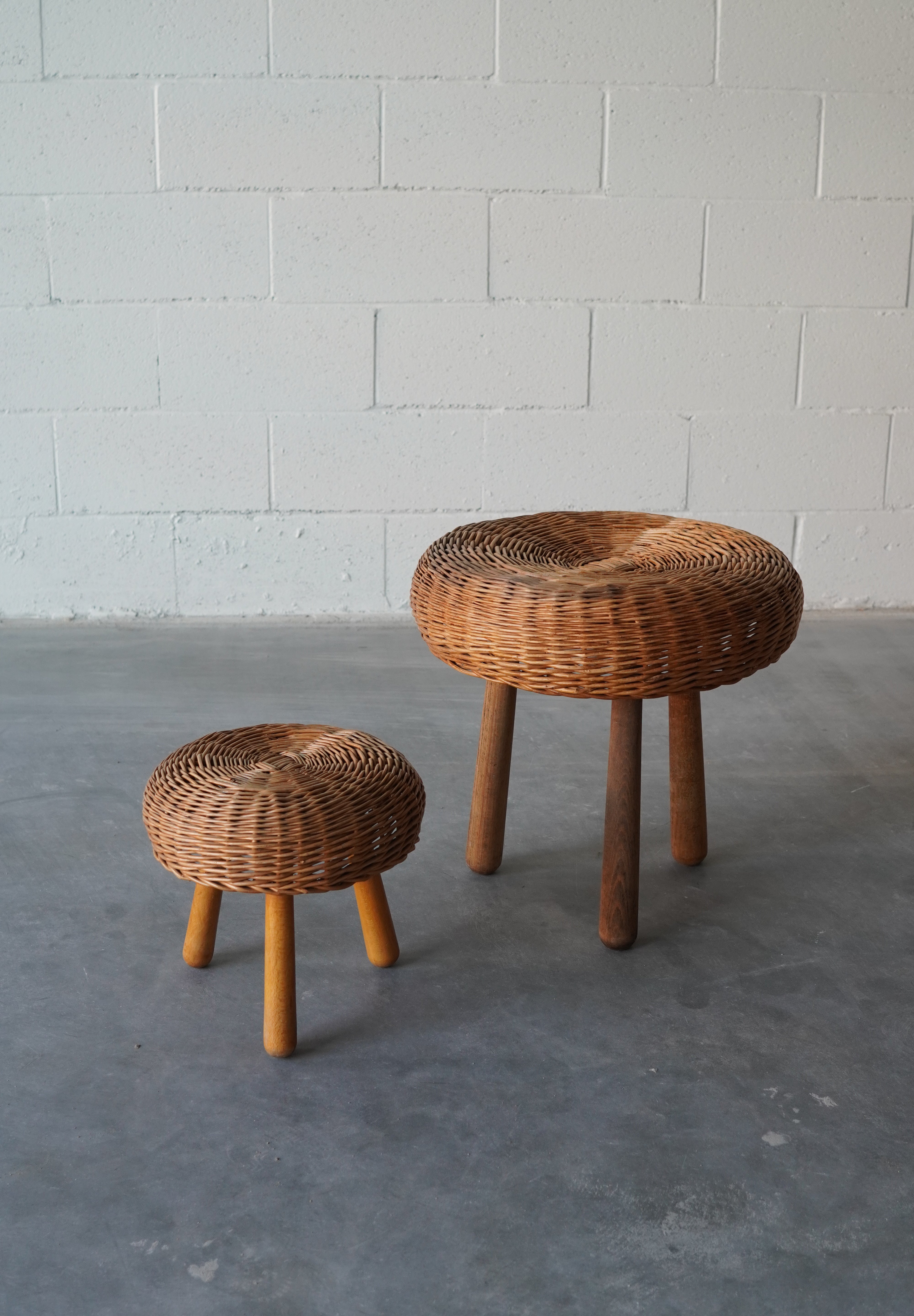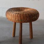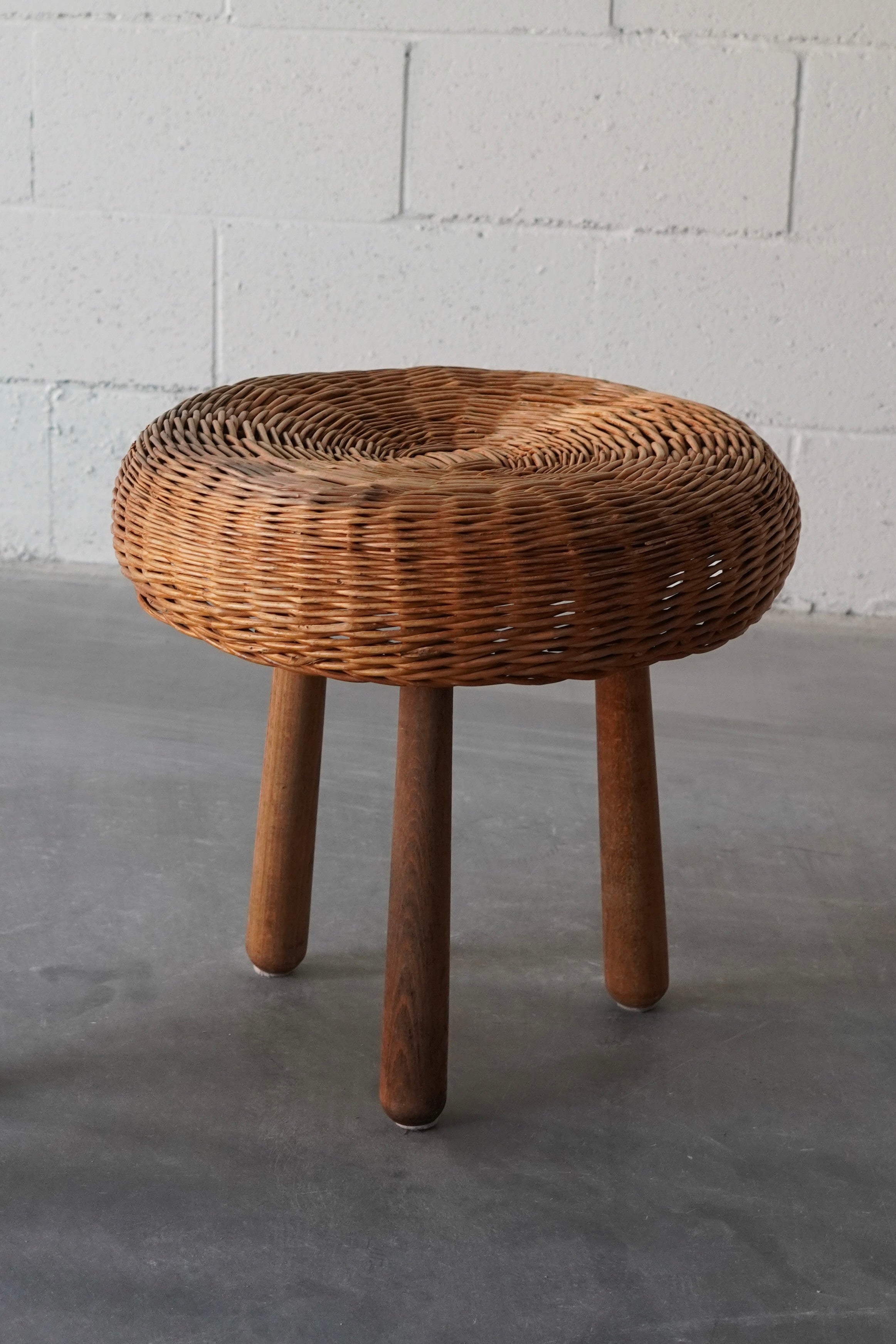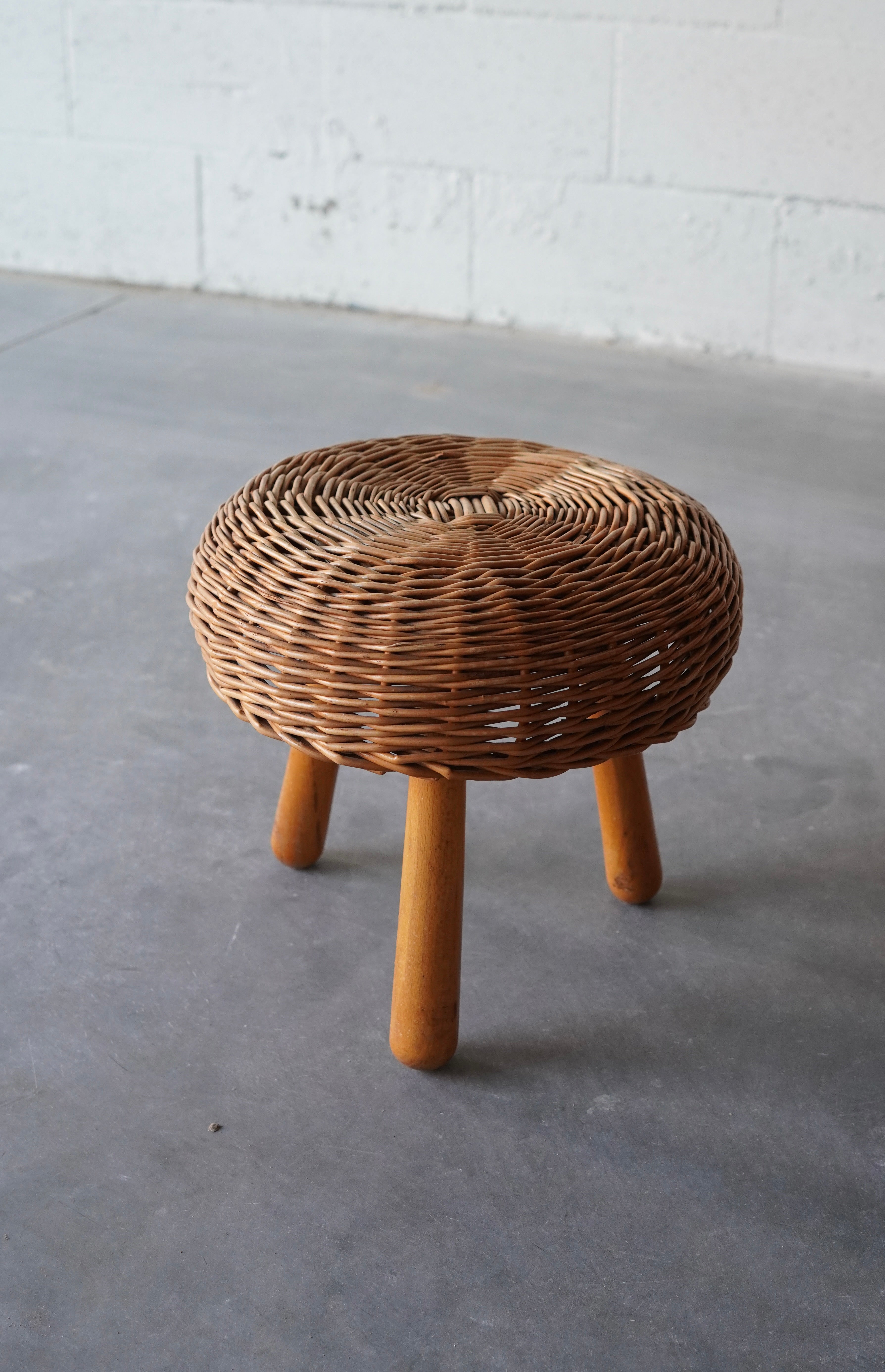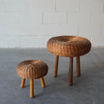Wicker Stools attributed to Tony Paul, made in the USA, 1950s. Handwoven wicker seat with three wooden legs. Can be used as a side table or footstool.