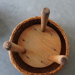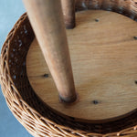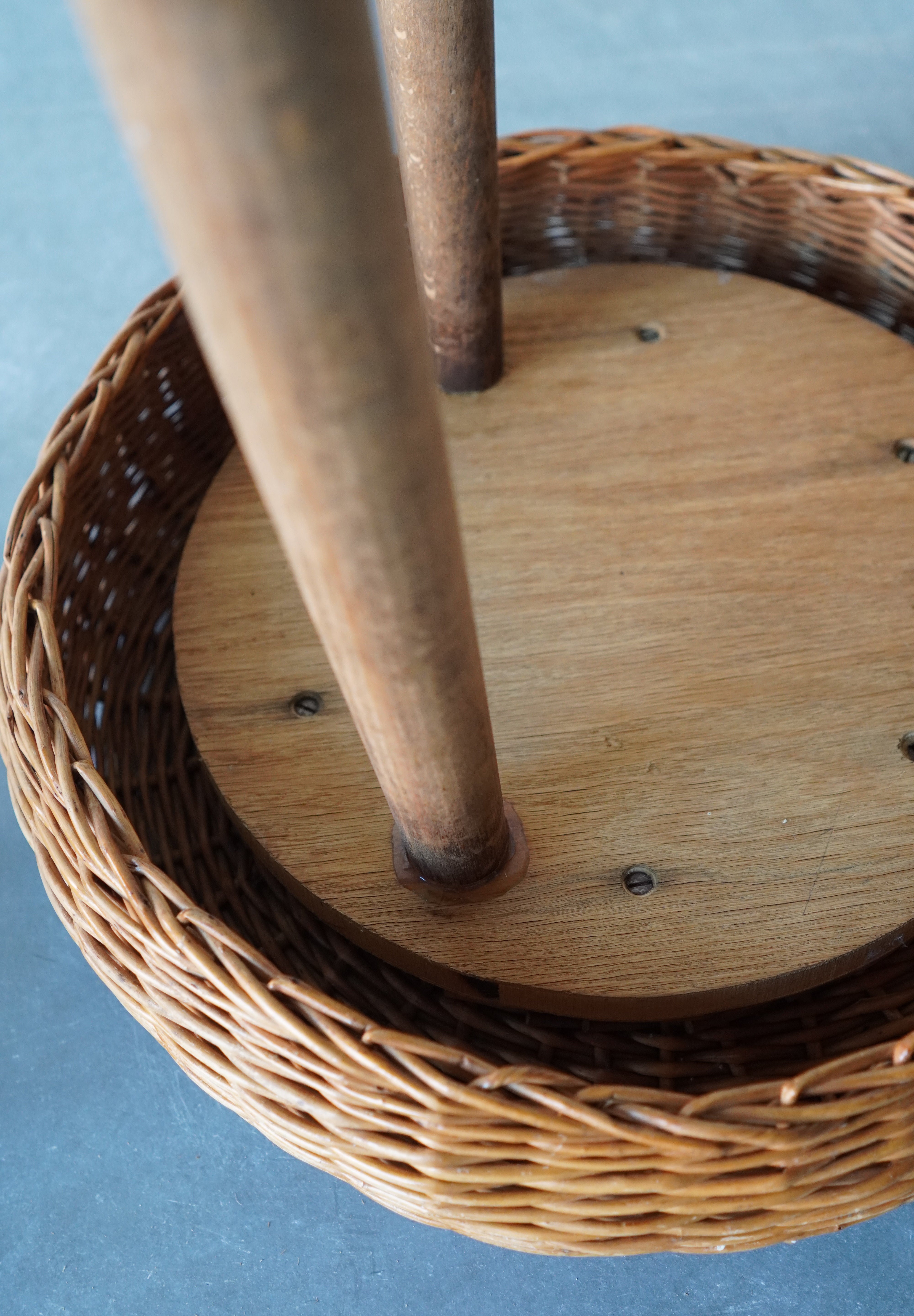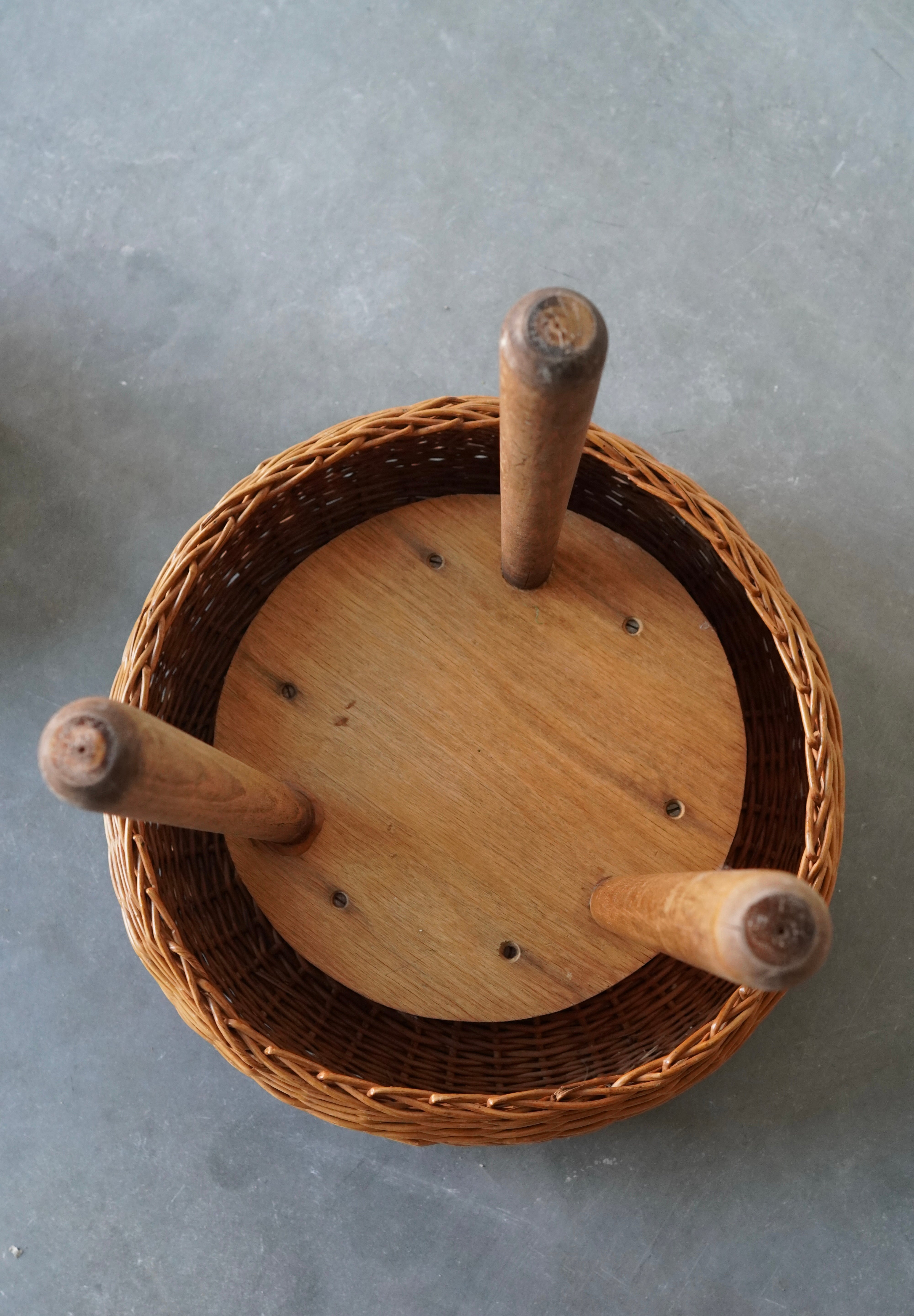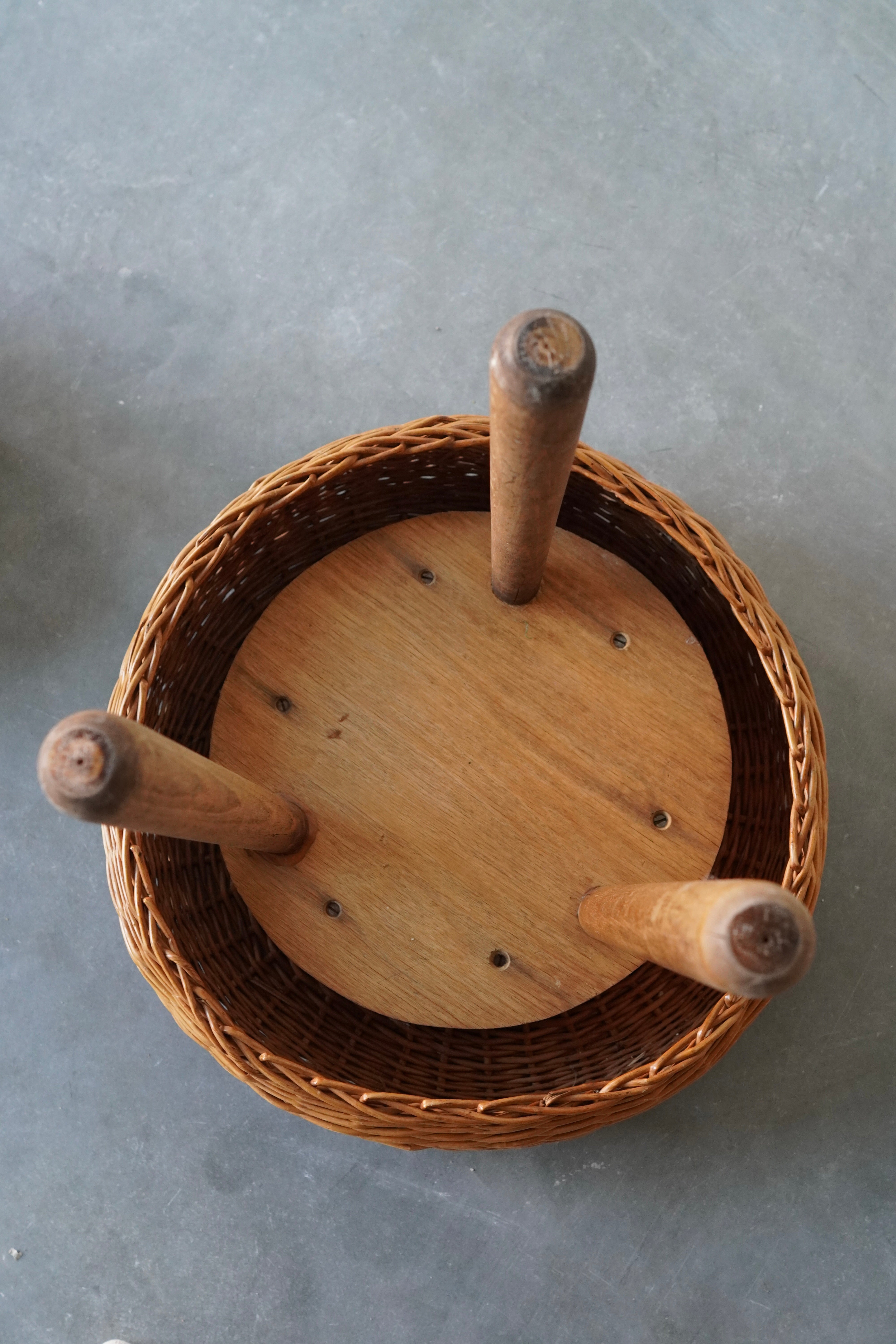 Wicker Stools attributed to Tony Paul, made in the USA, 1950s. Handwoven wicker seat with three wooden legs. Can be used as a side table or footstool.