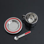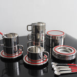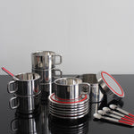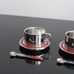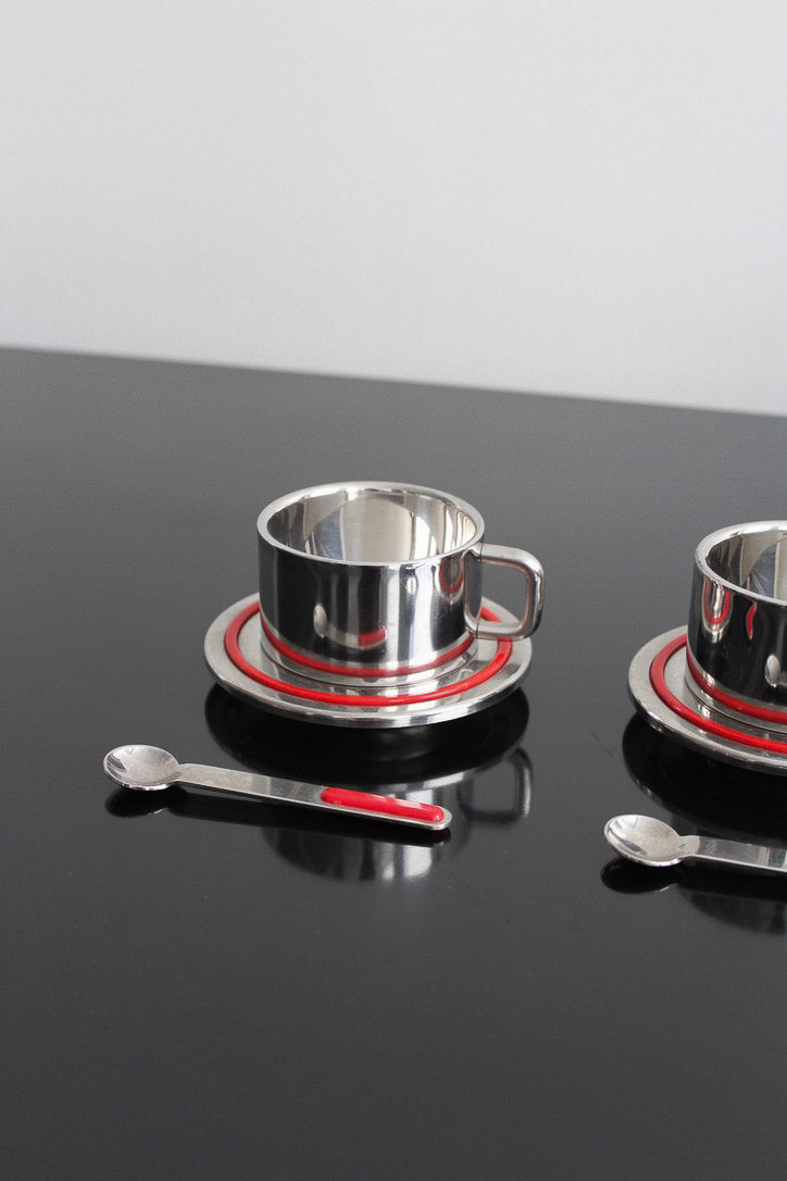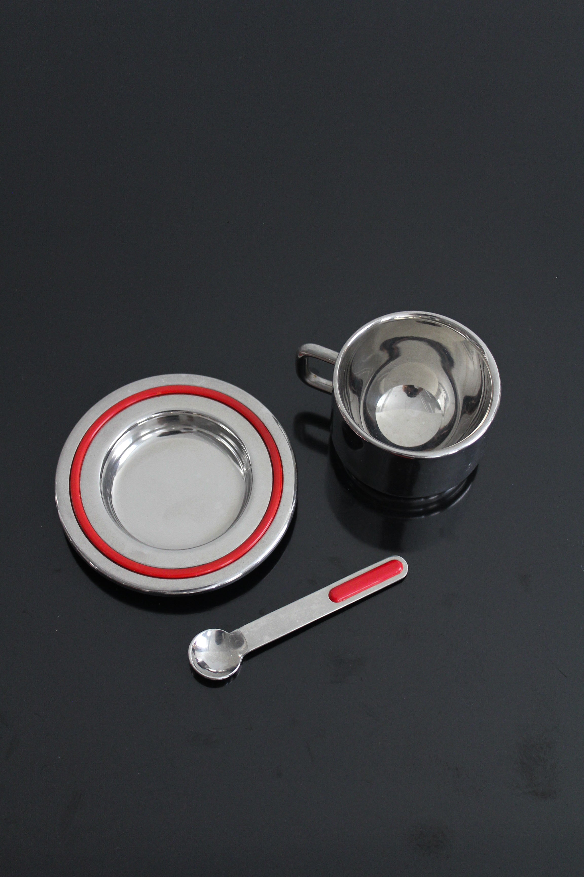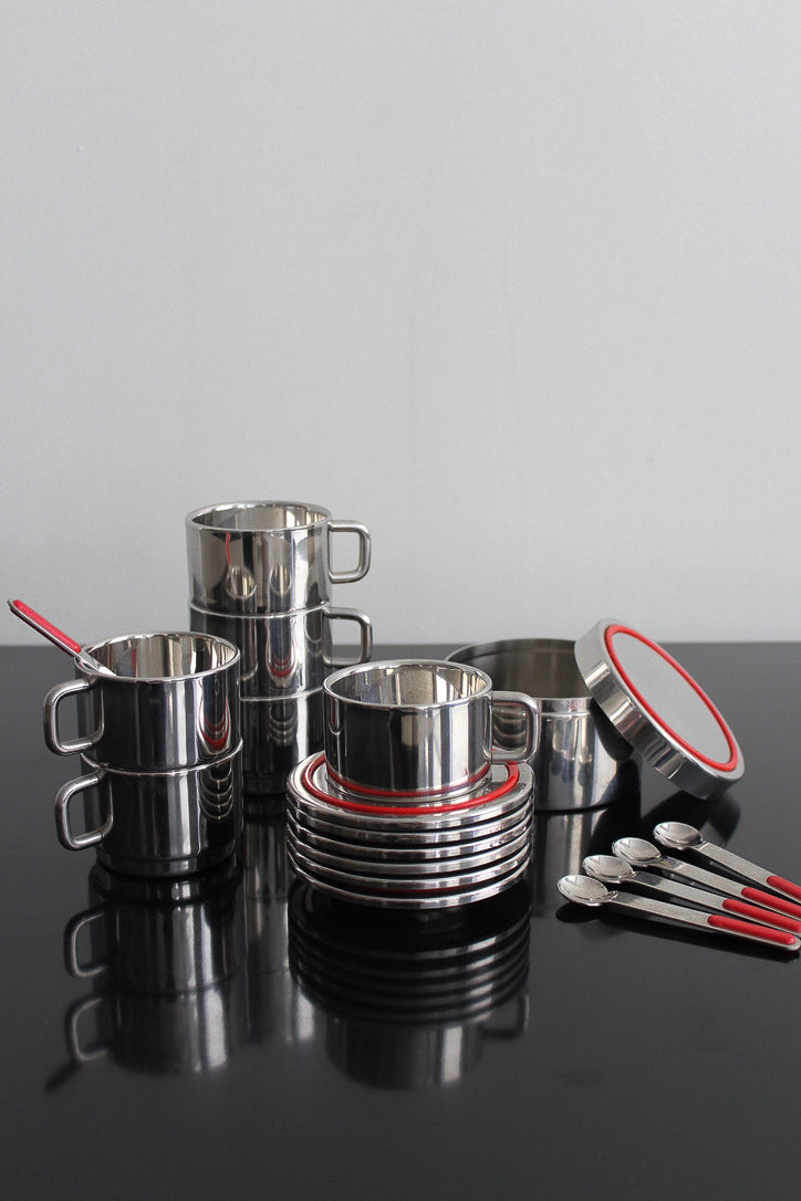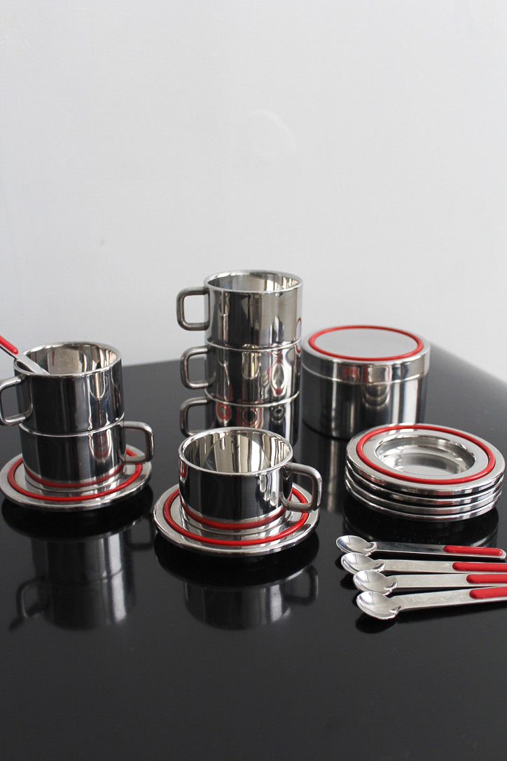 Service à espresso par Sergio Asti pour ICM Italy, années 1970. Acier inoxydable avec accents rouges, ce service fait partie de la ligne Boca.