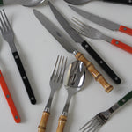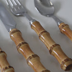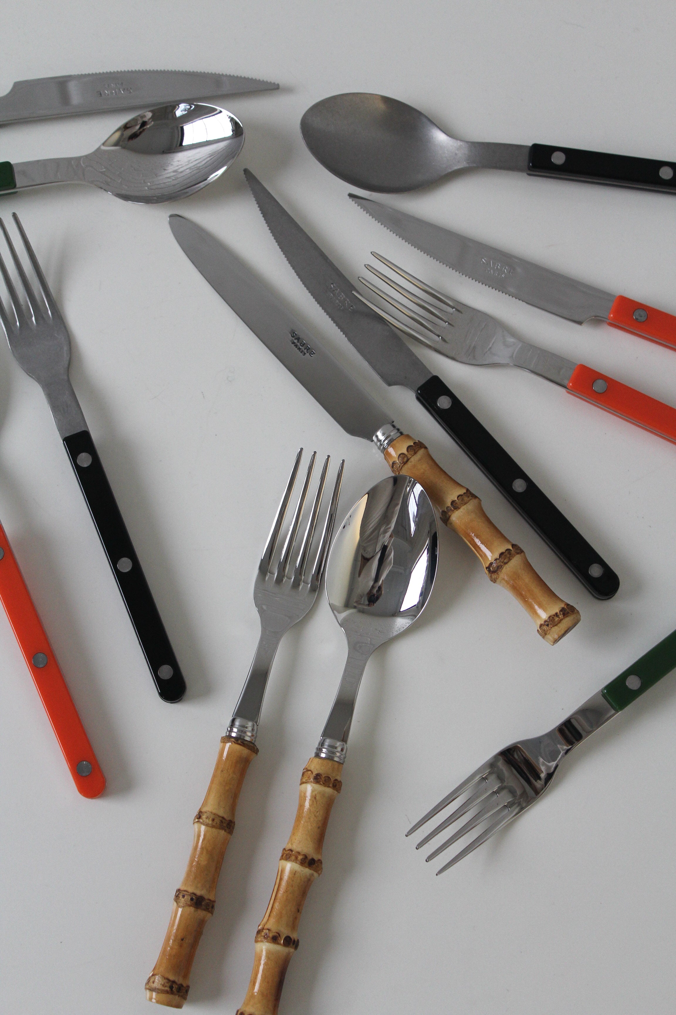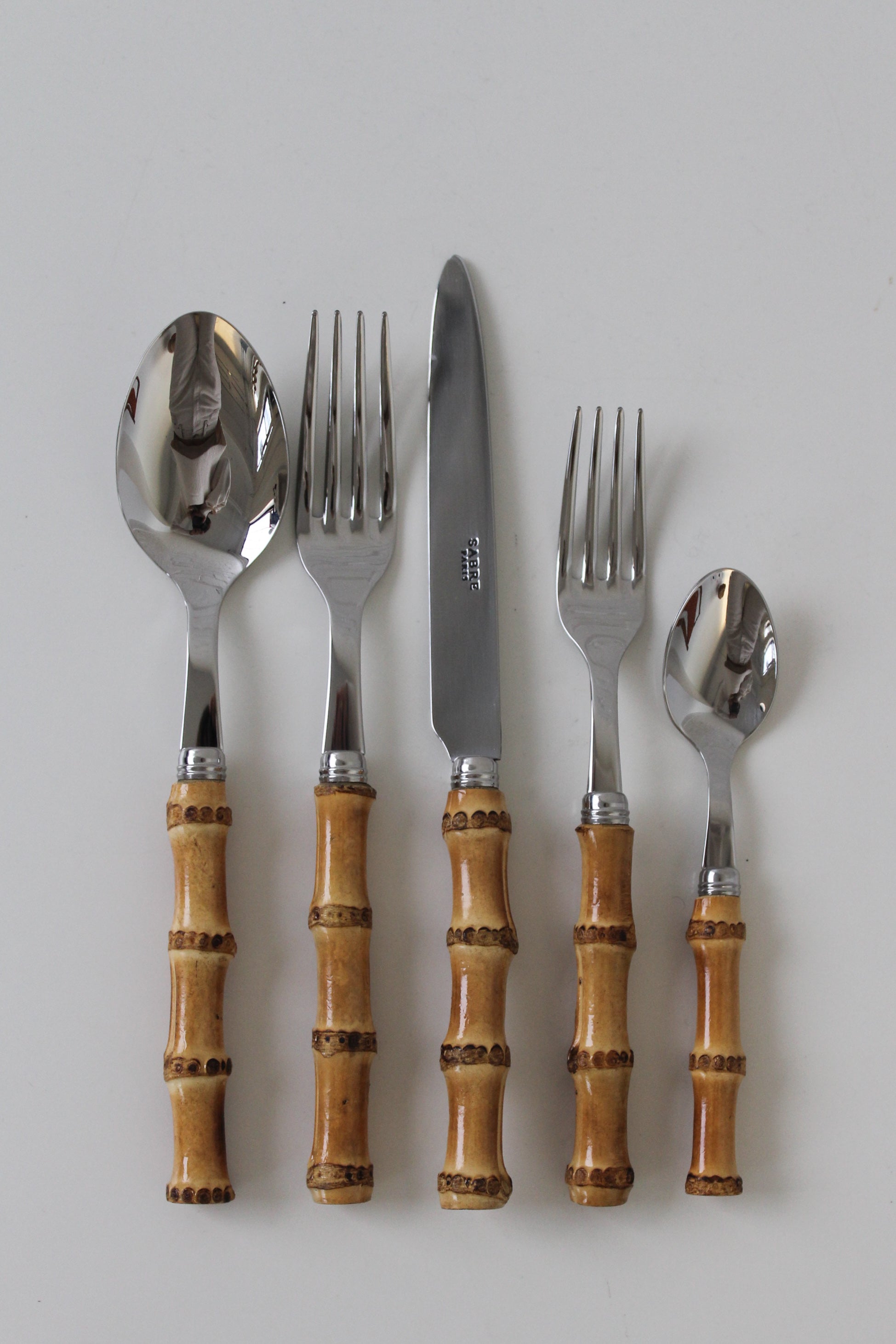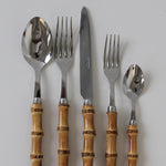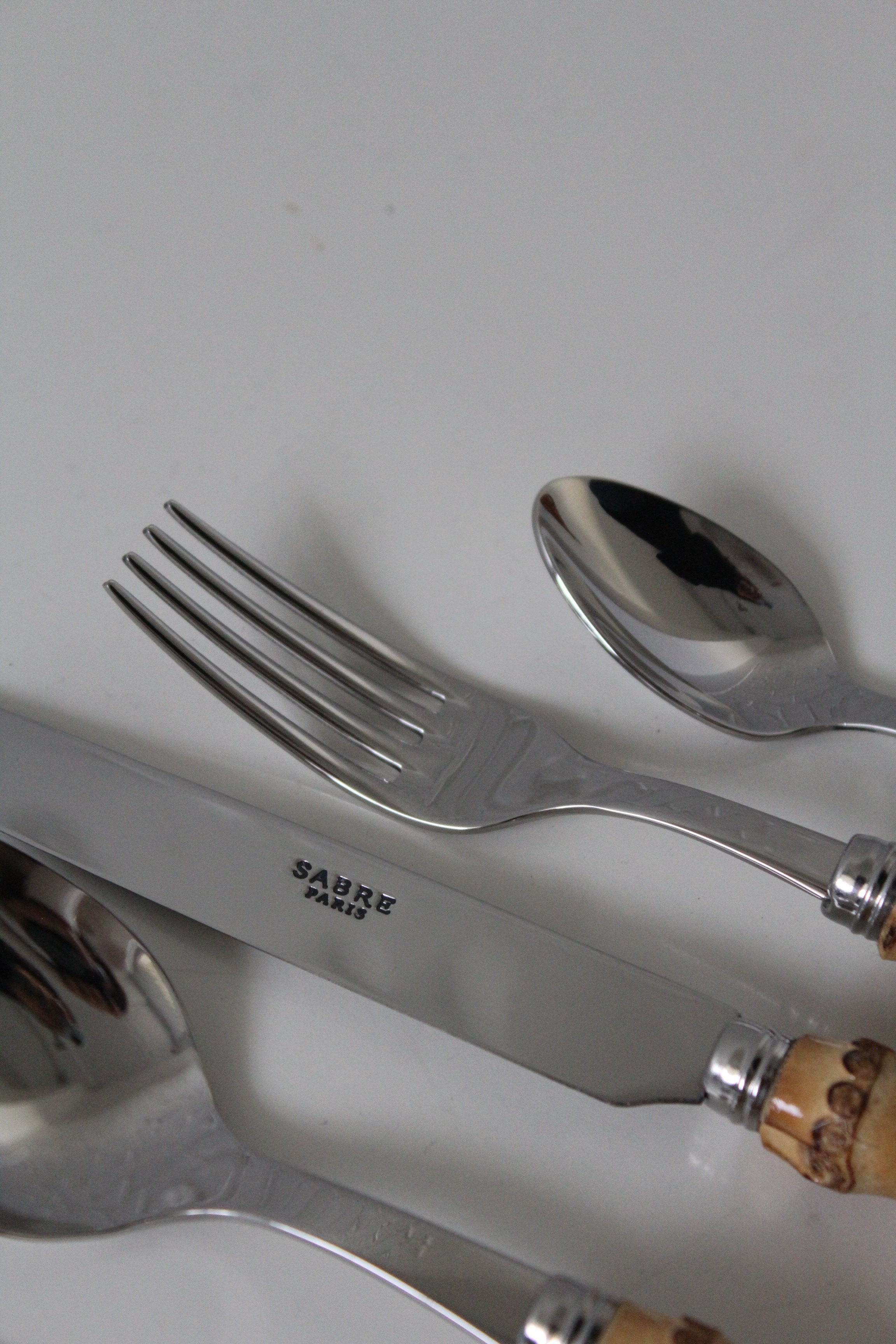Ensemble de coutellerie 5 pièces Bamboo par Sabre Paris. Acier inoxydable à fini brillant et véritable manche en bambou. L’ensemble comprend une cuillère à soupe, une fourchette de table, un couteau de table, une cuillère à dessert et une fourchette à salade.