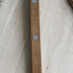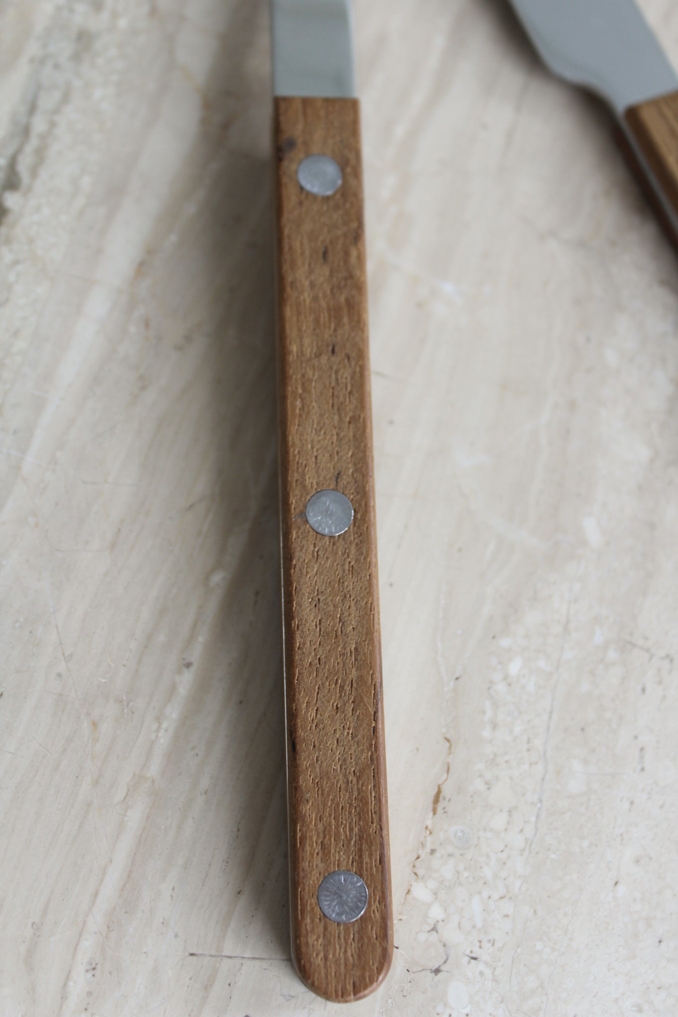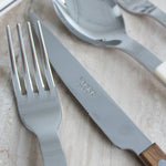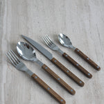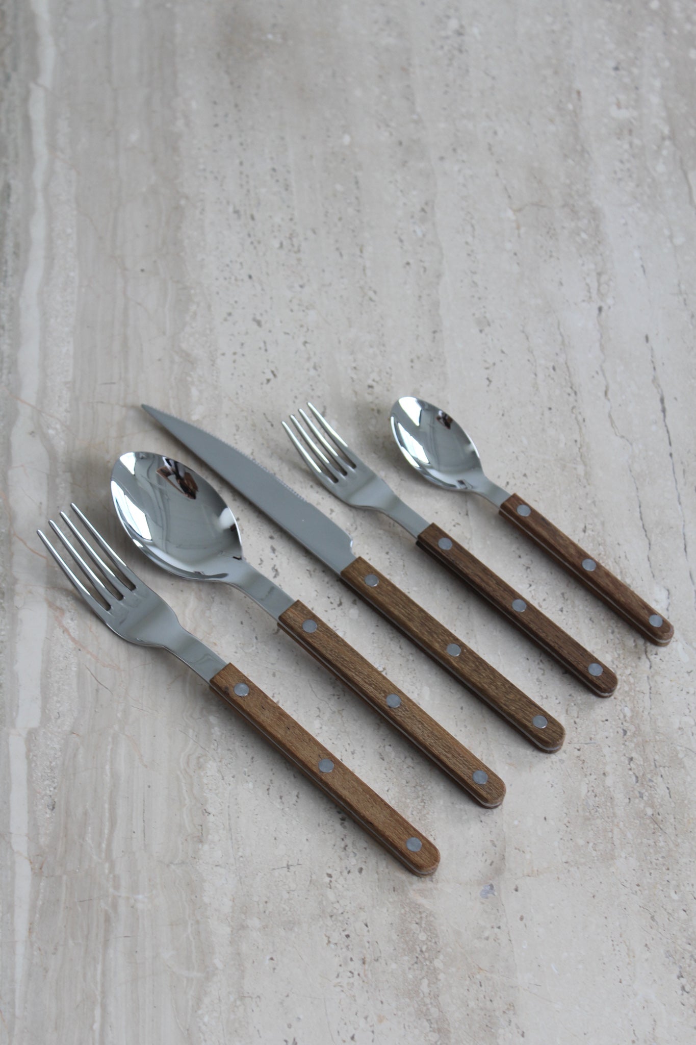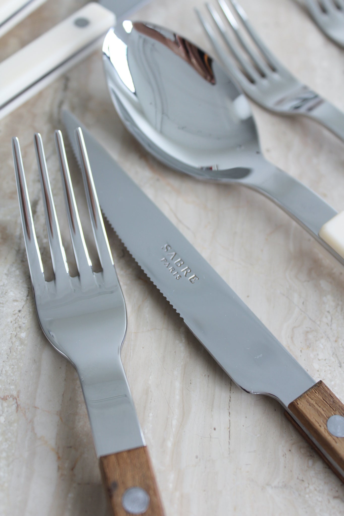 Ensemble de coutellerie 5 pièces par Sabre Paris. Acier inoxydable à fini brillant et manche en bois de teck. L'ensemble comprend une cuillère à soupe, une fourchette de table, un couteau de table, une cuillère à dessert et une fourchette à salade.