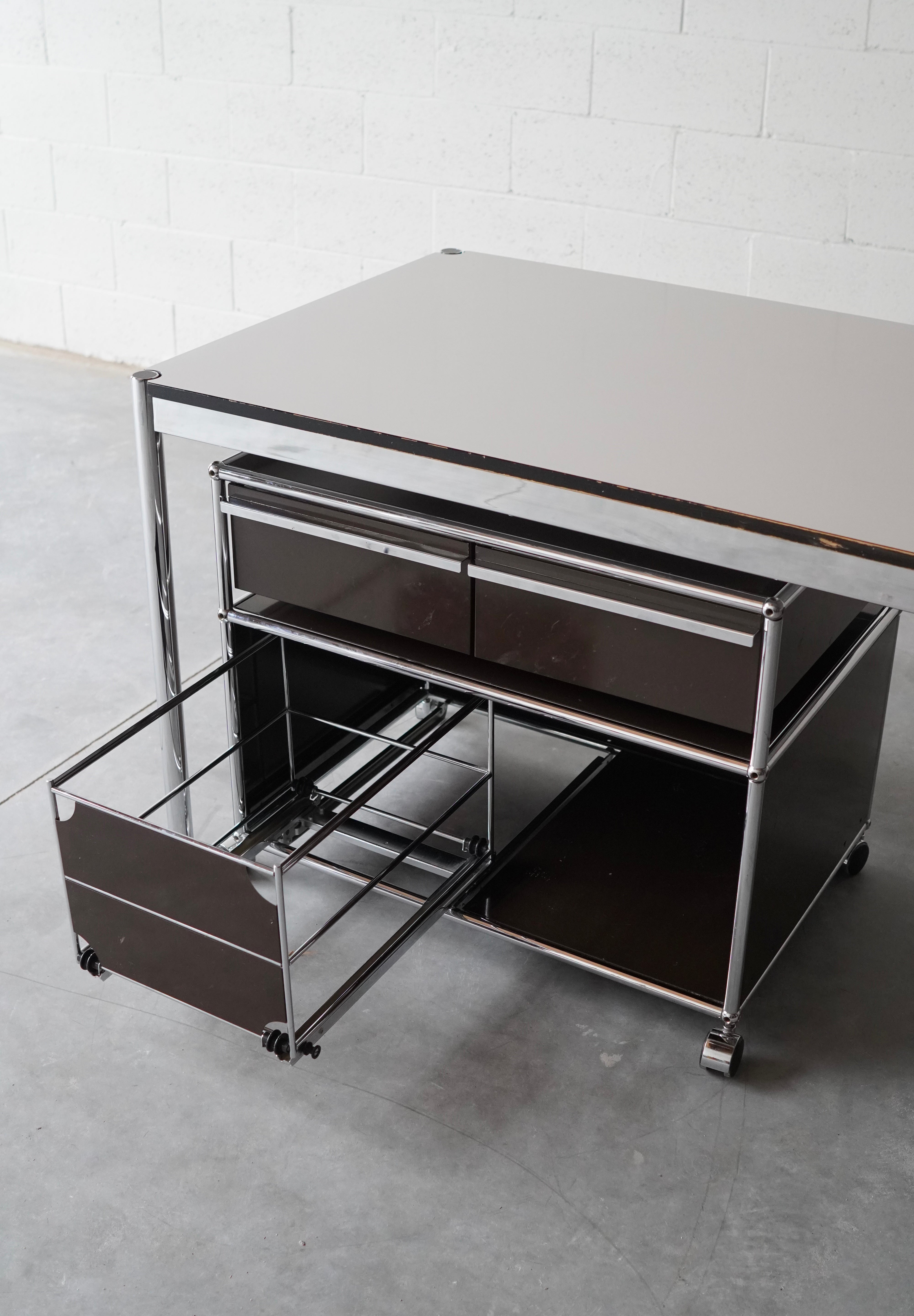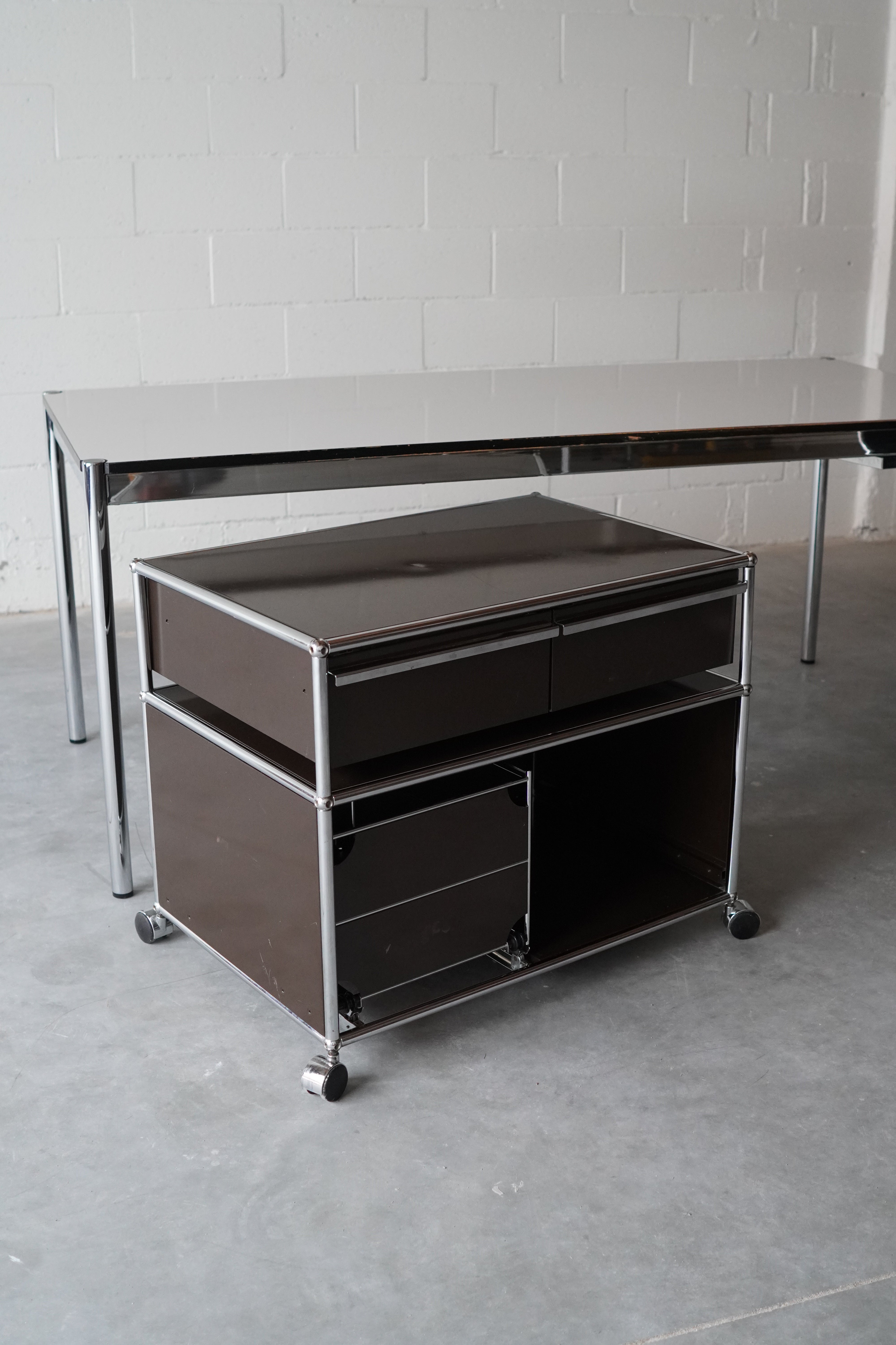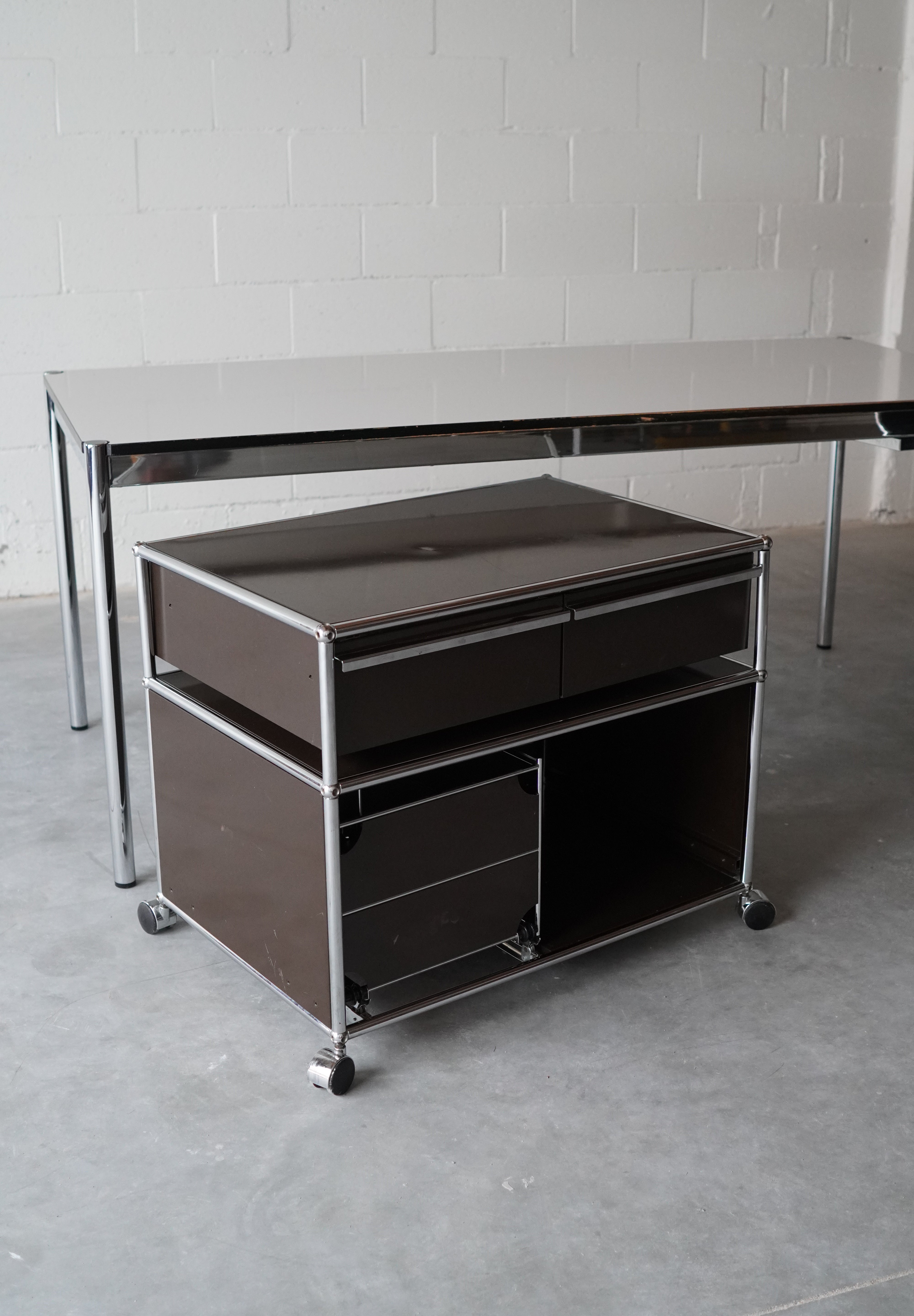 Pedestal Storage Trolley by Fritz Haller for USM Haller, made in Switzerland, 1960s. Composed of three pull-out drawers, one with railing for hanging file folders. Rare brown powder coated steel panels, polished chrome steel tubular framing and castor wheels.