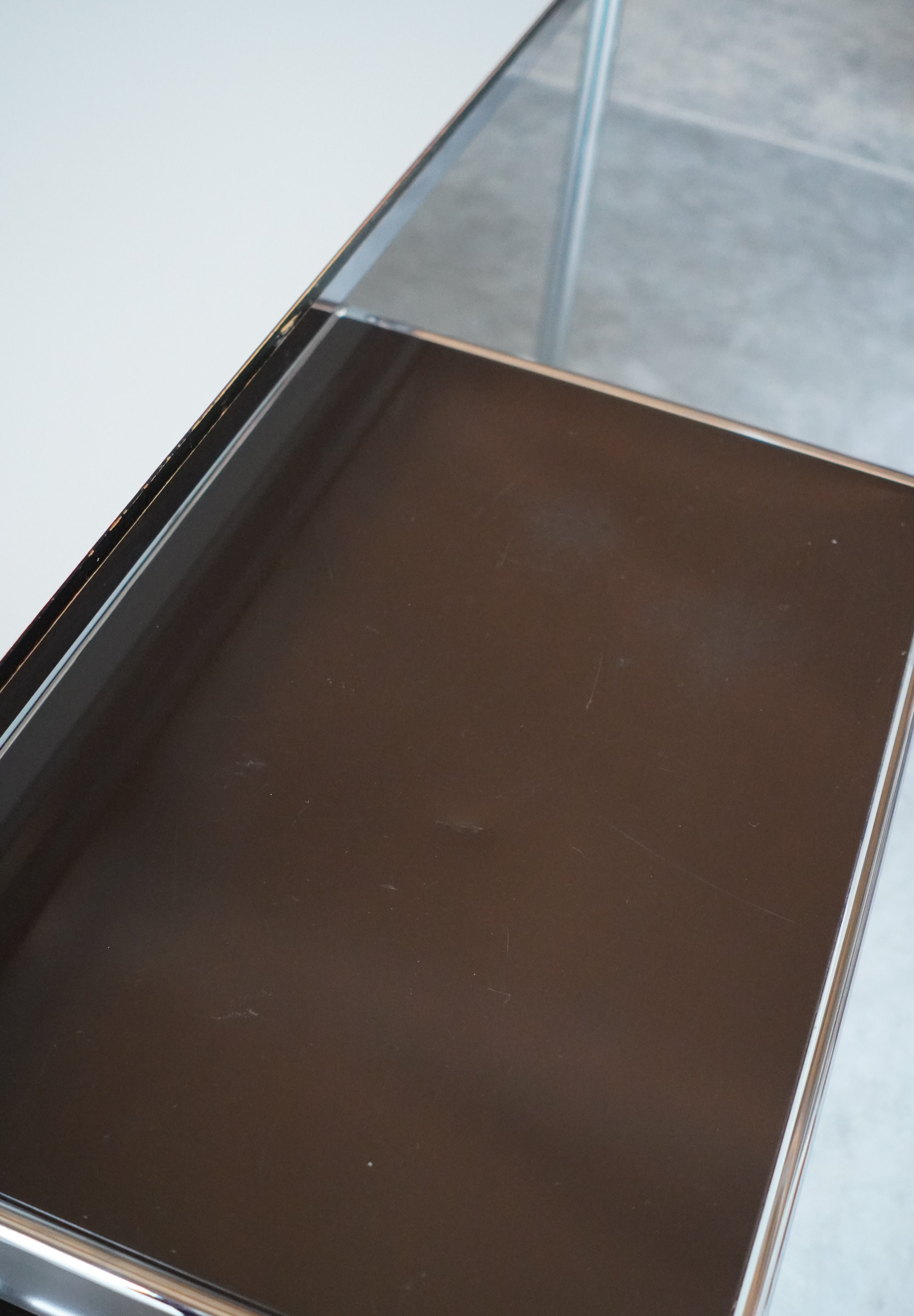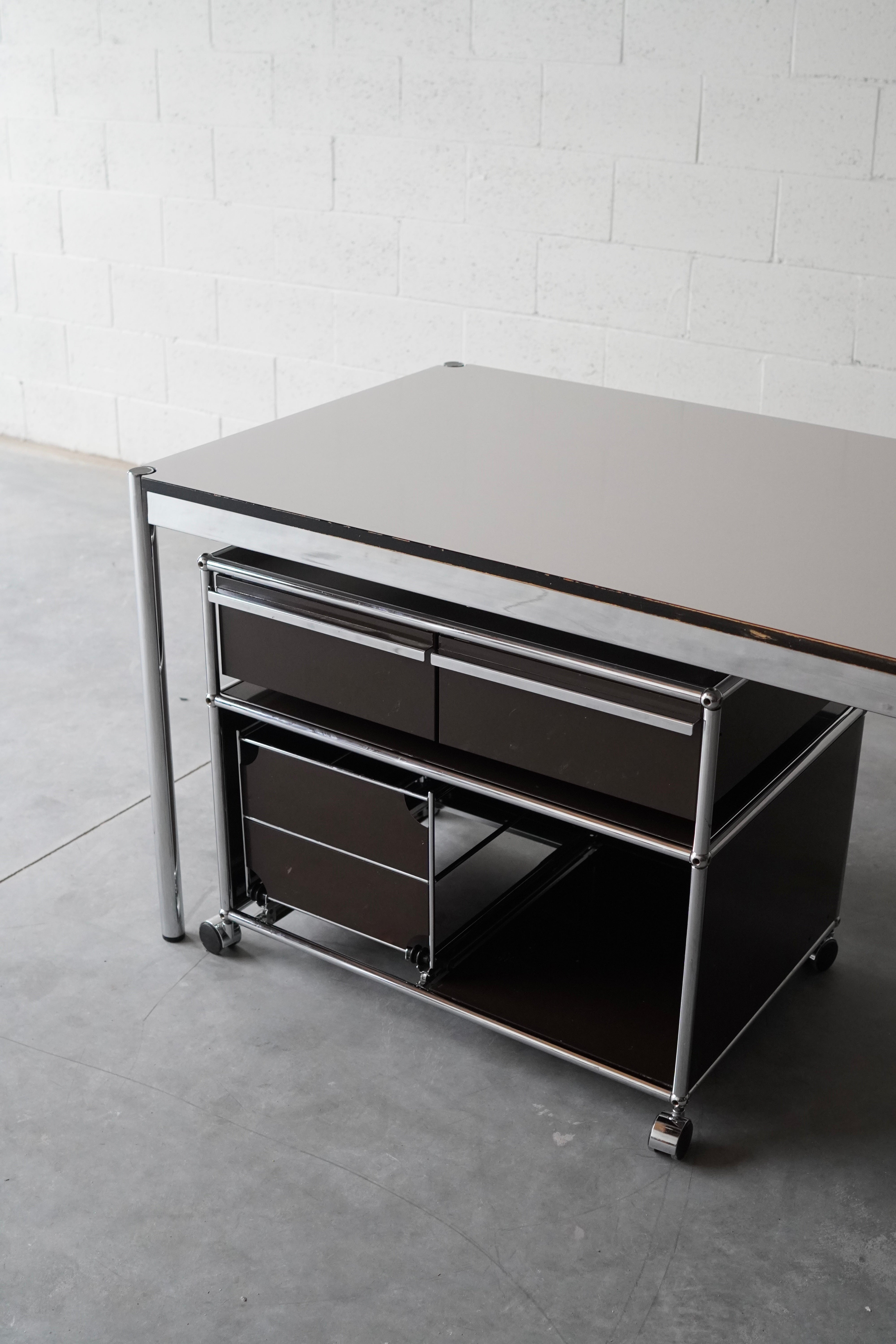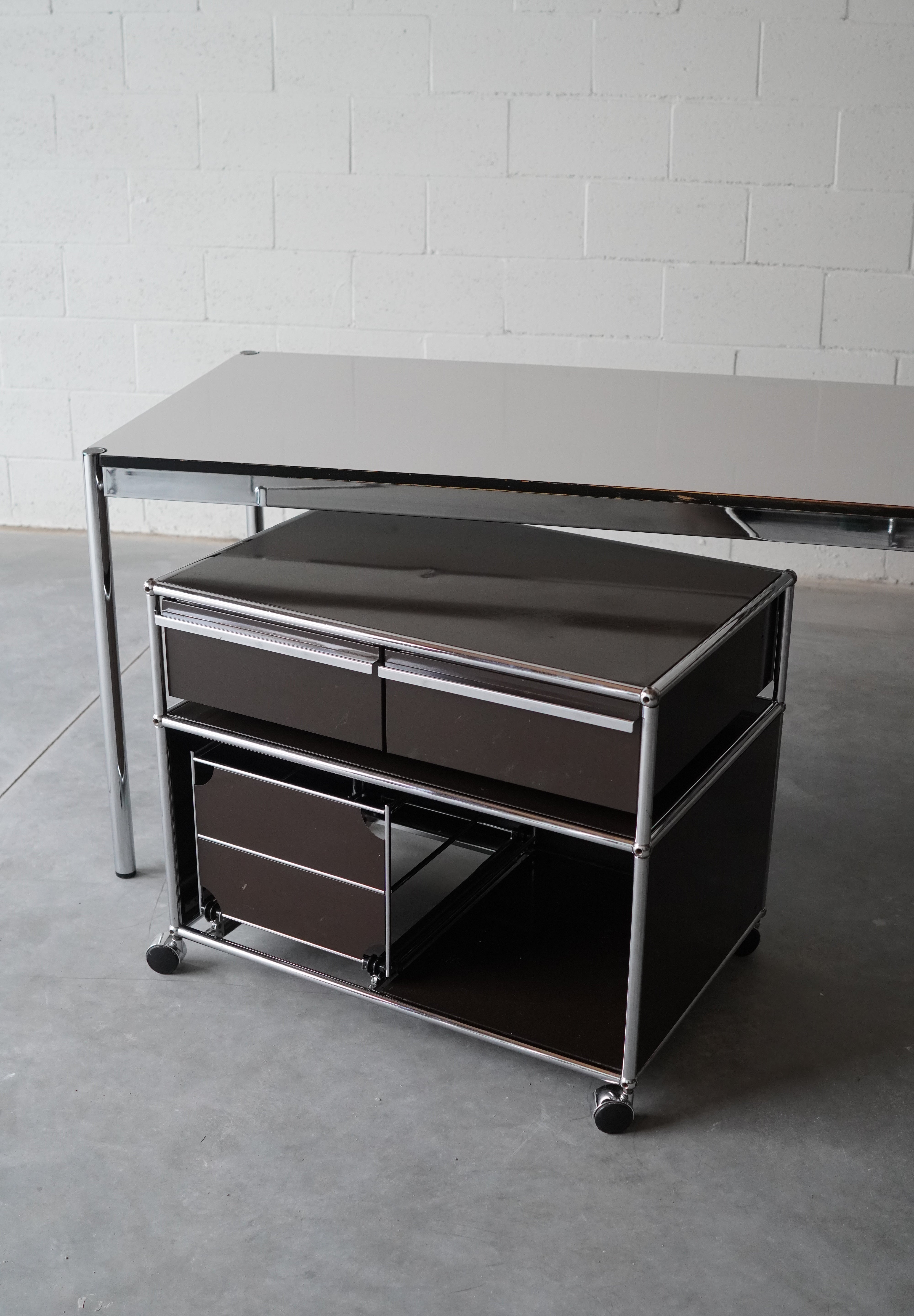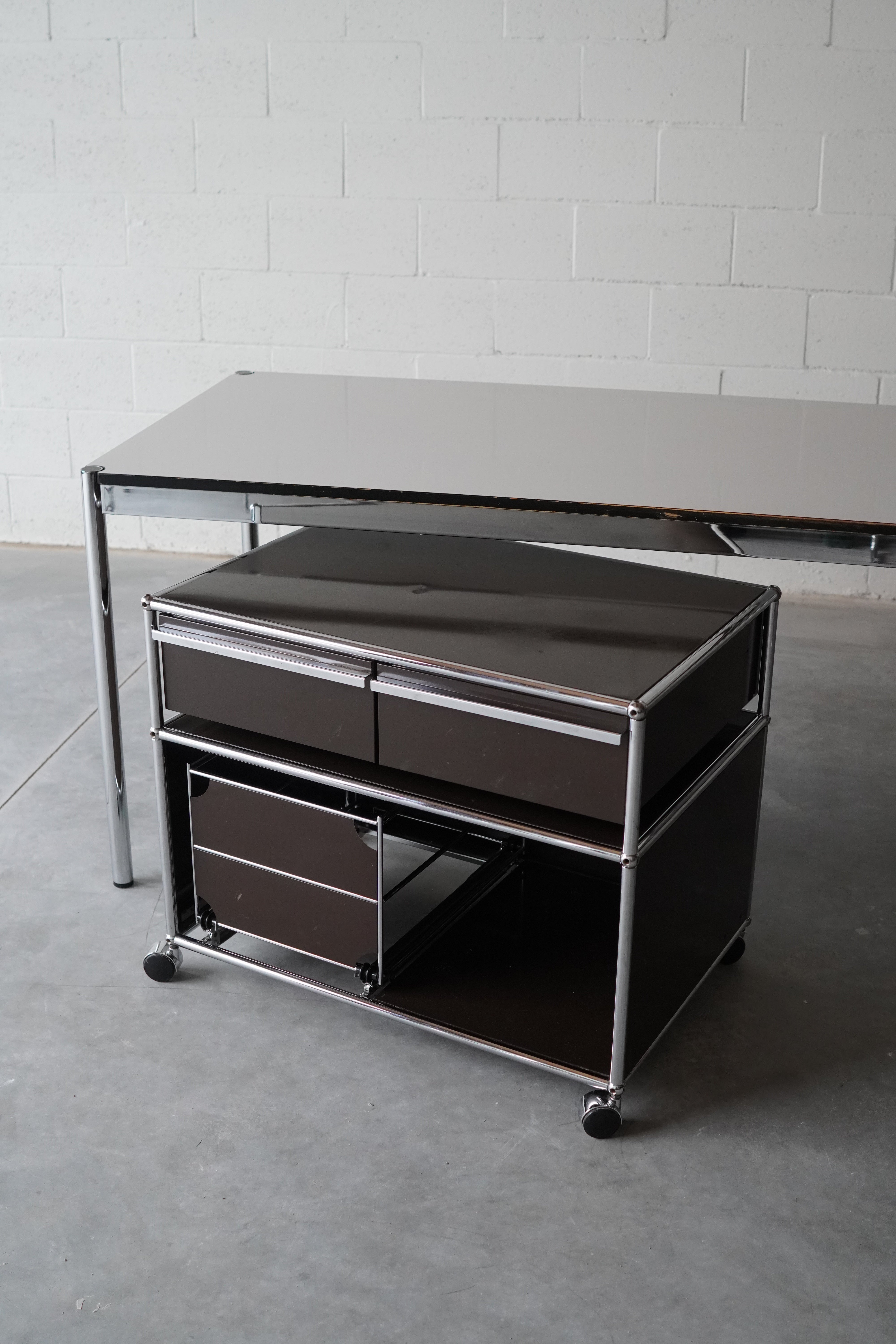 Pedestal Storage Trolley by Fritz Haller for USM Haller, made in Switzerland, 1960s. Composed of three pull-out drawers, one with railing for hanging file folders. Rare brown powder coated steel panels, polished chrome steel tubular framing and castor wheels.