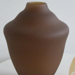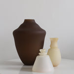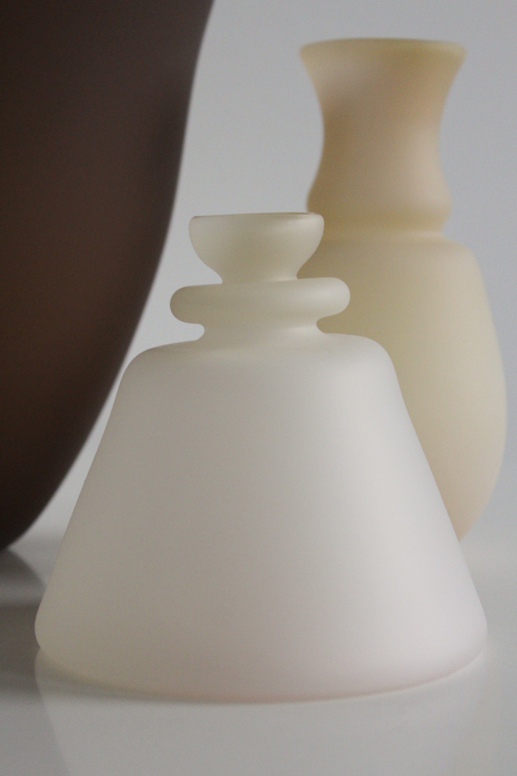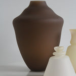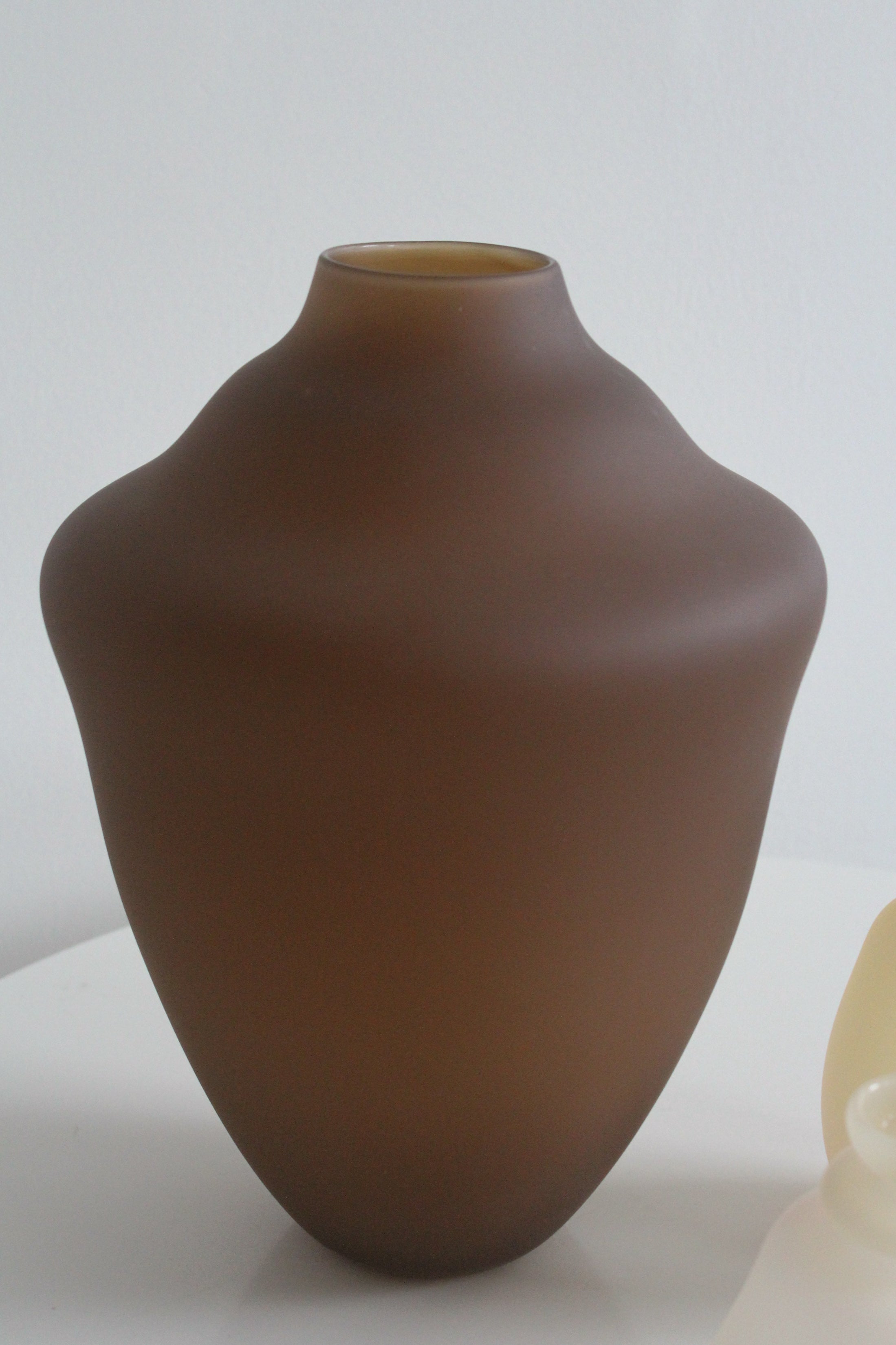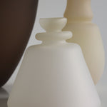 Ensemble de vases en verre soufflé à la main par Verre D’onge. Trois vases dépareillés dans des tons de brun, beige et crème. Exclusif à Le Centerpiece.