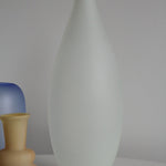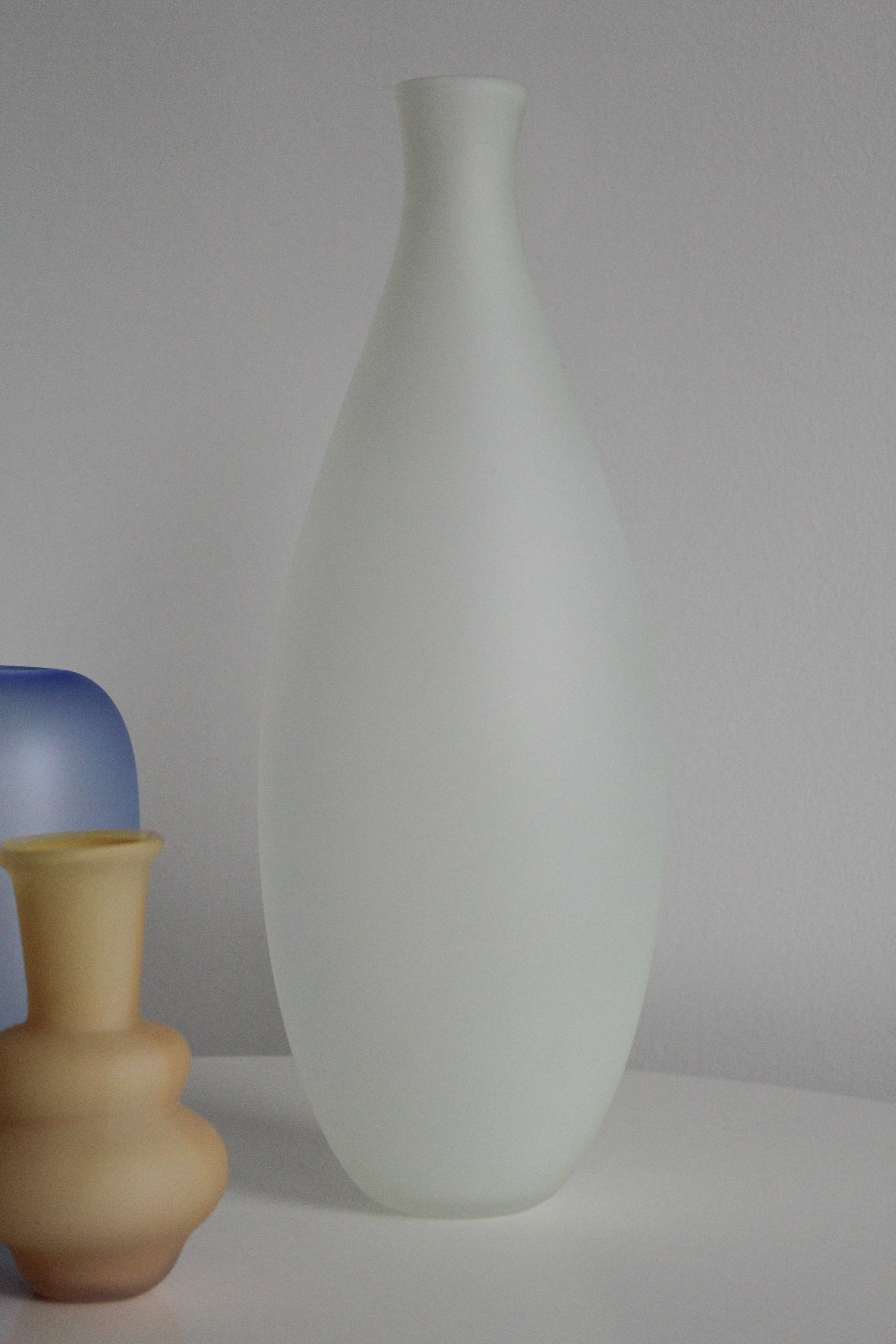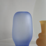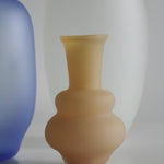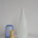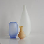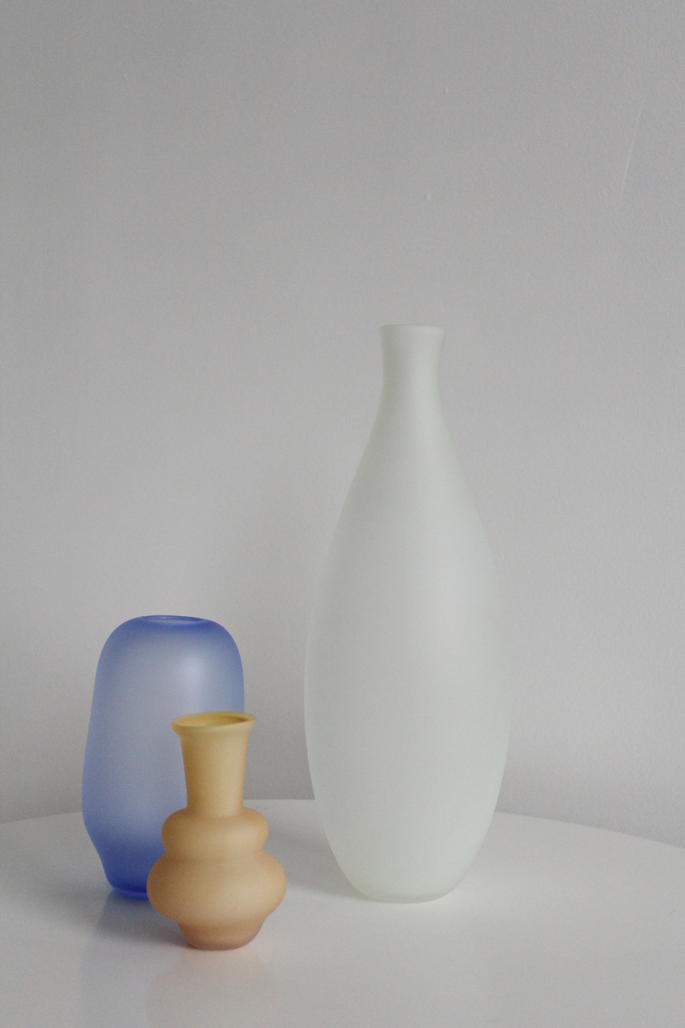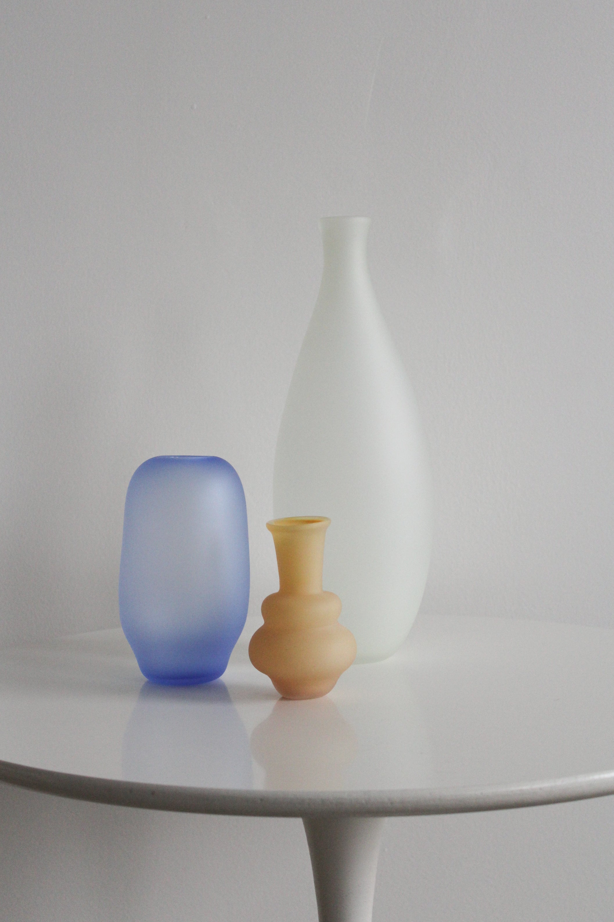 Ensemble de vases en verre soufflé à la main par Verre D’onge. Trois vases dépareillés dans des tons de blanc, caramel et bleu. Exclusif à Le Centerpiece.