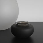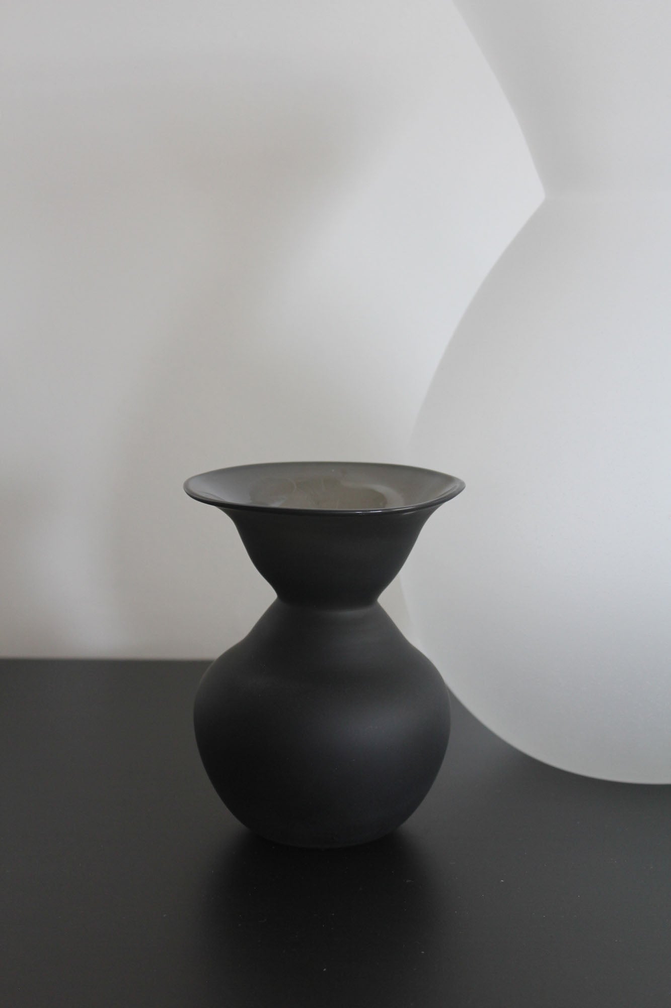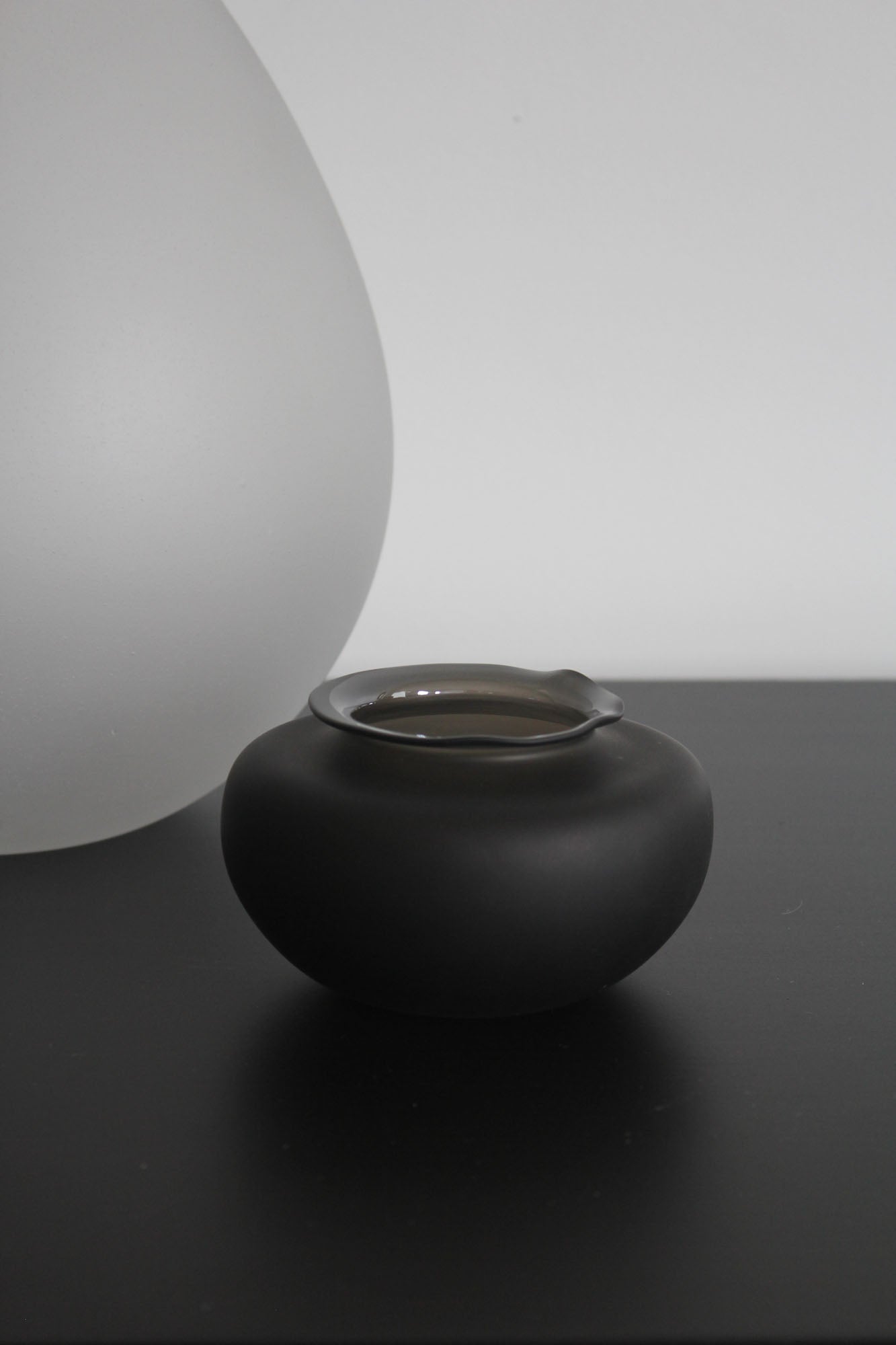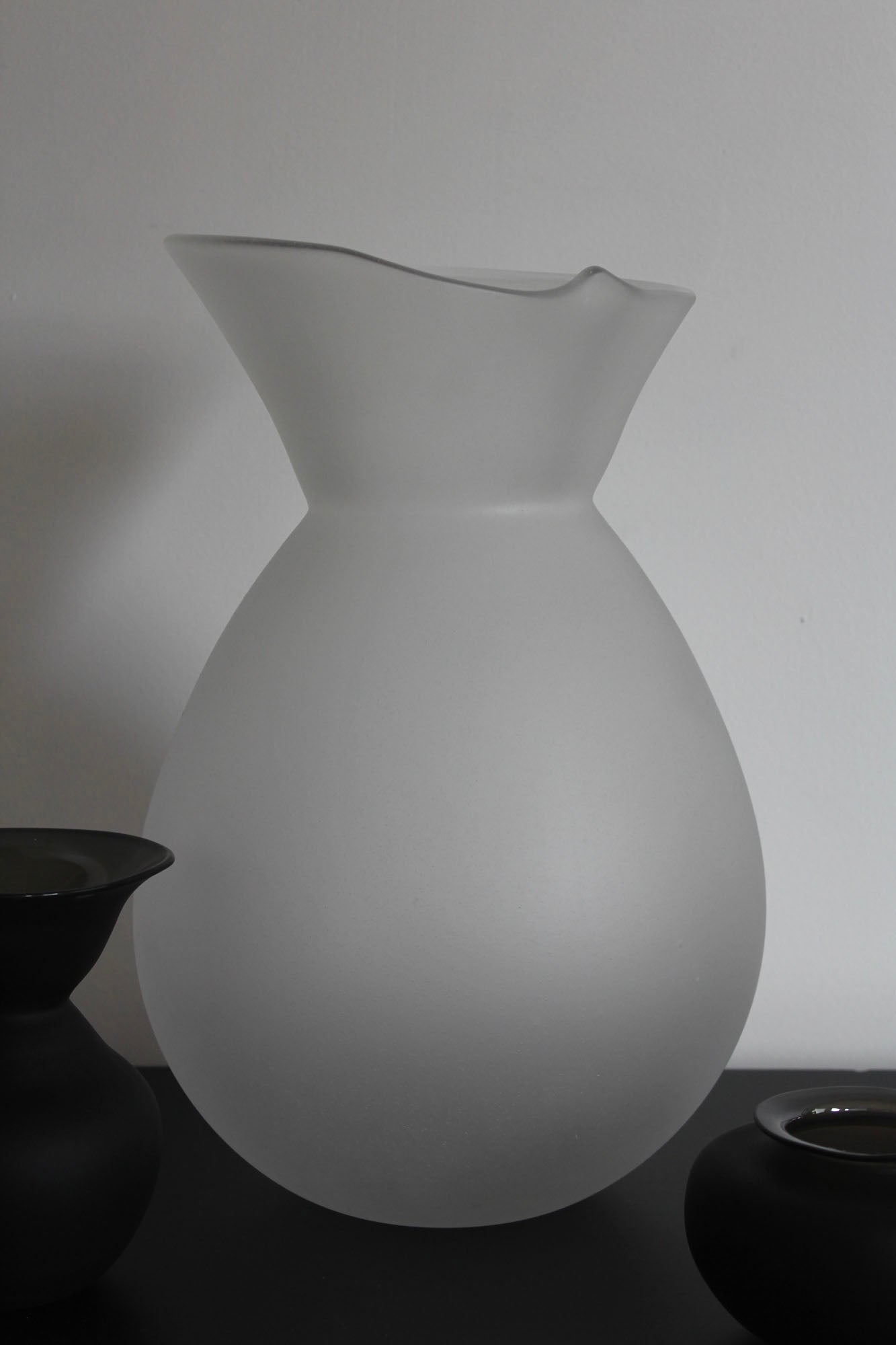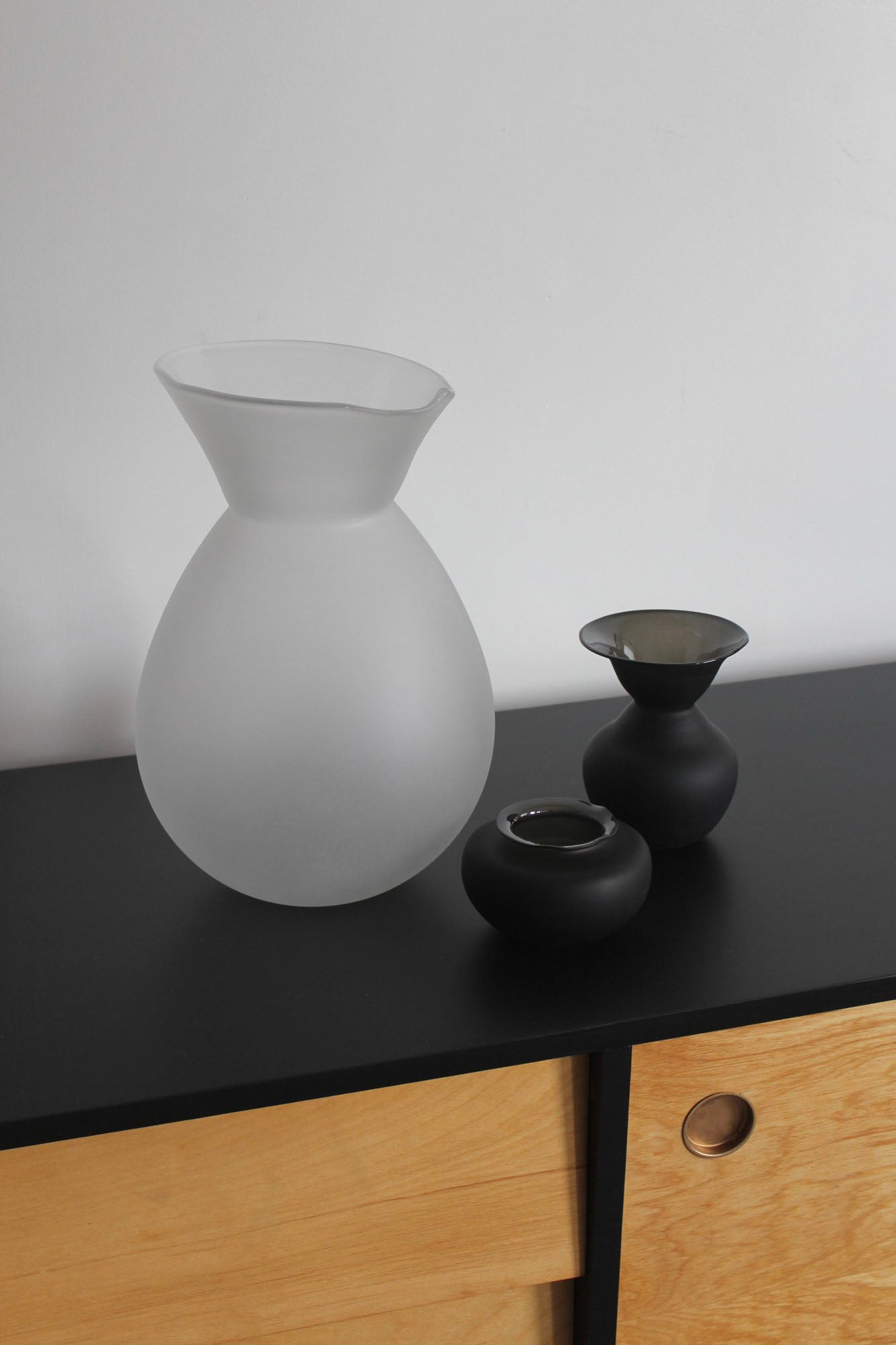 Ensemble de vases en verre soufflé à la main par Verre D’Onge. Trois vases dépareillés dans des tons de blanc et noir. Exclusif à Le Centerpiece.
