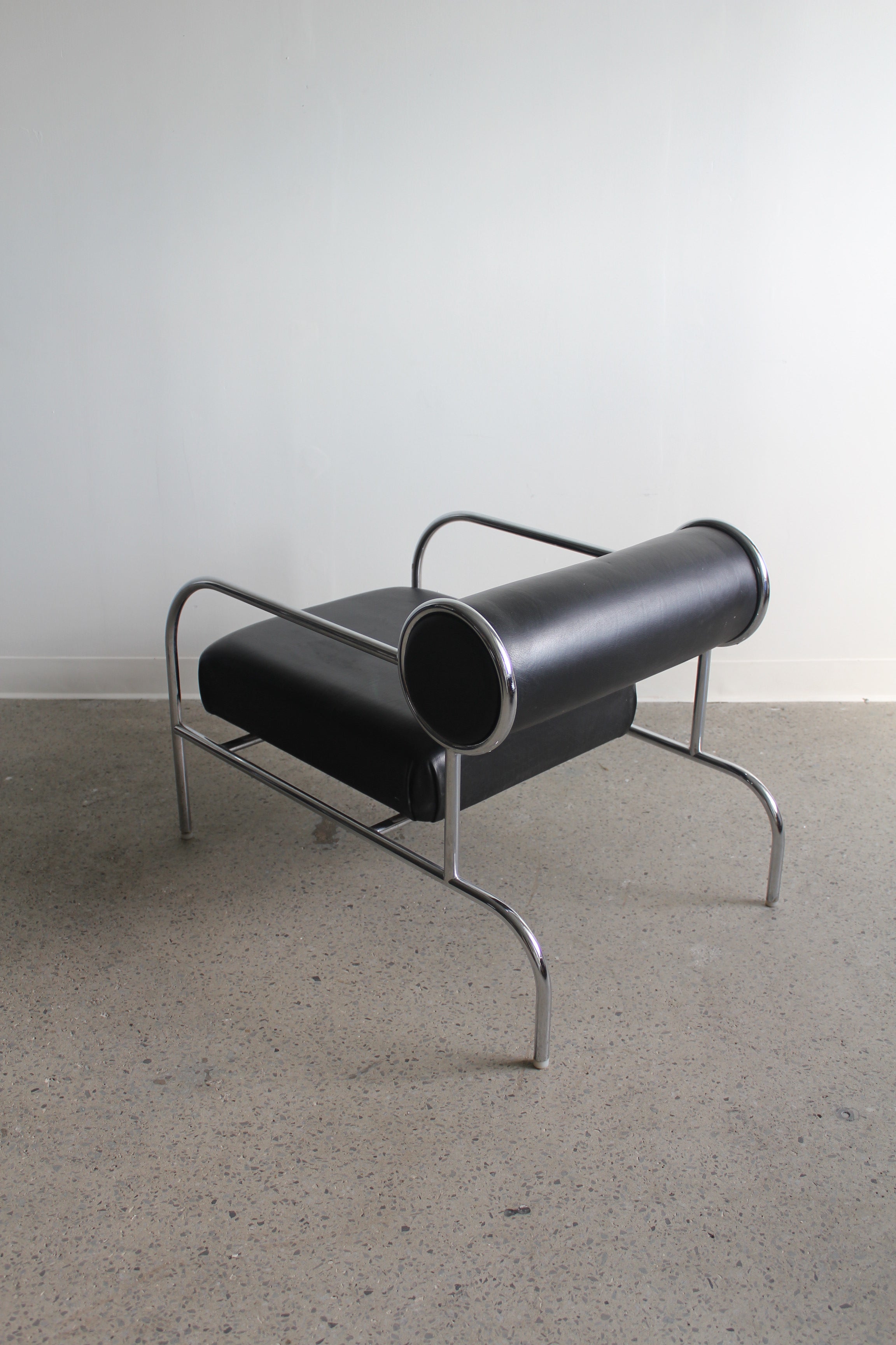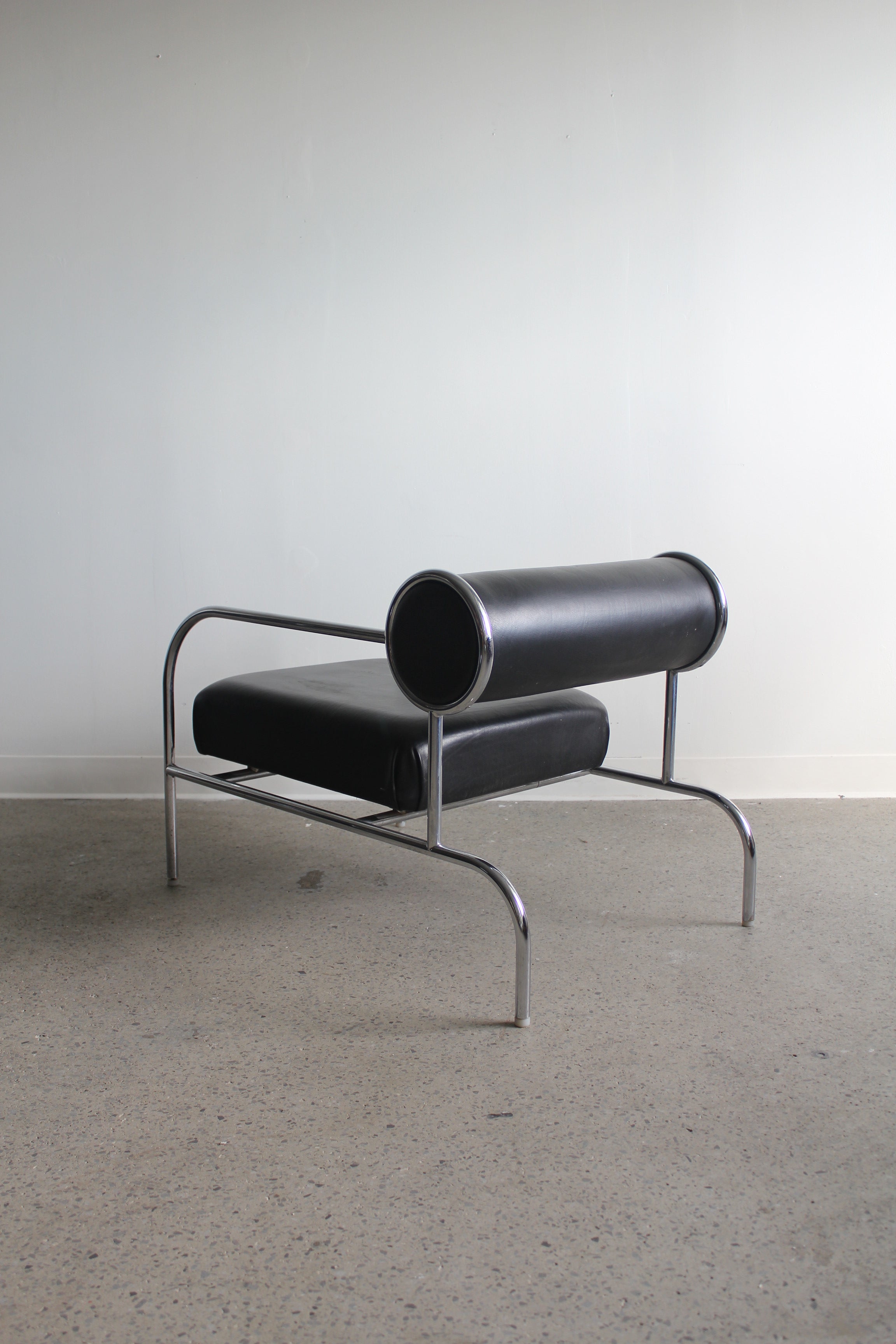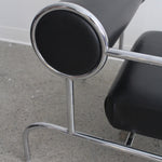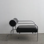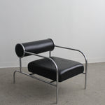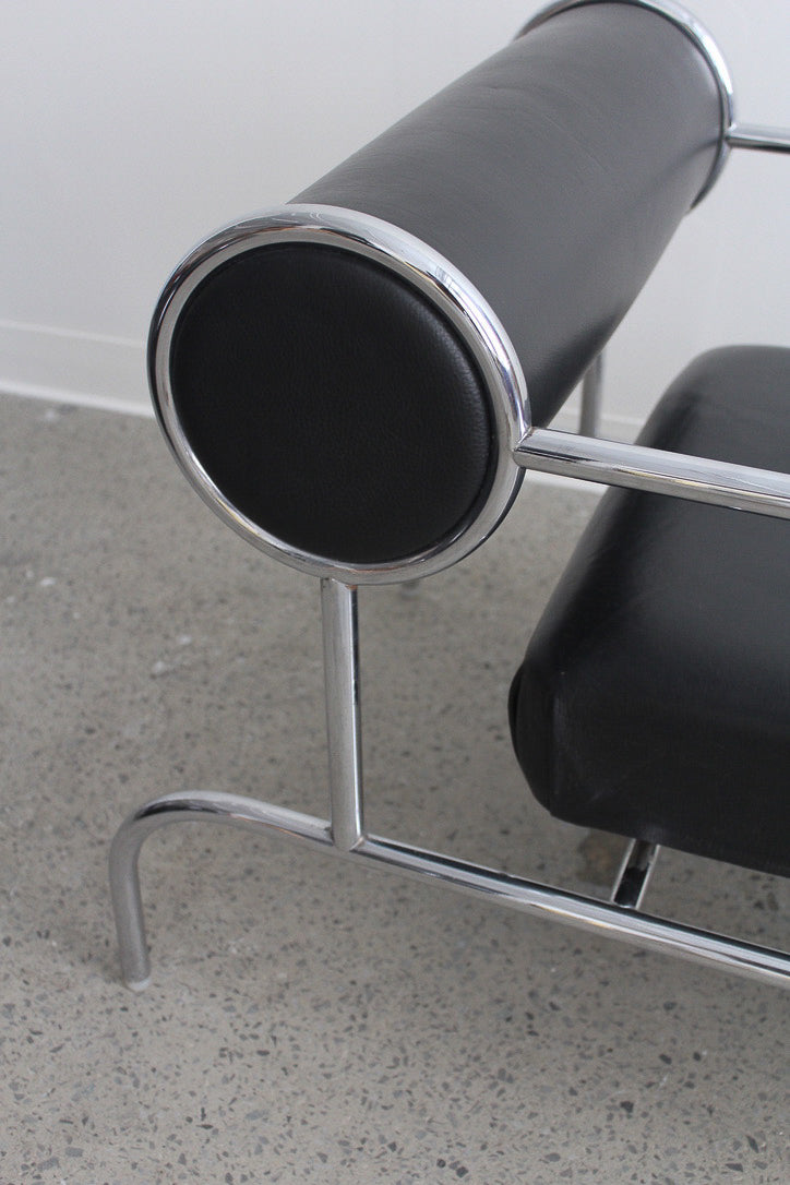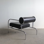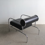 Fauteuil Sofa with Arms par Shiro Kuramata pour Cappellini, années 1980. Structure tubulaire en métal chromé avec assise en cuir noir et coussin de dossier roulé.