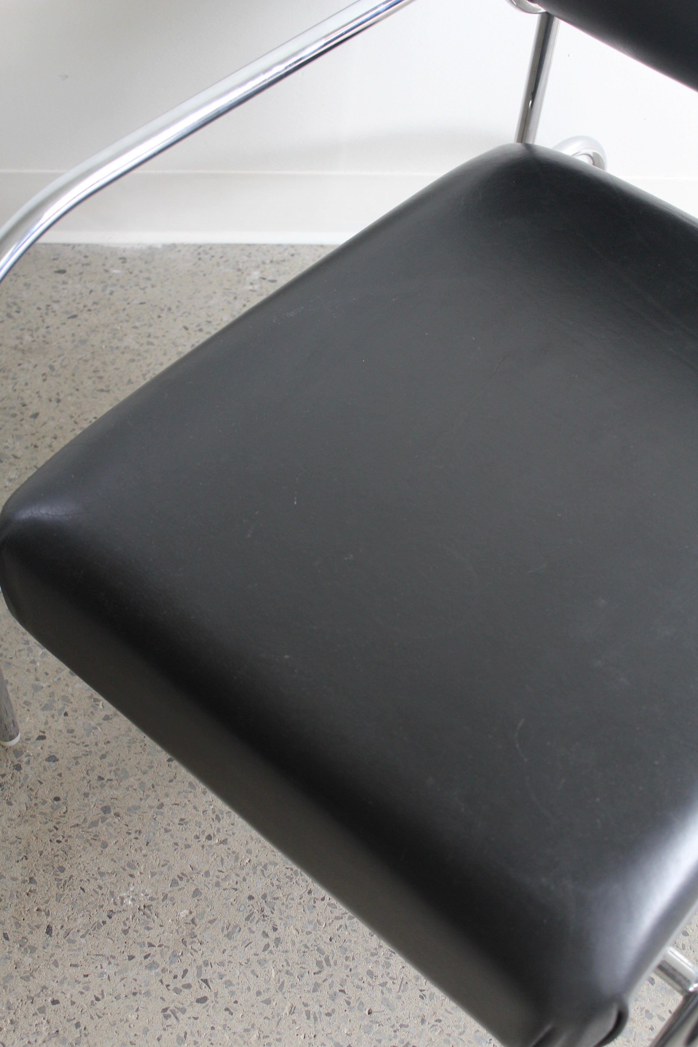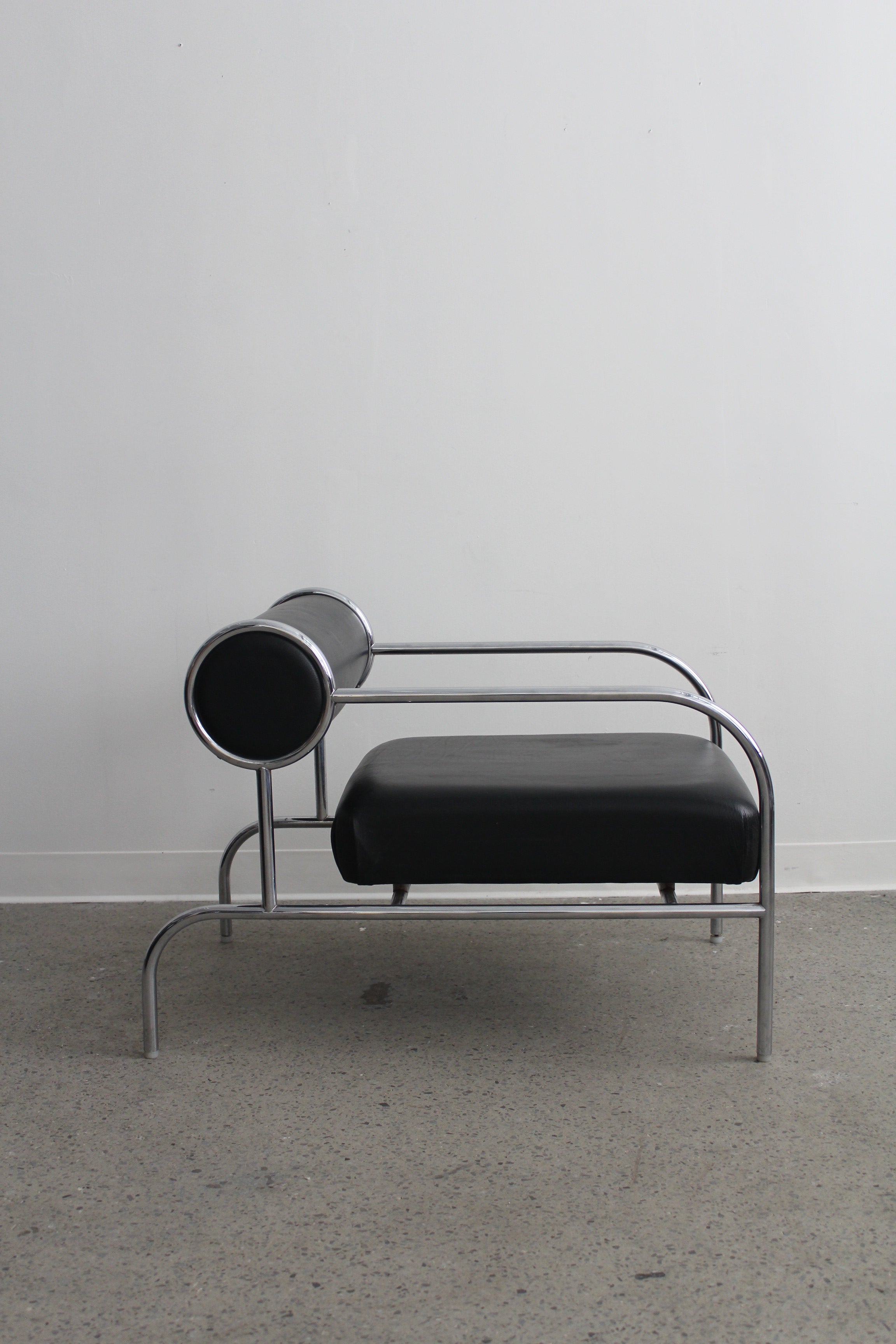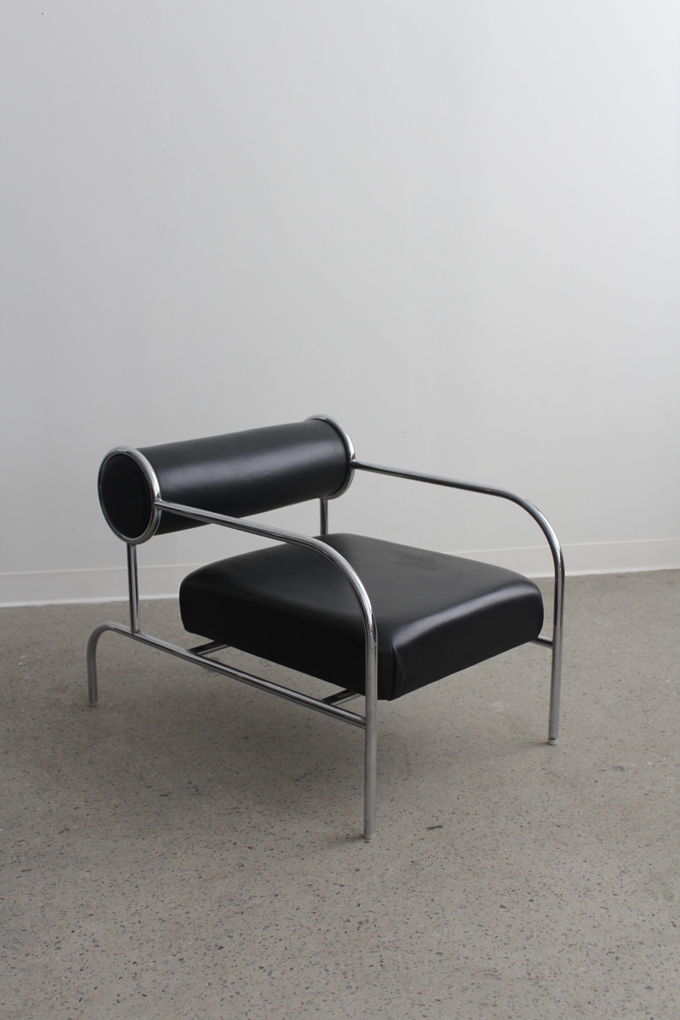 Fauteuil Sofa with Arms par Shiro Kuramata pour Cappellini, années 1980. Structure tubulaire en métal chromé avec assise en cuir noir et coussin de dossier roulé.
