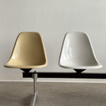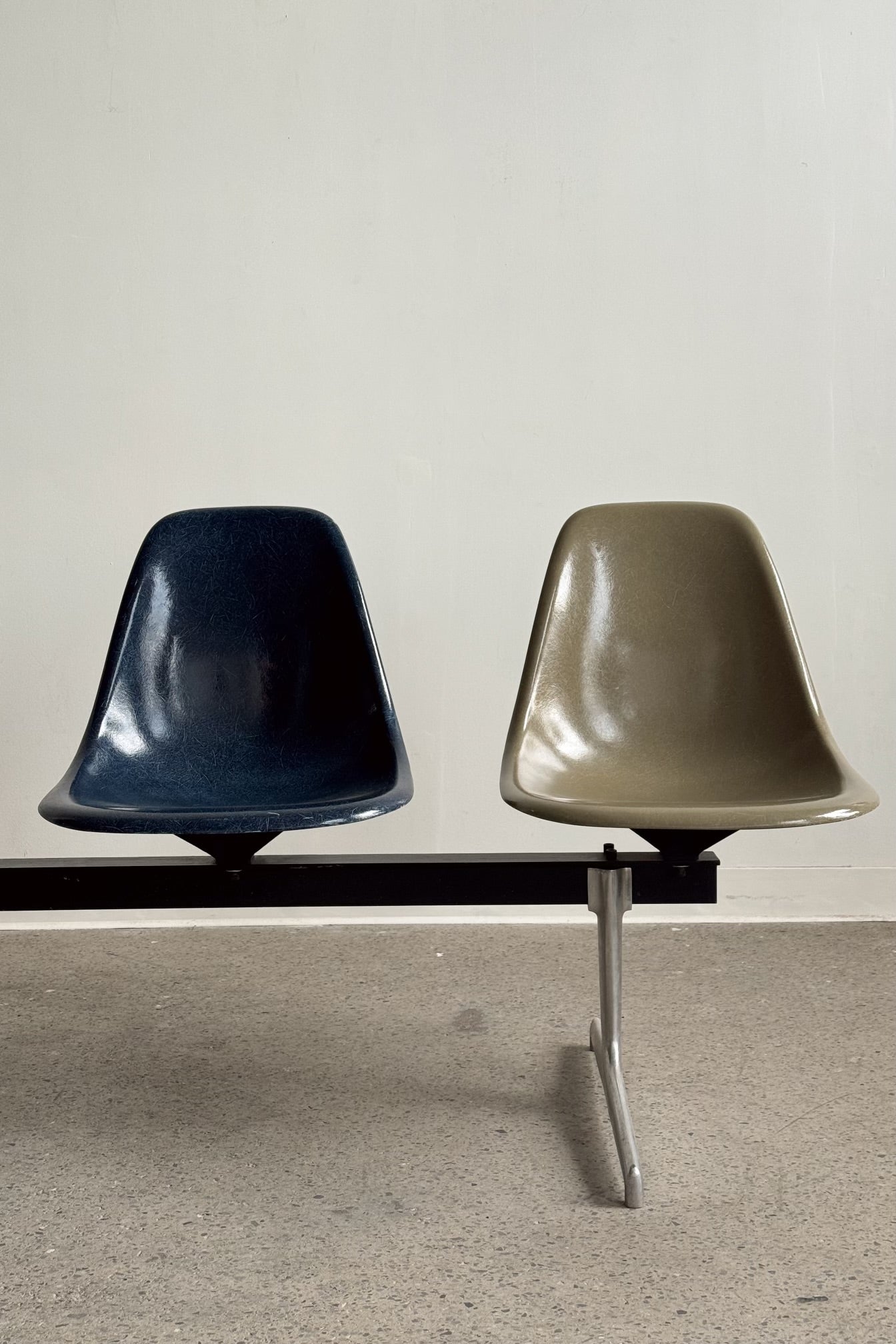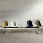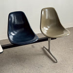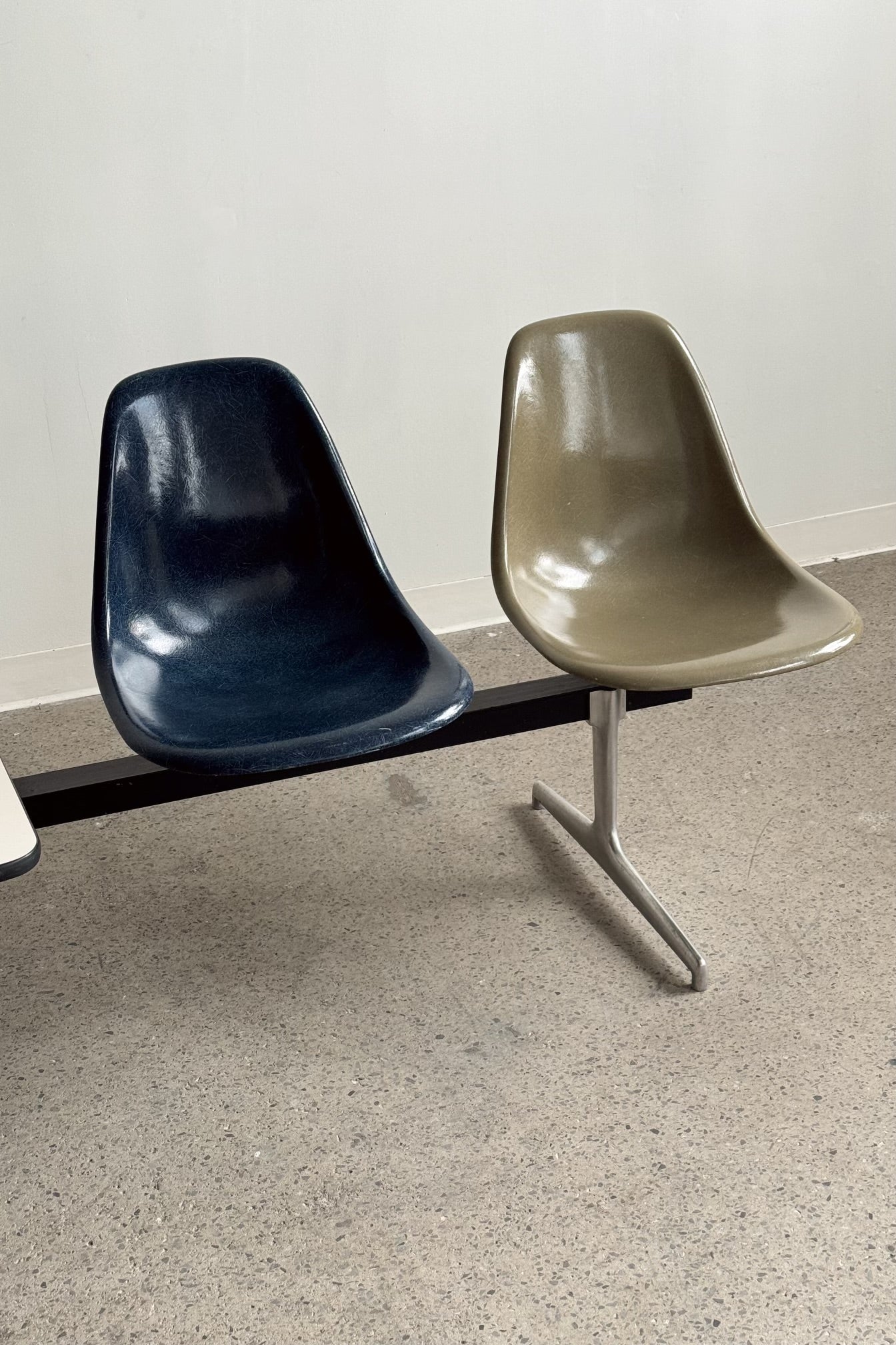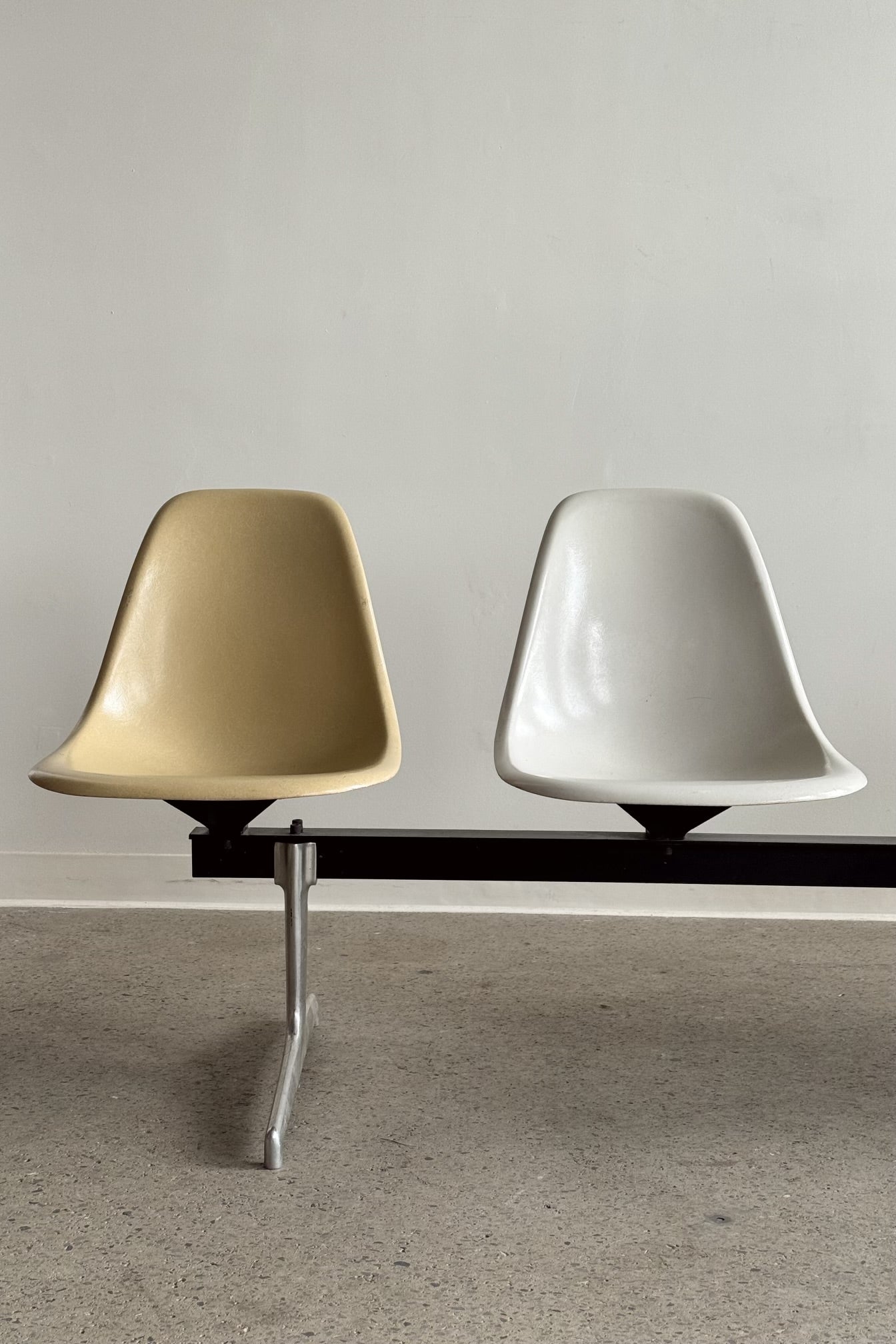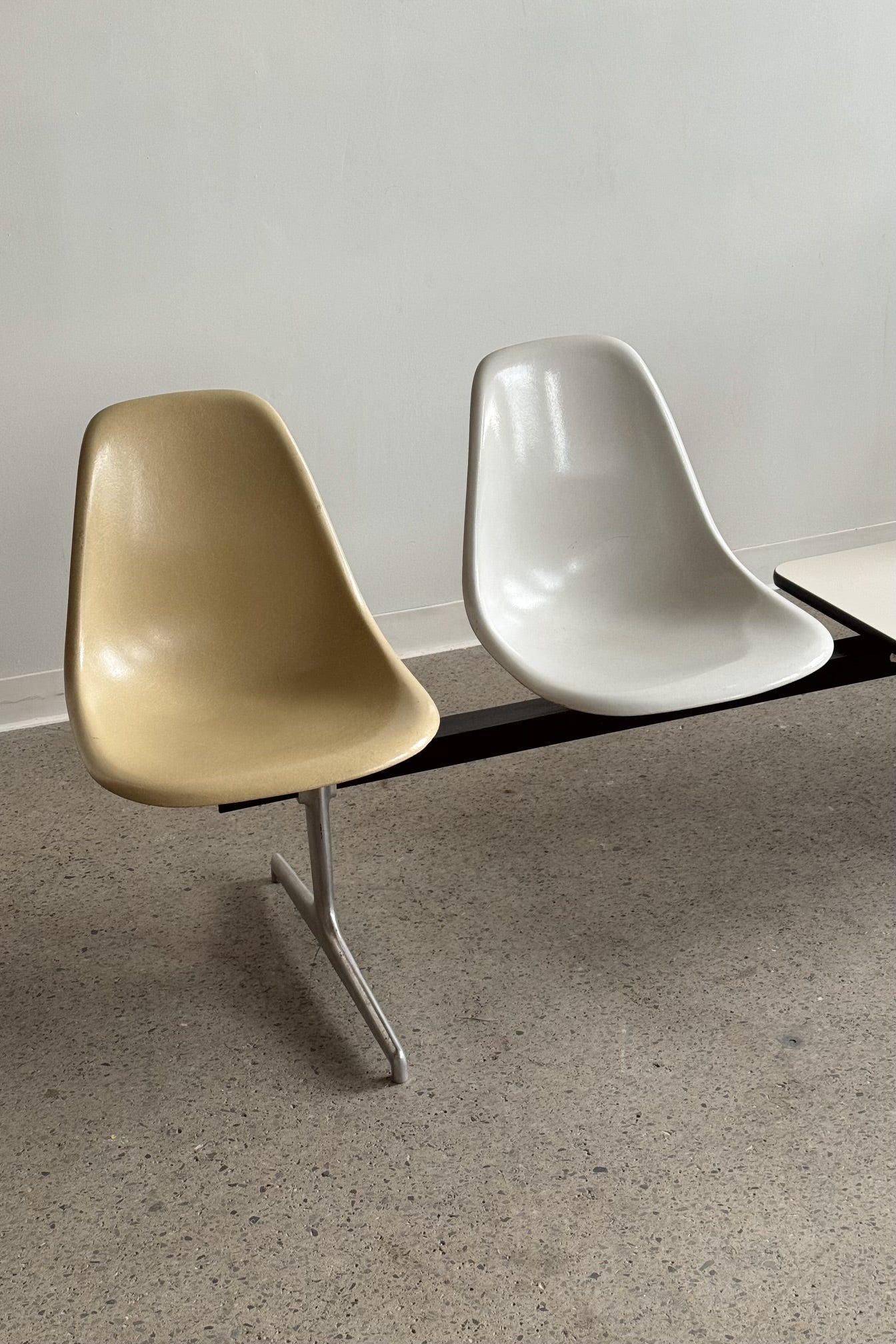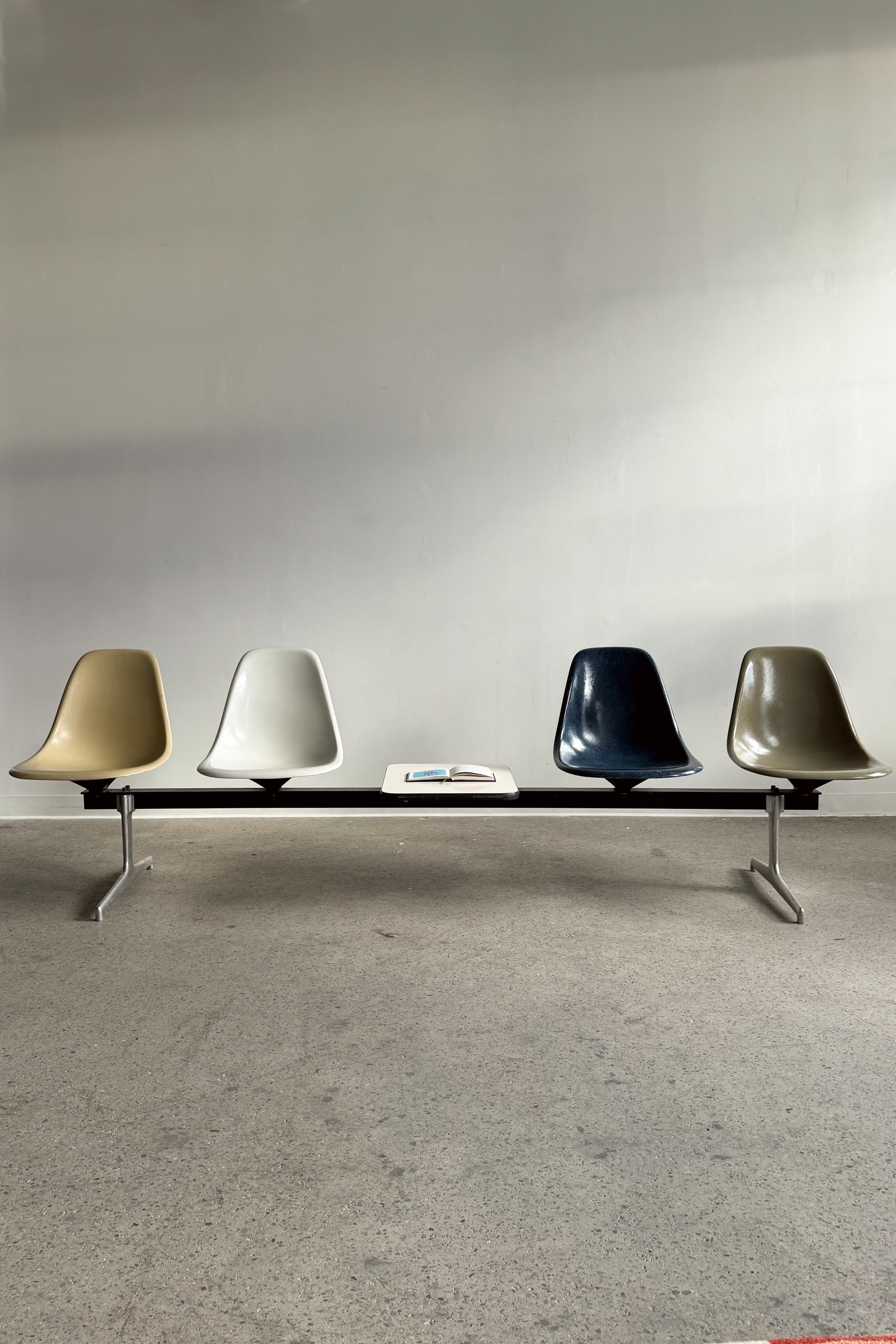 Banc Tandem avec table par Charles et Ray Eames pour Herman Miller, années 1950. Base et pieds en aluminium, 4 coques en fibre de verre de couleurs différentes et petite table latérale. Couleurs des coques : caramel (butter), blanc, bleu marine et gris.